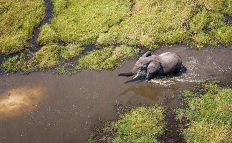 Wait patiently in a sunken hide, at eye-level with the enormous feet of one of Mababe’s elephants.