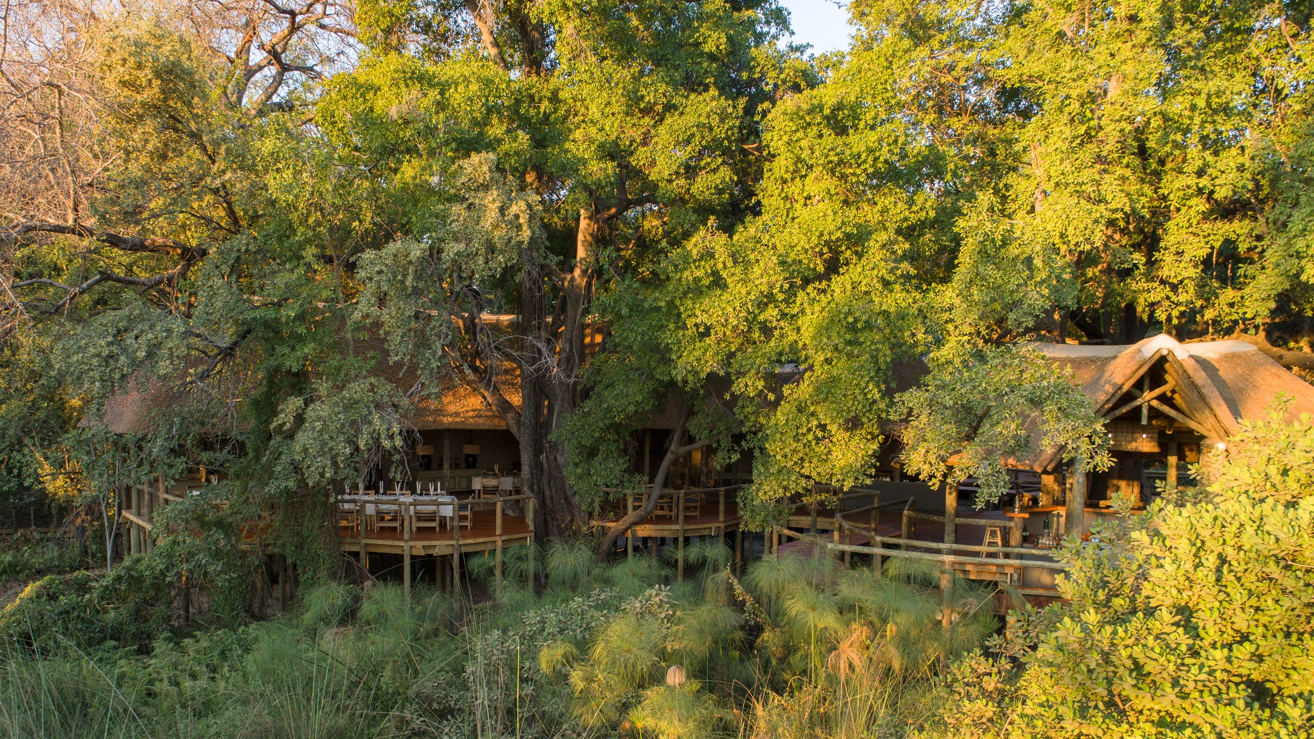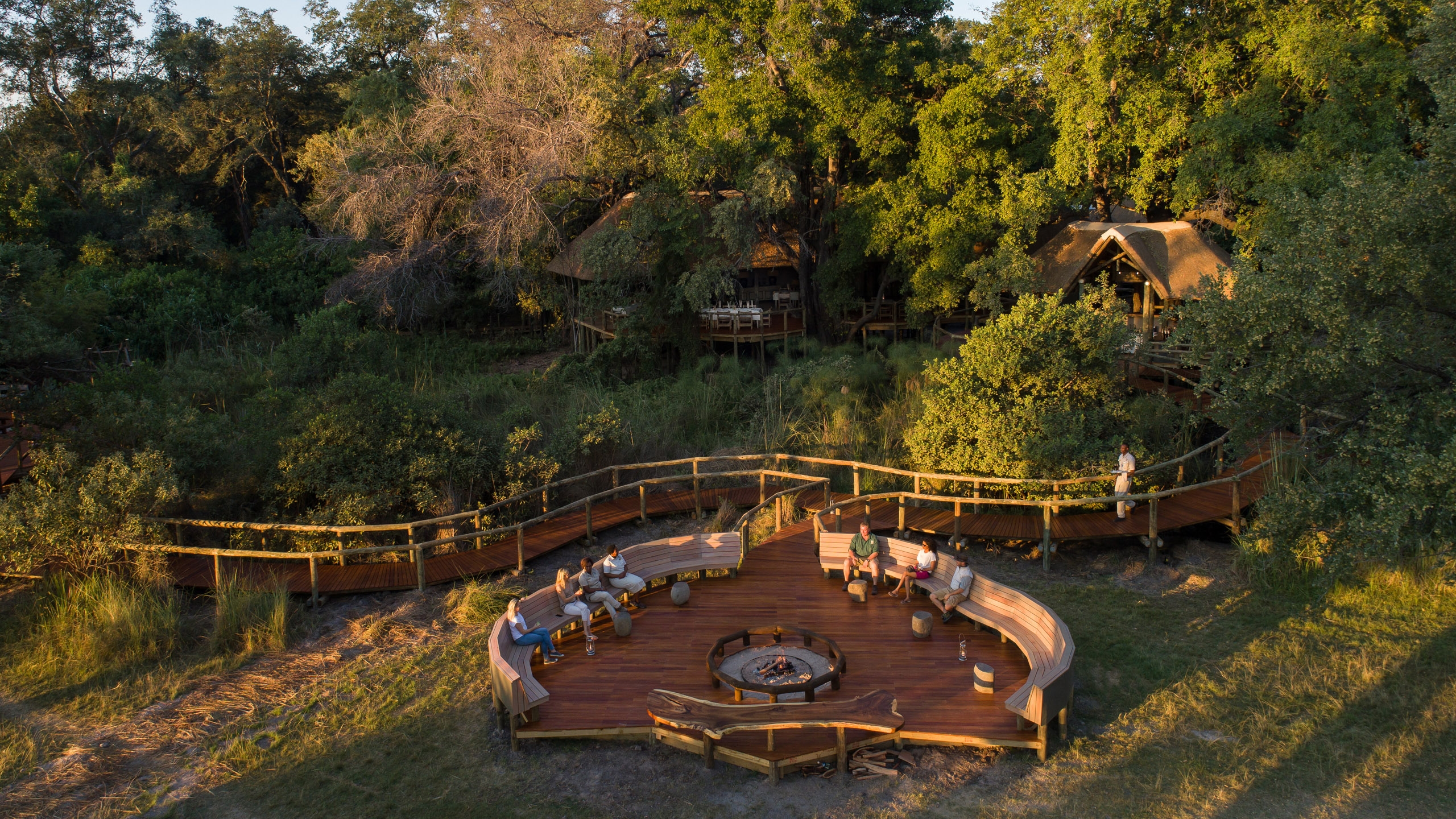 In between game drives, guests can relax around the sunken bar, built around a large termite mound and ebony tree, or in the expansive lounge area which leads towards a library and the decking. These areas, as well as the elevated dining area, are connected by boardwalk to the fireplace in front of the camp. The camp also features an open air boma and swimming pool.