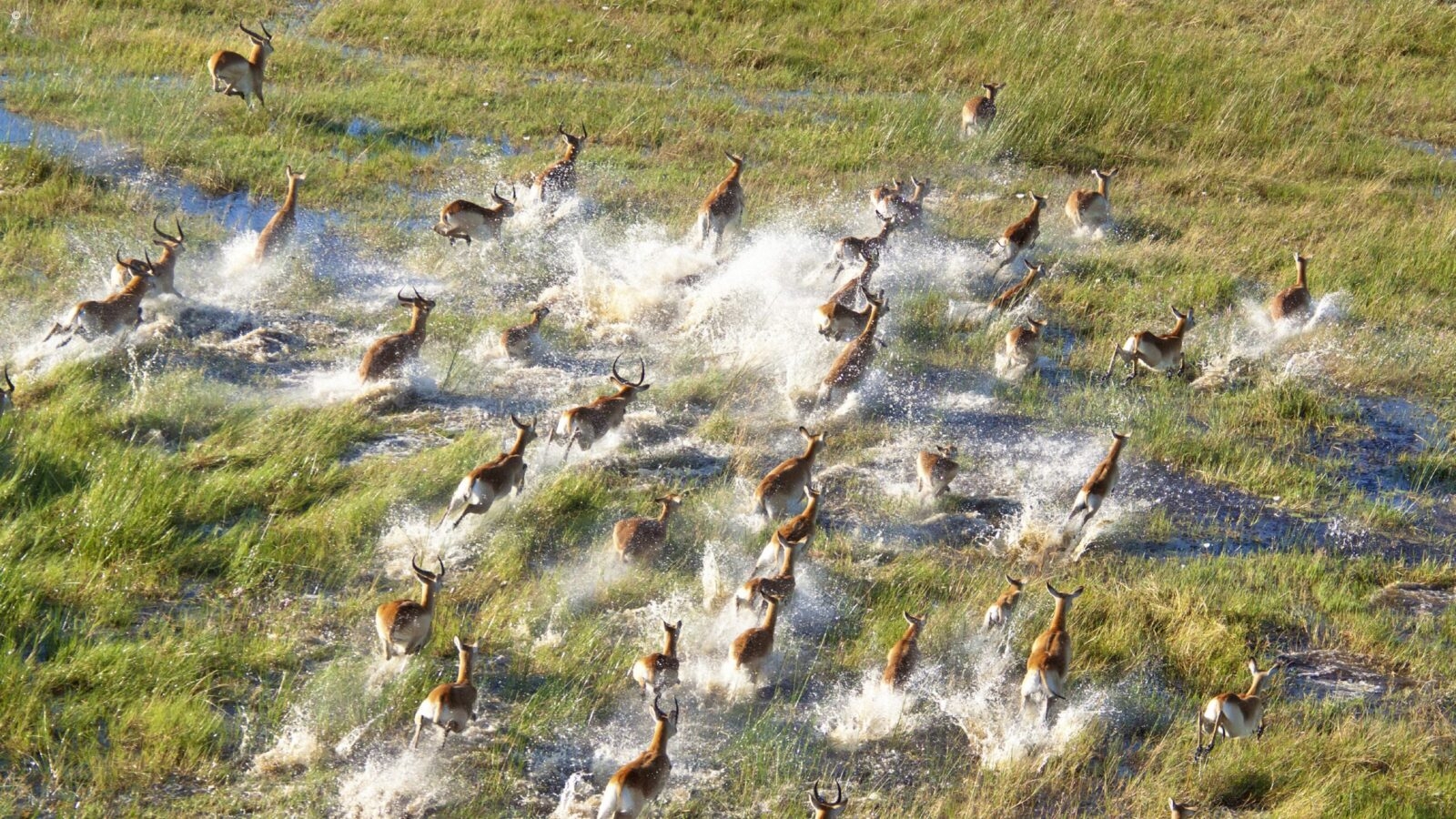 One of nature’s great spectacles, the flooding of the Delta, brings water from thousands of miles upstream on the Okavango river, arriving into Botswana in the dry season. Huge herds of animals flock to take advantage of the ready supply of water and nutrients, and their predators follow.