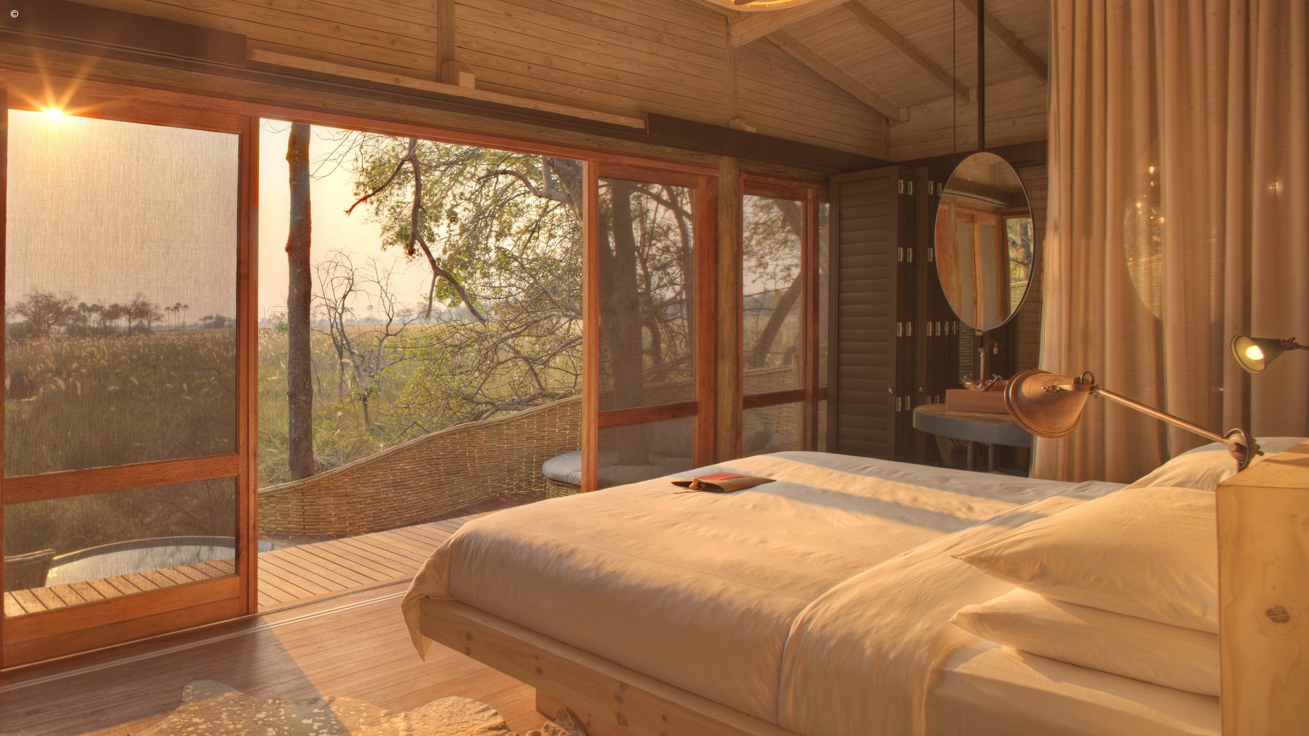 Organic and hand-woven, private and intimate, Sandibe is an architecturally unique hideaway deep in the mighty Delta. Dressed in shades of copper and wood, the lodge’s grand and high interiors open out to even grander views, with spacious decks offering a spectacular spot to drink in the resident wildlife.