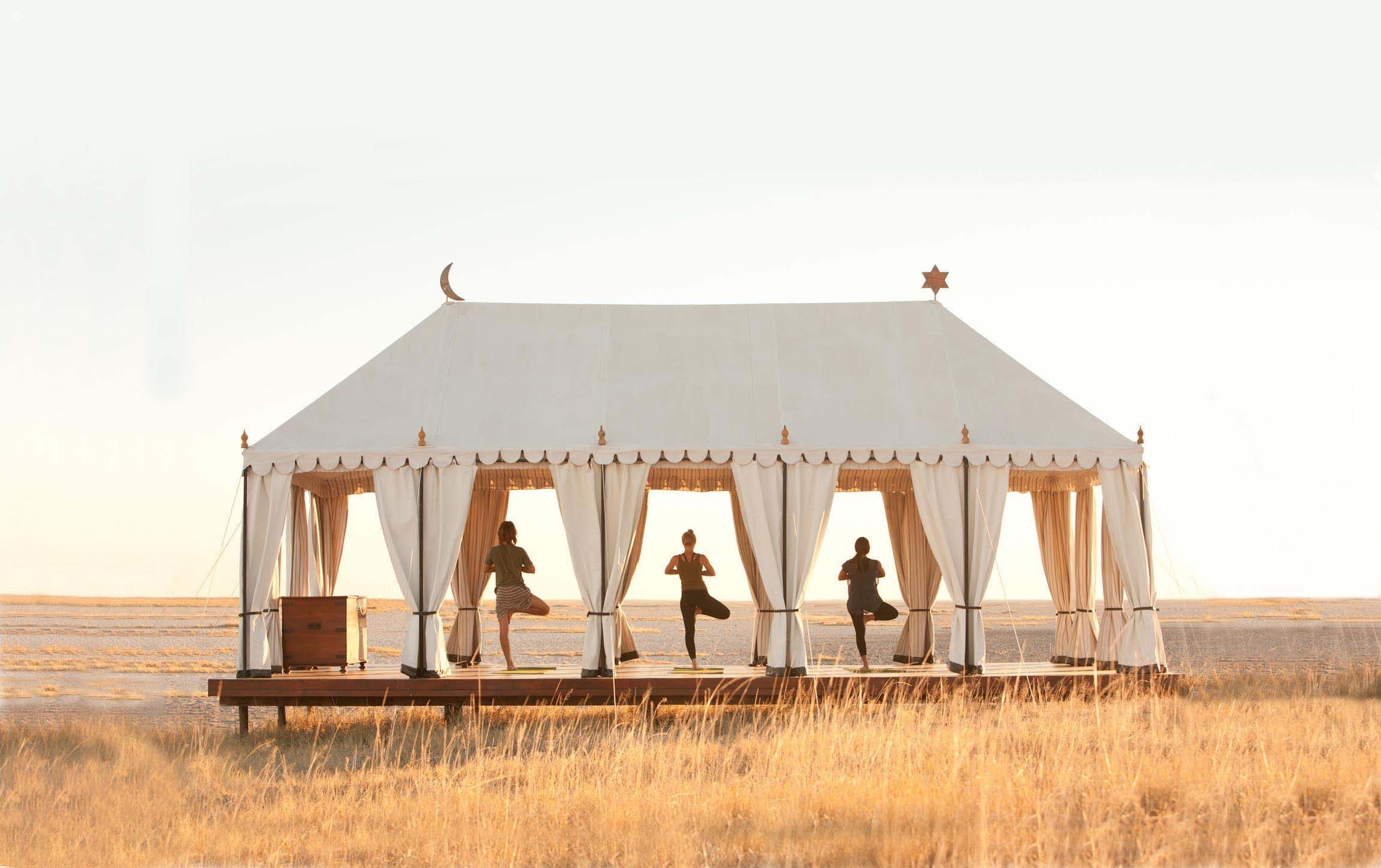 The camp itself mirrors the simplicity and open spaces of the pans. Six elegant spacious pavilion style tents sit each under a cluster of tall palms. Period style pieces adorn the interiors with lovely wooden chests, boxes and brass fittings about. Bathrooms are equipped with bucket showers and a flush toilet. The rooms are lit by the warm glow of old-fashioned spirit lamps.
