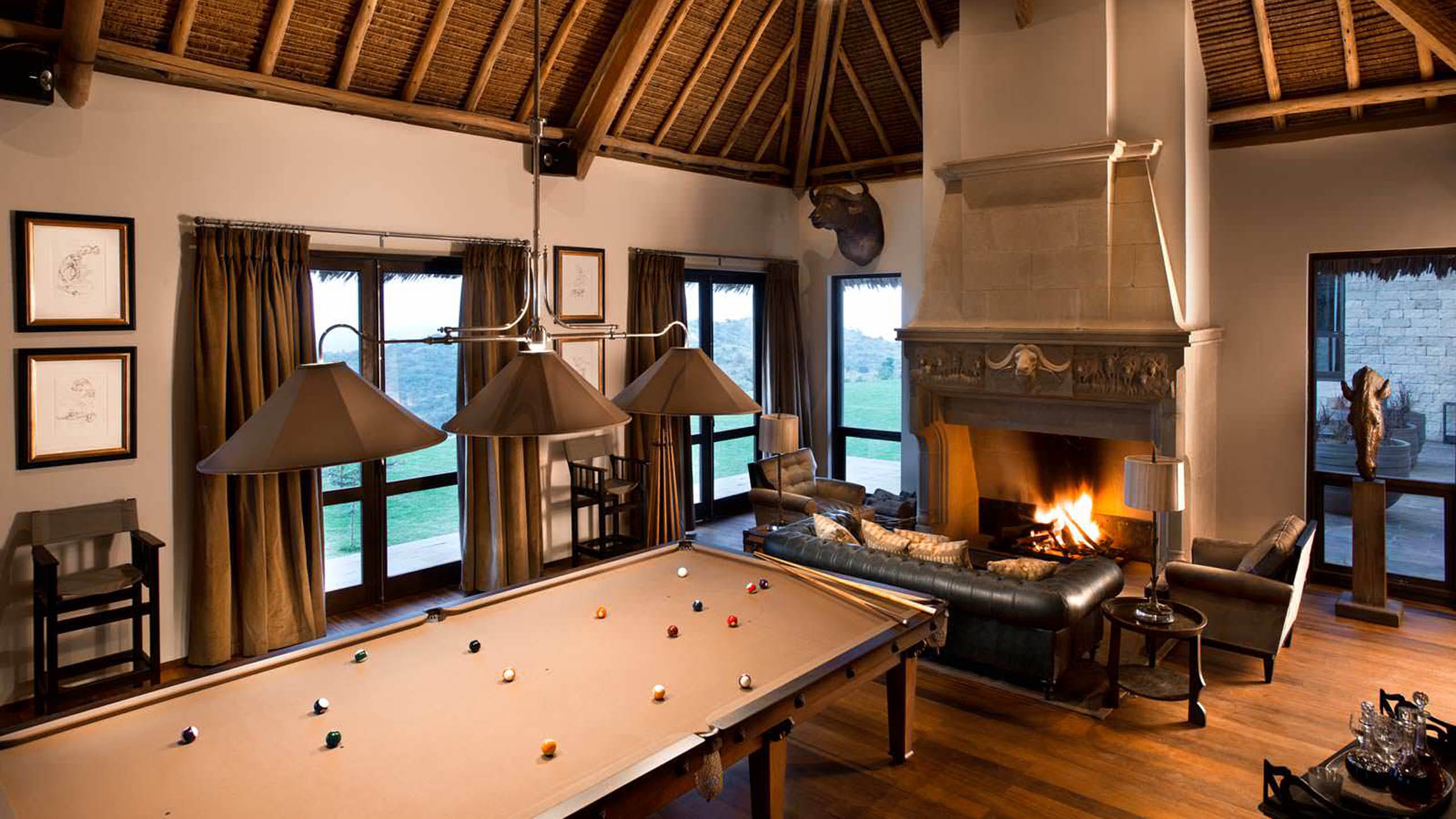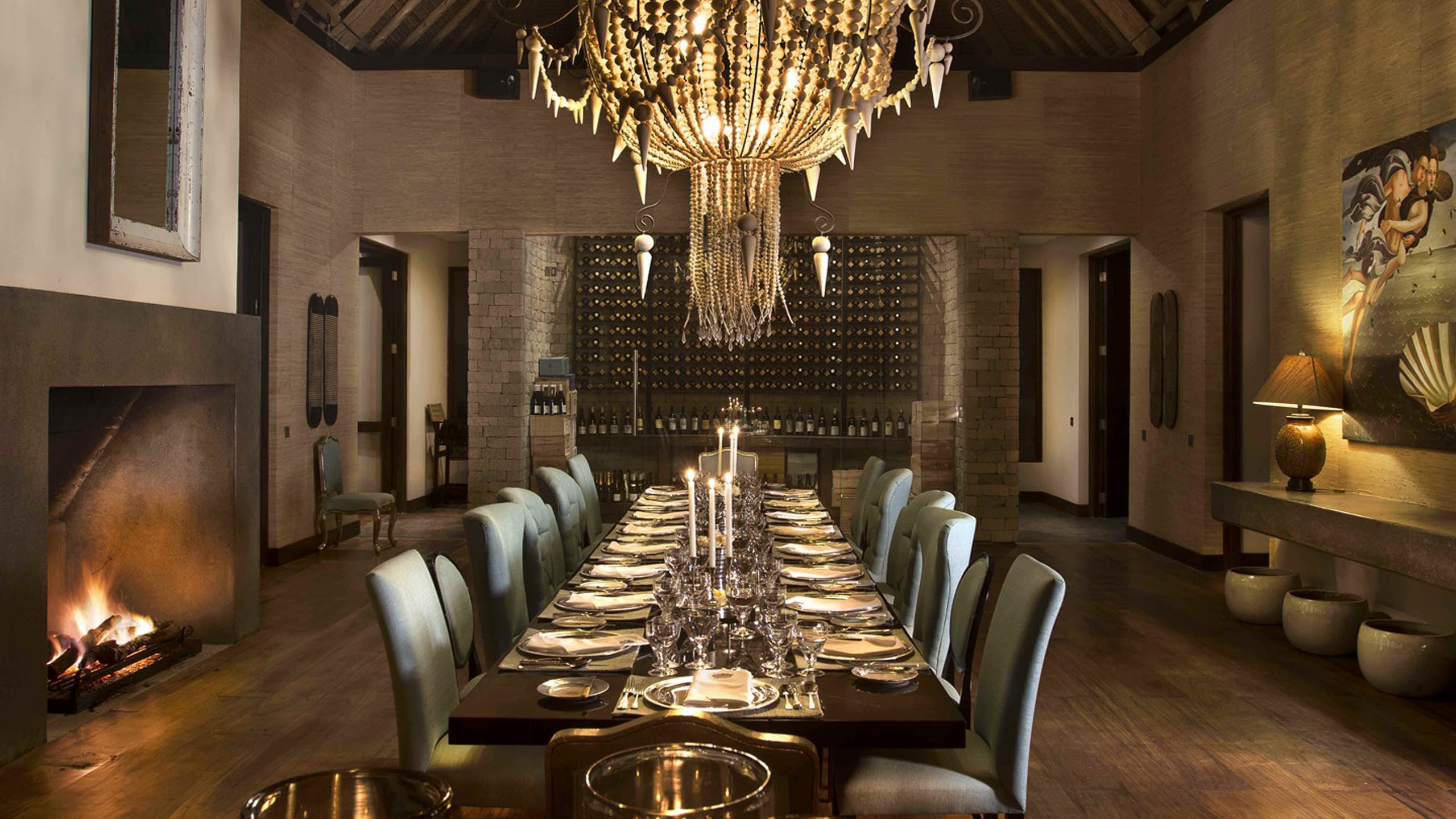 The attention to detail is remarkable. From the high ceilings and giant carved sandstone fireplaces in the drawing room, to the dining room’s epic chandelier, to gardens filled with a pool, boma and relaxing areas, every imaginable luxury is here.