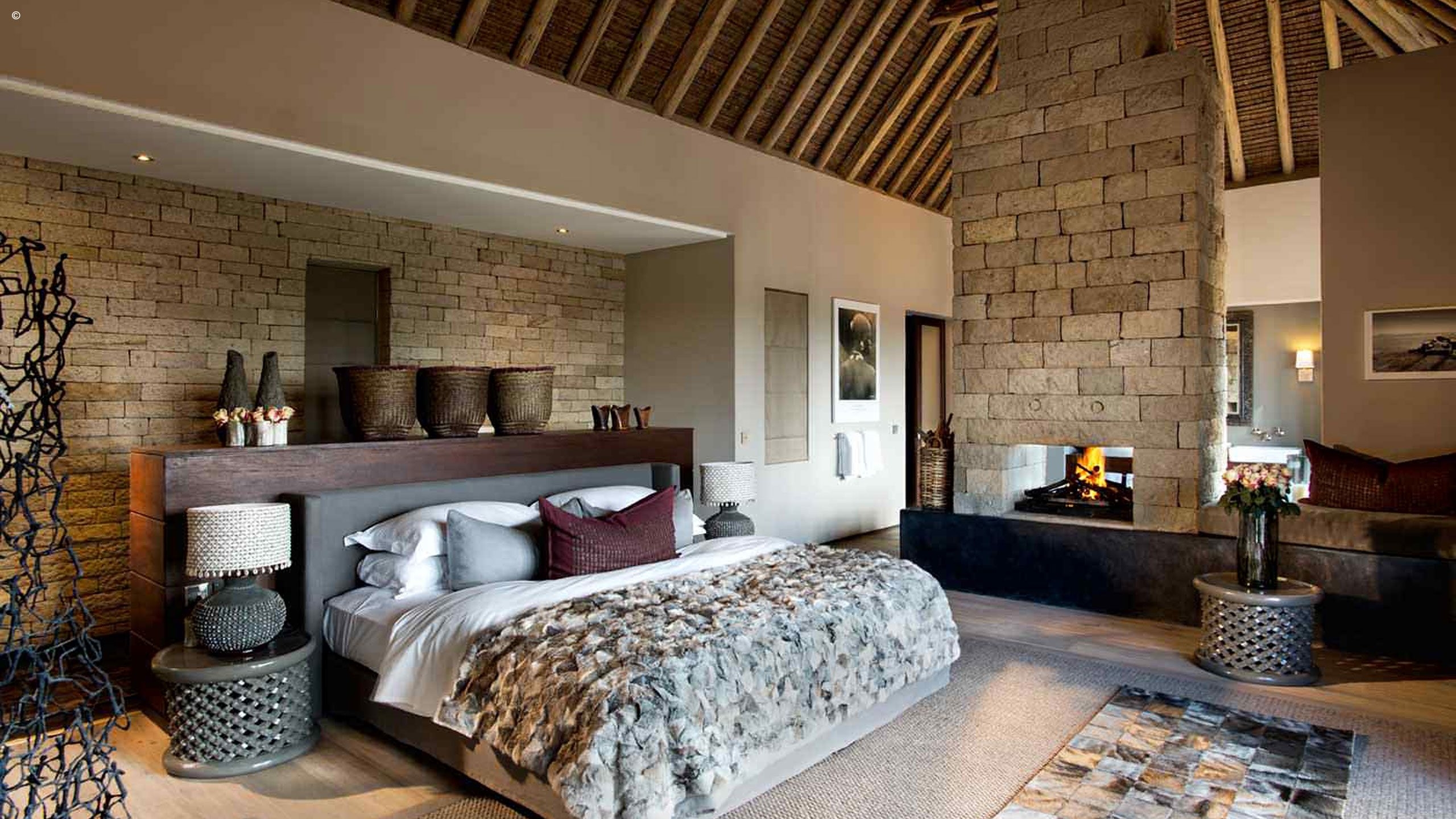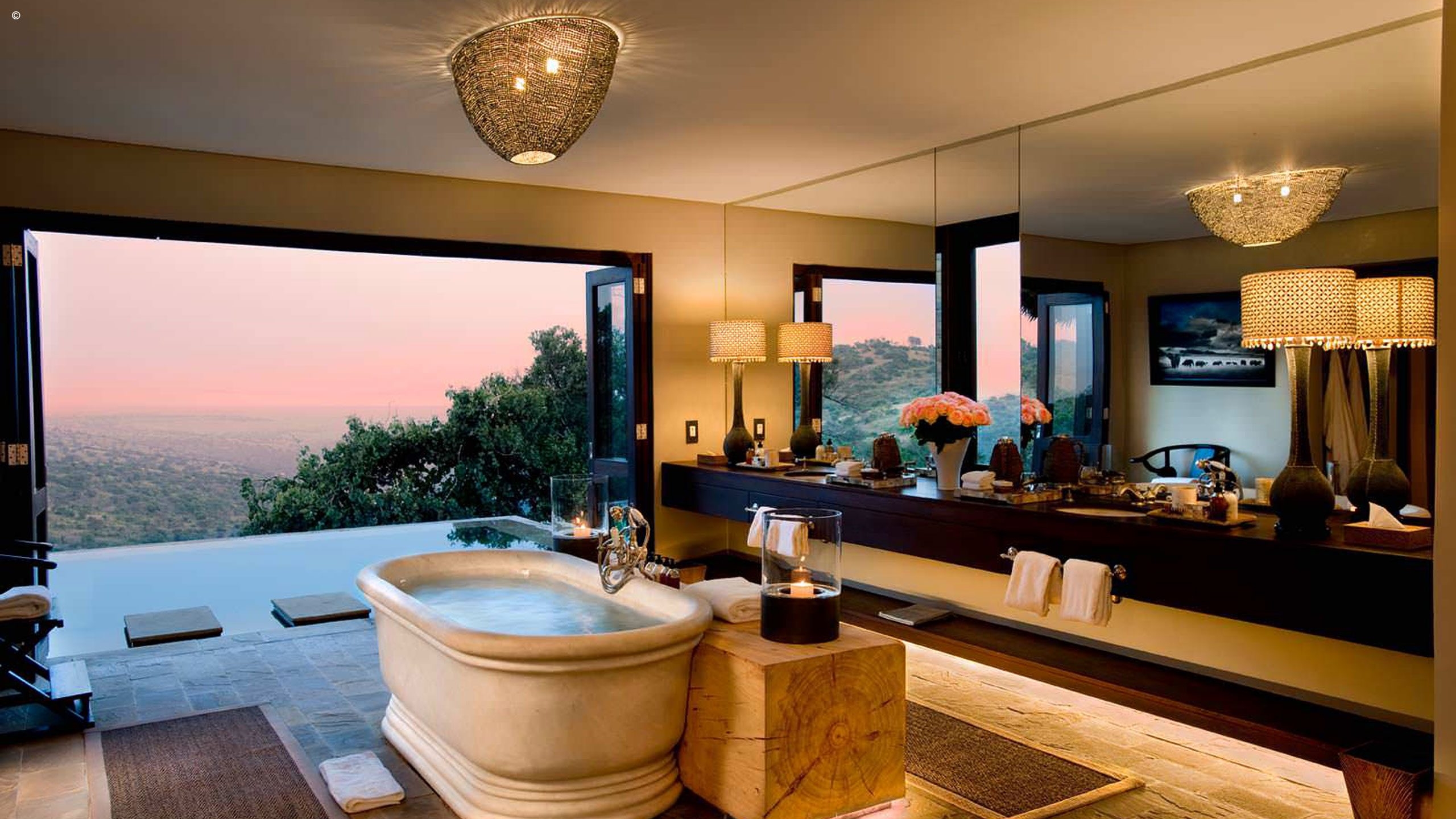 And then there are the suites. Six extravagant rooms feature African art and sitting rooms that lead onto gorgeous verandas. Though, the master suite is the house’s showstopper with its own study, dressing room, sitting area, private terrace, pool and huge, classical marble bath where you can watch the animals graze below.