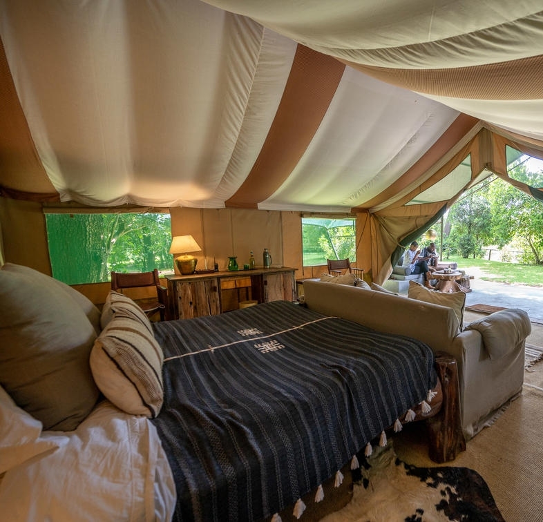 The Simba and the Chui tents are both suites, with the former connecting two enormous double bedrooms and their en-suites to a kitchen, dining room, and living area. There is also a fully-stocked bar. If you desire a butler or complete privacy, the Simba suite can provide both ends of the luxury spectrum. The Chui tent features two large en-suite twin bedrooms with a stone boardwalk separating them from a large central living space that houses a private kitchen, lounge and dining room. This is the perfect suite for families or friends travelling together.