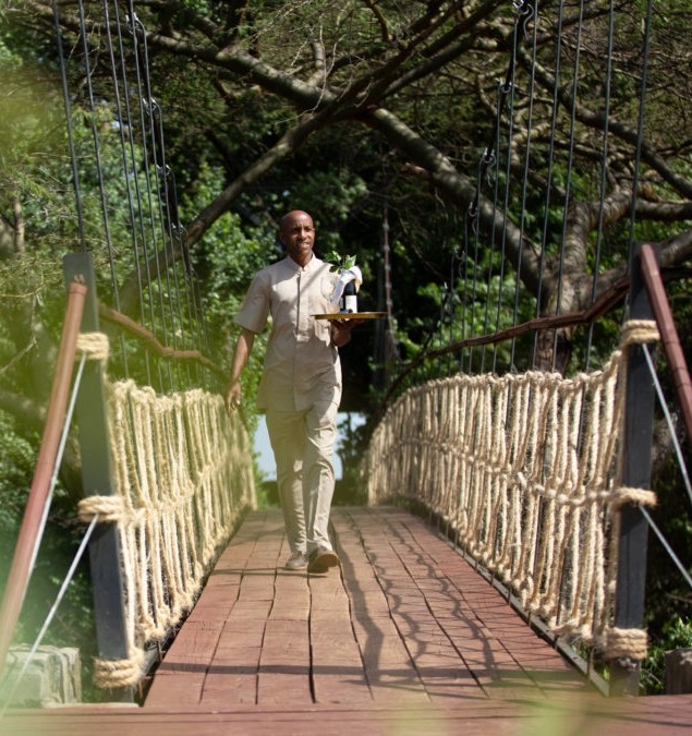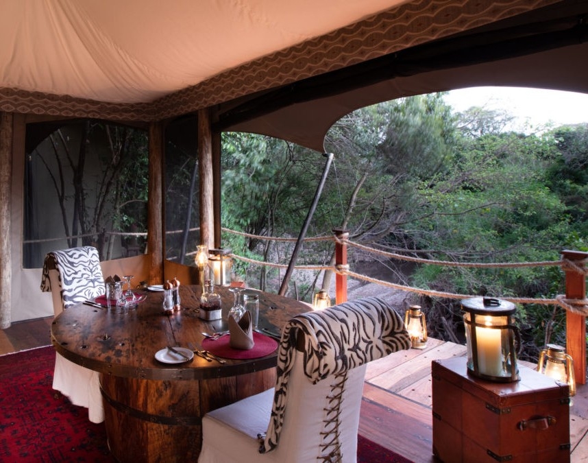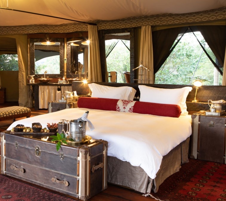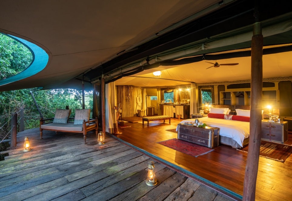 Stroll along walkways that wind their way through the forest between the tented suites that are built on high stilts offering you stunning views onto the Ntiakitiak Riverr or across the Mara plains. Each suite has deep canvas canopied ceilings, rough-hewn wood floors and accents of East Africa’s rich safari history. Expect thick Lamu wood doors, deep purples, and brass accents. The raised library looks down onto hippos wallowing in the river, while the wine cellar is the perfect place to unwind and sample a selection of excellent South African and French wines. You can also choose to enjoy a private dining experience here.