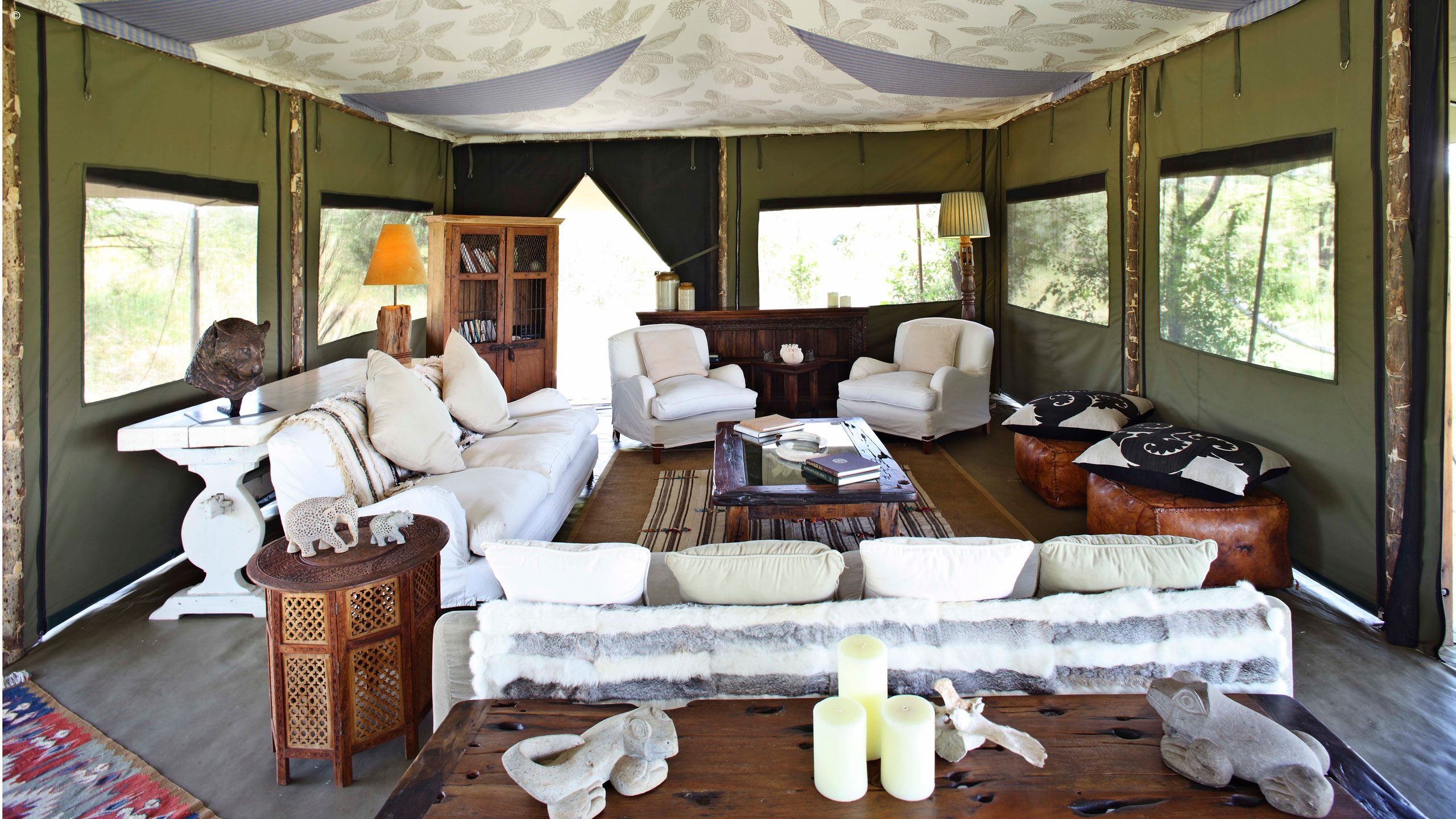 Five incredibly inviting tents sit open to the bushveld scenery and wildlife sights of the nearby hippo pool. Appointed with warm high-quality linens and antique furnishings the tents also include modern comforts and en suite (outside) bathrooms with 24-hour hot running water.