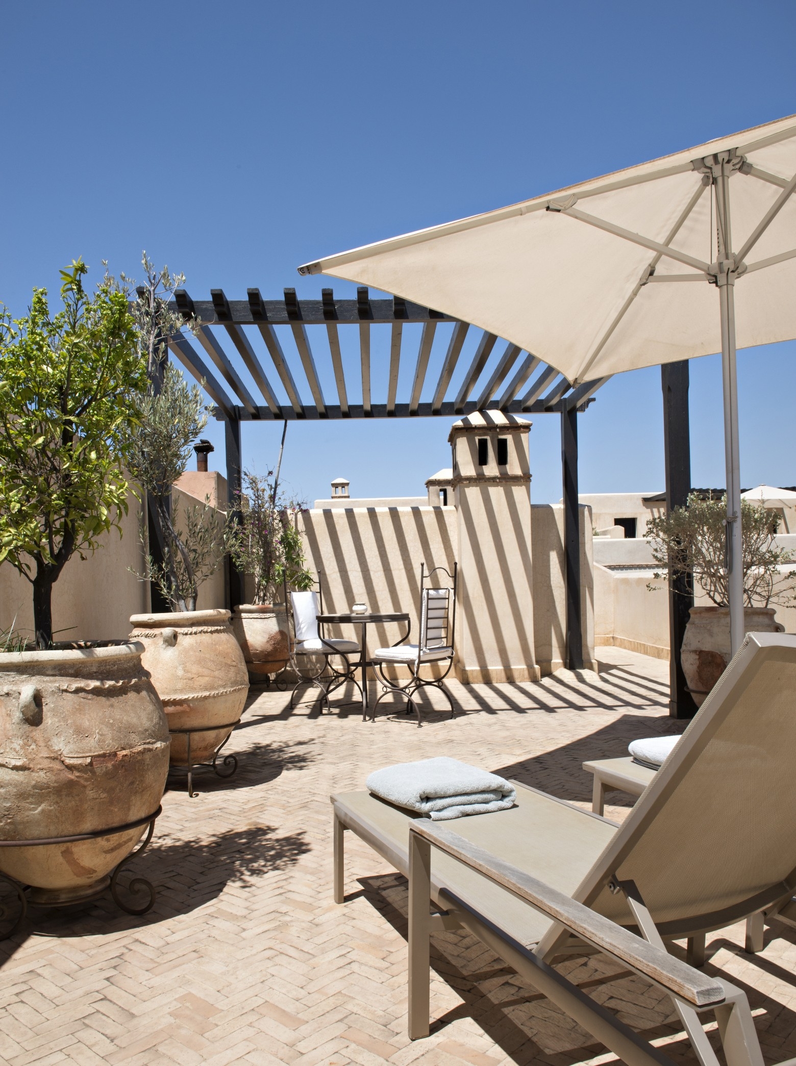 The Villa des Orangers is an elegant place, with 27 rooms and suites arranged around three garden patios, fragrant with citrus tree accompanied by the sounds of songbirds and tricking fountains. Décor is palatial, with fine fabrics, intricate stuccowork, carved wood and antiques. Most of the rooms have their own balconies or terraces, with the ‘Private Riad’ enjoying two bedrooms, solarium, plunge pool and its own private entrance.