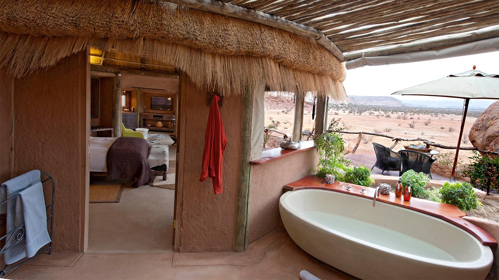 There are nine dome shaped rooms at Camp Kipwe and one sprawling, thatched roof suite. Natural touches such as rocks embedded in the floor and animals carved into the wood, mimicking the area’s famous engravings, add to the unique sense of place, as do incredible views out across Damaraland.