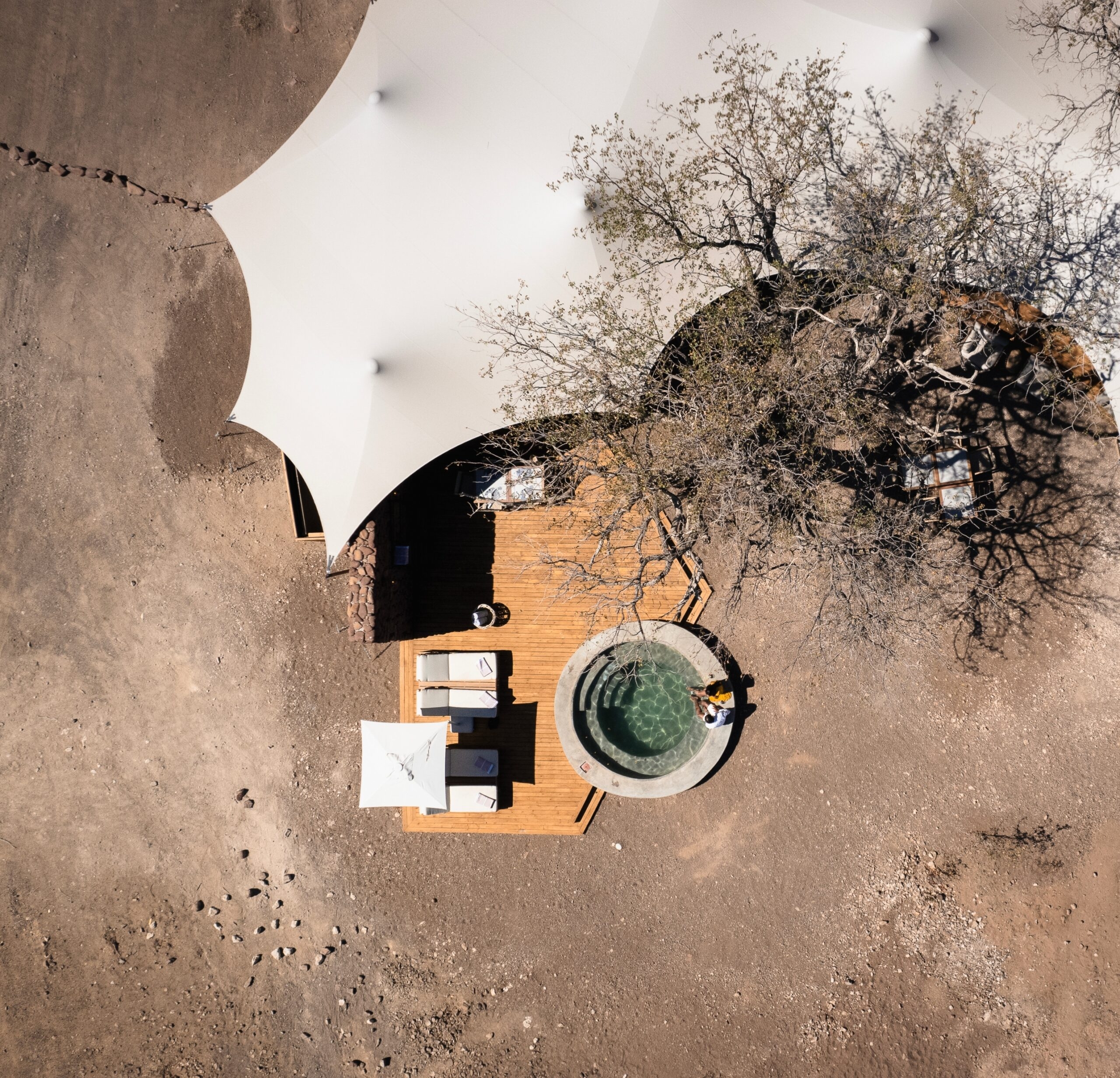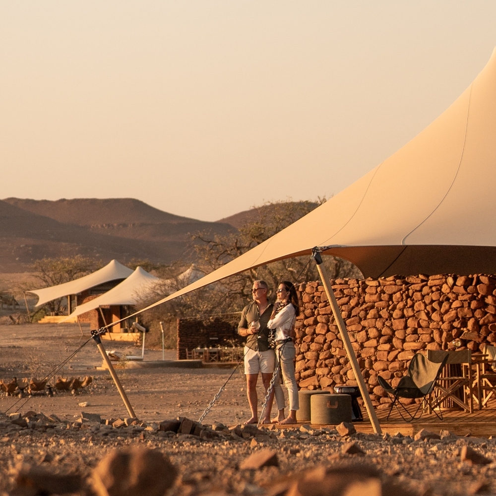 Lodging at the camp is divided between eight raised Meru-style canvas tents with front verandas that take in expansive landscape of the dramatic Etendeka Mountains and the plains scattered with euphorbia and ancient welwitschia plants. The tented dining and lounge areas have also been elevated to provide panoramic views during meal times and moments of relaxation. There’s also an attractive pool to cool off in and a fire pit for enjoying nights spent stargazing and swapping tales.