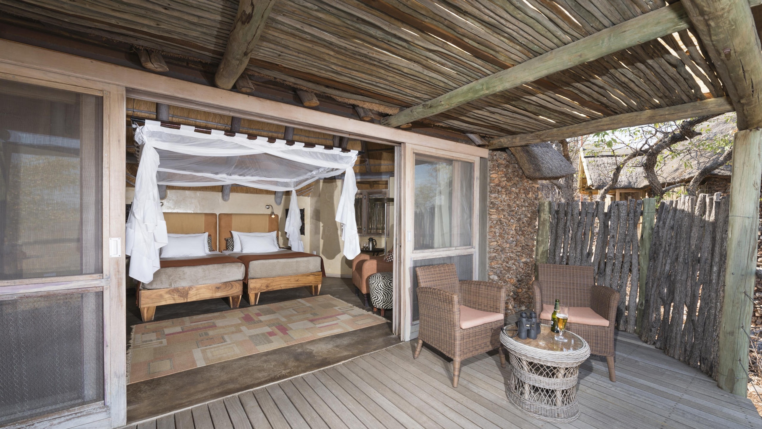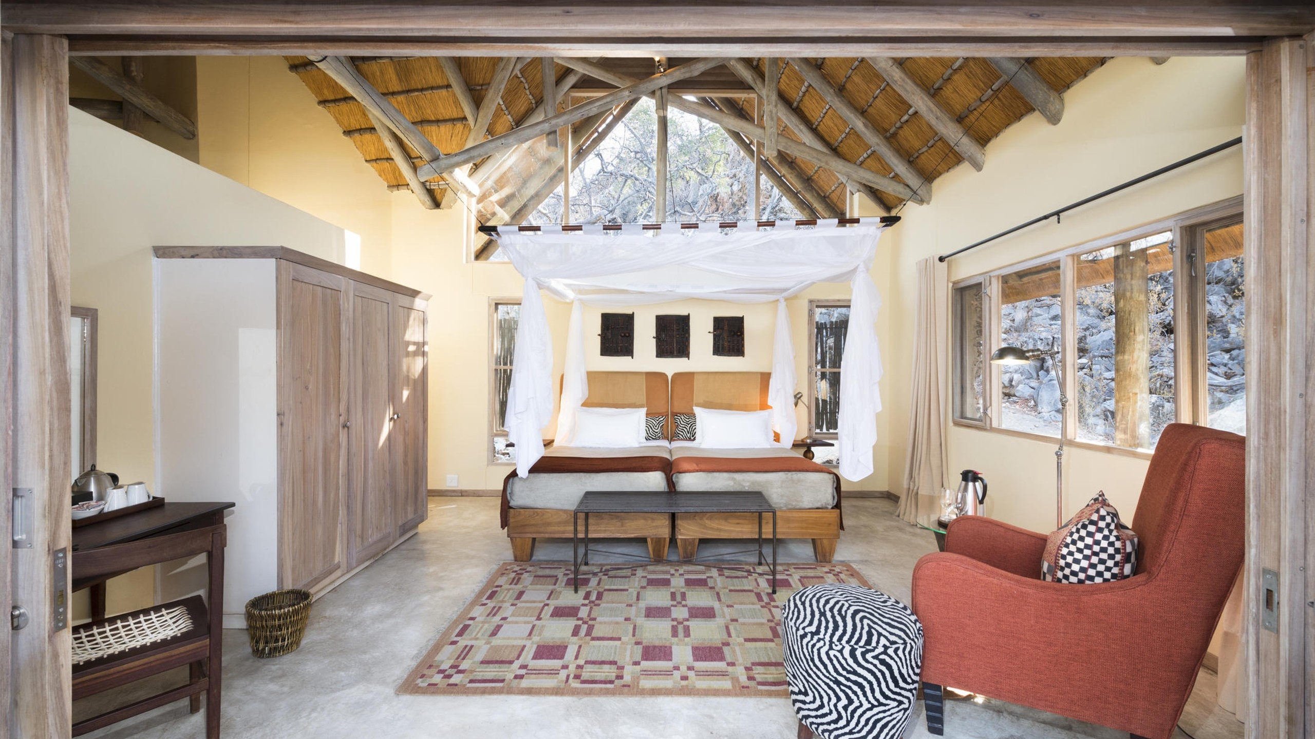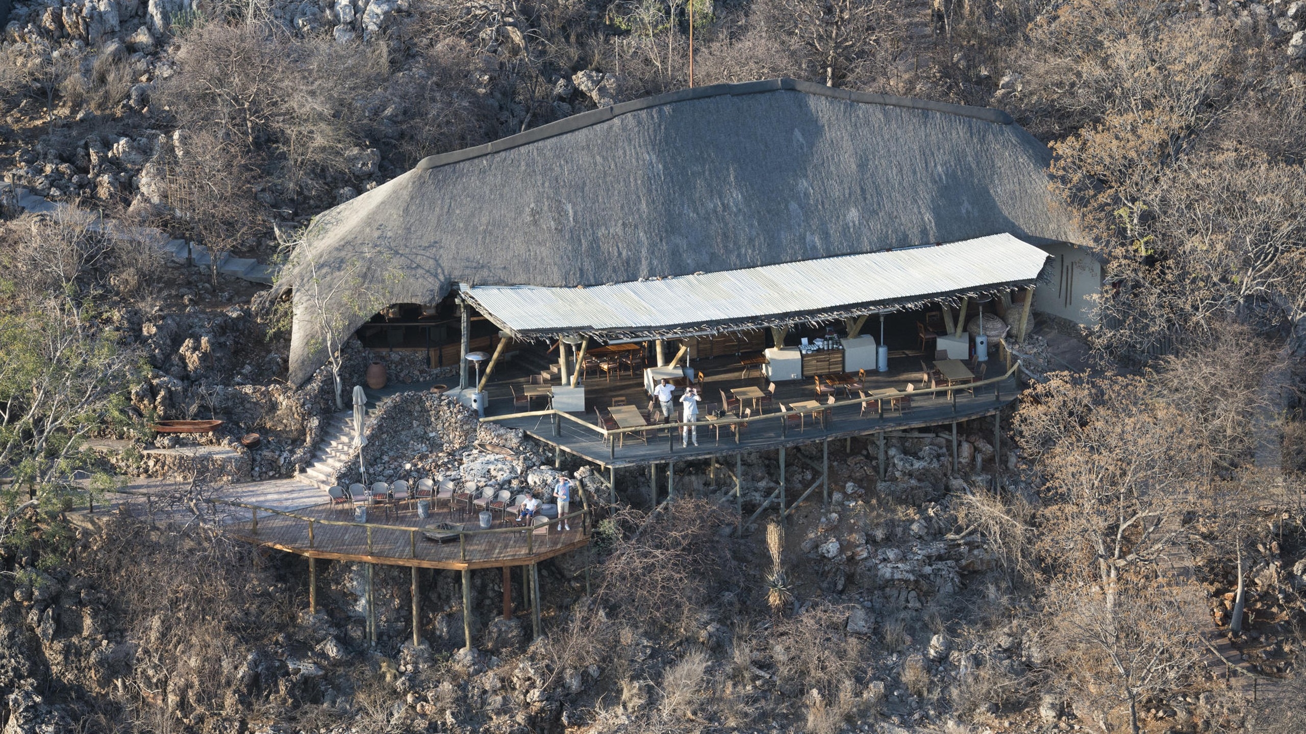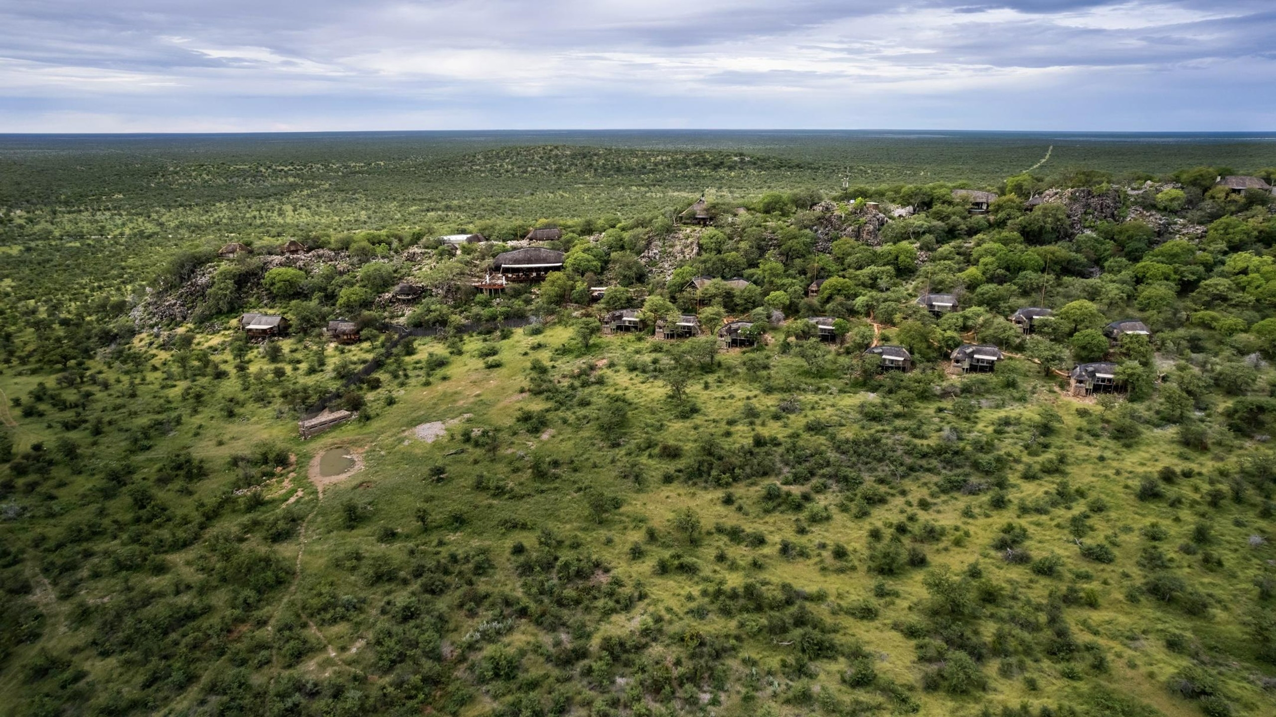 14 rock-and-thatch en-suite chalets, one of which is a family suite with two bedrooms. The main lounge, dining and pool area is situated on the foothills of the Ondundozonanandana Range, overlooking a floodlit waterhole and a vast beautiful plain. You’ll be accommodated in luxury air-conditioned thatched chalets with private veranda, all with en-suite bathrooms.