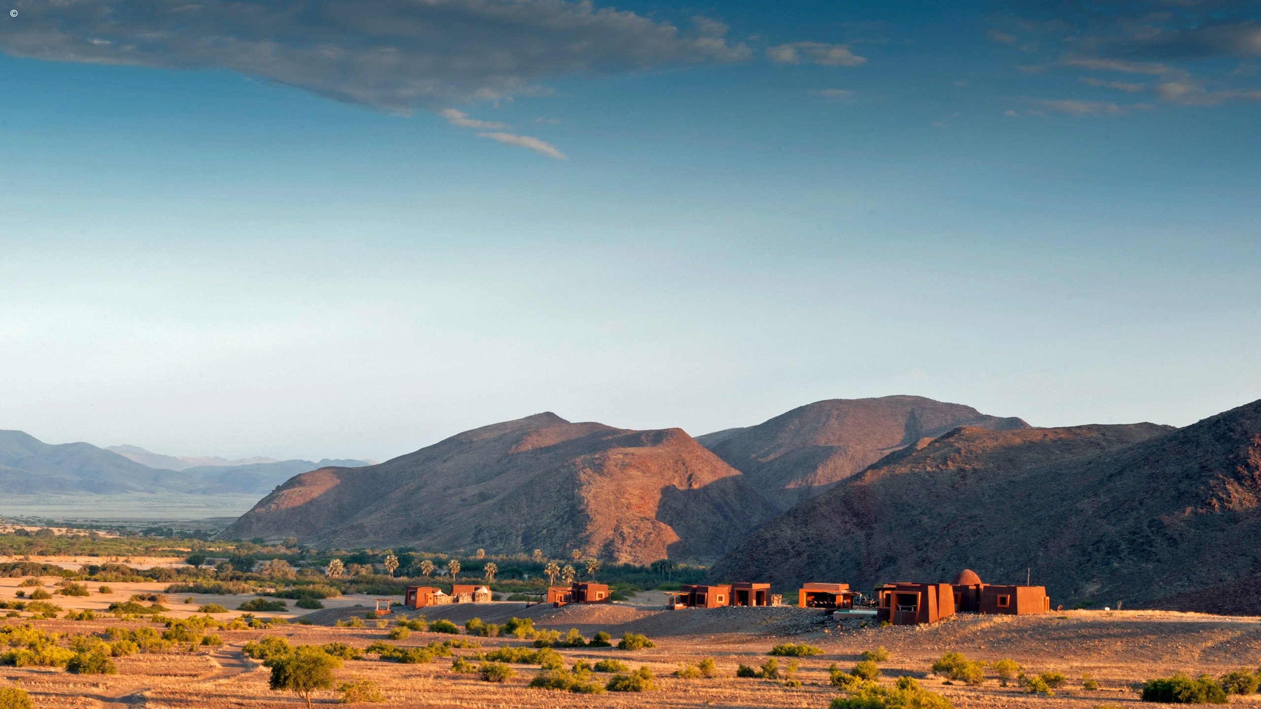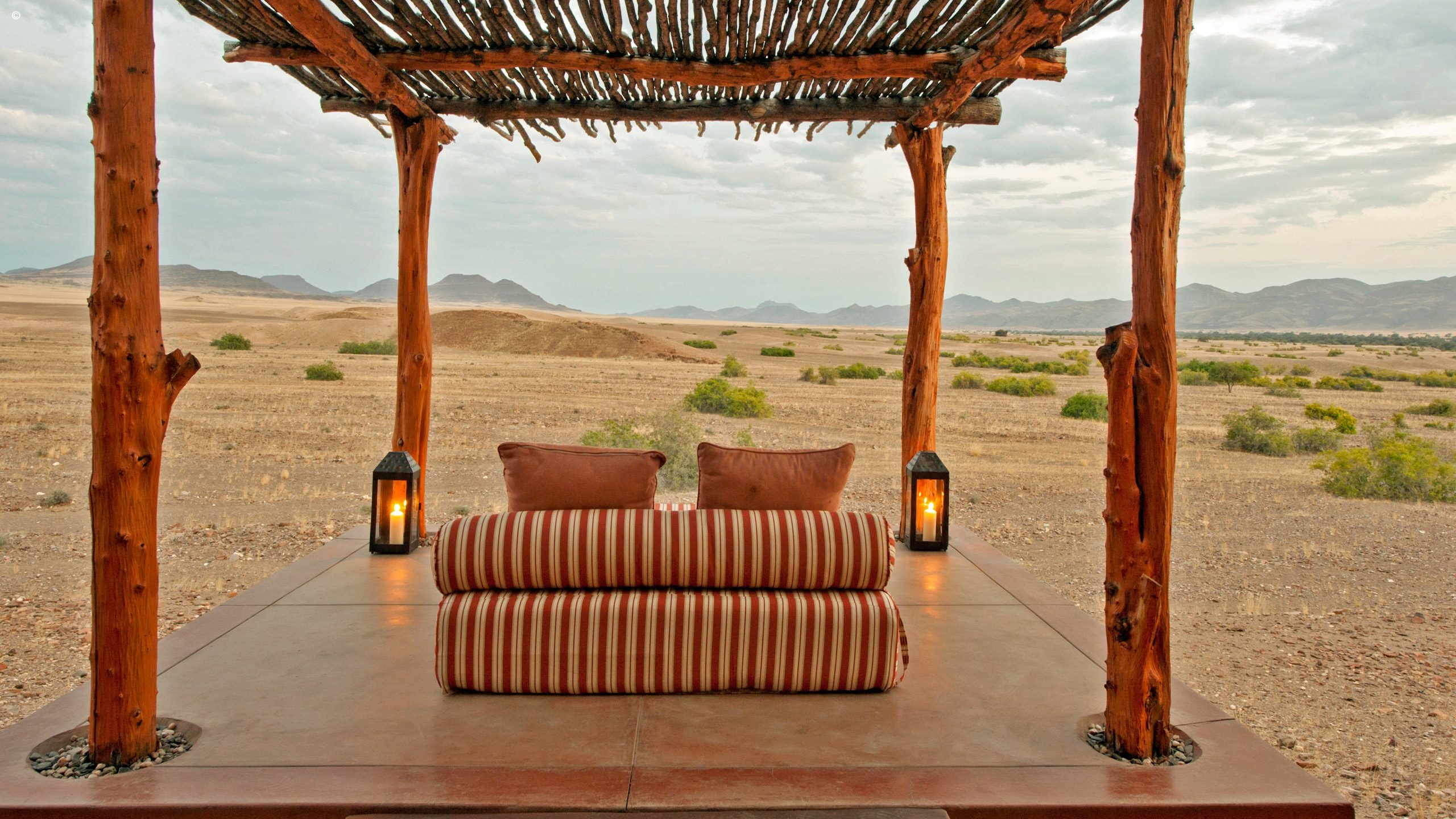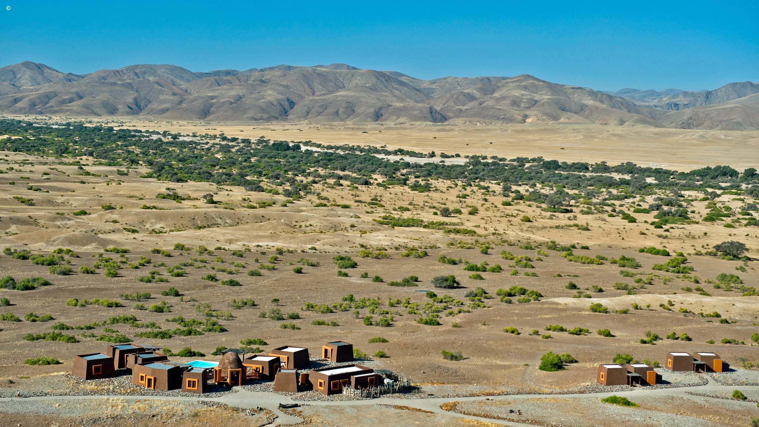 One of the most striking things about the Okahirongo Elephant Lodge are the views you get from every angle that you sit, stand or lie. Even from your bathtub you get scenes of the Hoarusib River below, the jagged outlines of the Purros Valley mountains in the distance sometimes accompanied by the remote roar of desert lion.