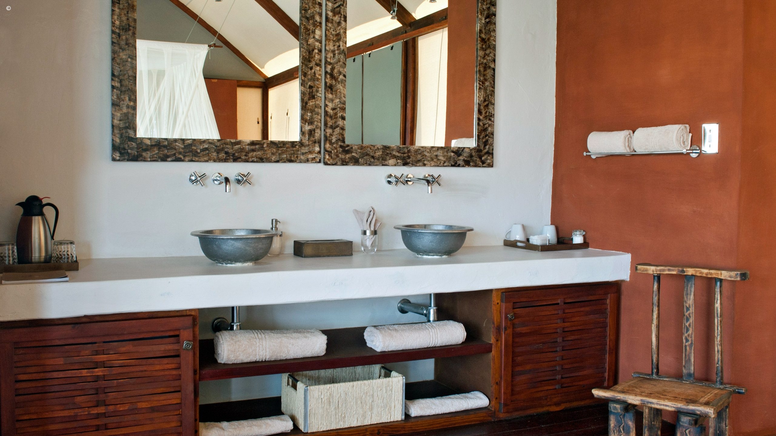 Accommodation at here consists of eight riverside Meru-style canvas and thatched villas on spacious, elevated decks blended smoothly into the picturesque surroundings. Each fully furnished tent has an en-suite bathroom, ceiling fan and mosquito nets. A late afternoon spent lounging on the front deck soaking up the breathtaking vistas of this contrasting wilderness is an absolute must.