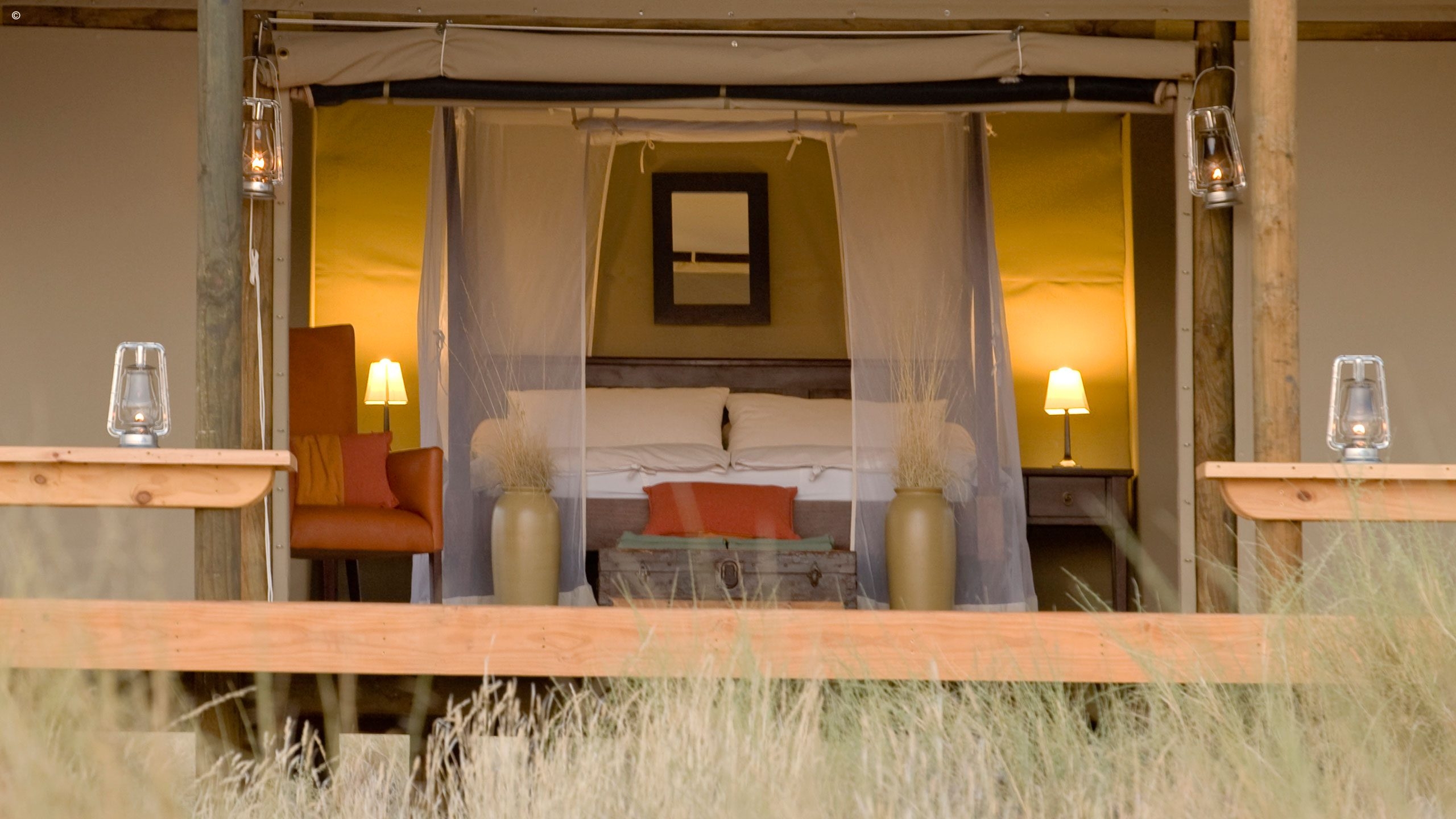 The camp is located on top of a 250-foot sand dune lending it spectacular views and a pristine setting. Each tent sits on a wooden platform with its own private bathroom and a deck that overlooks the expansive desert and the star-littered night sky. Canvas windows can be rolled up for unrestricted views and desert breeze for an authentic safari feel.