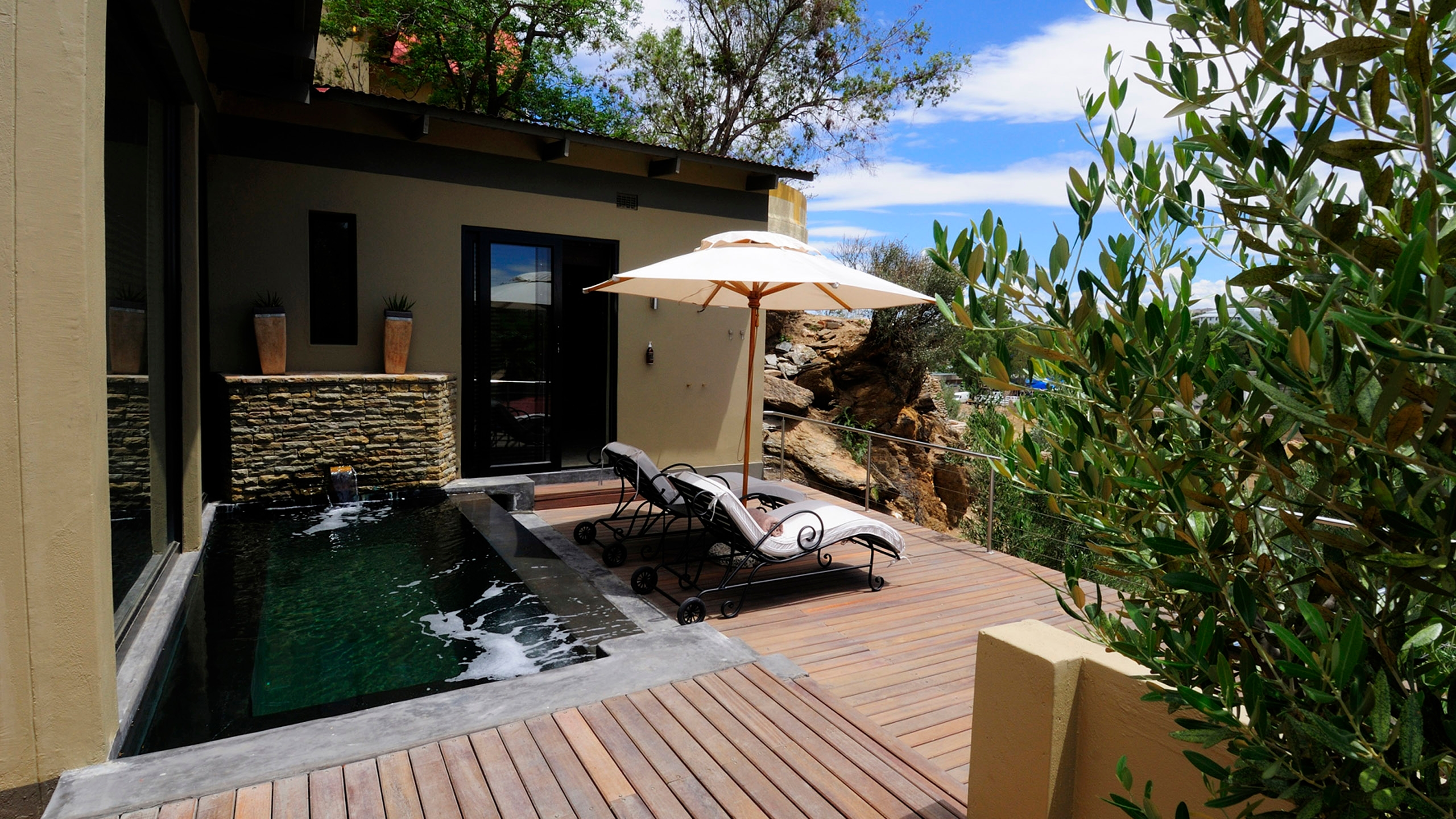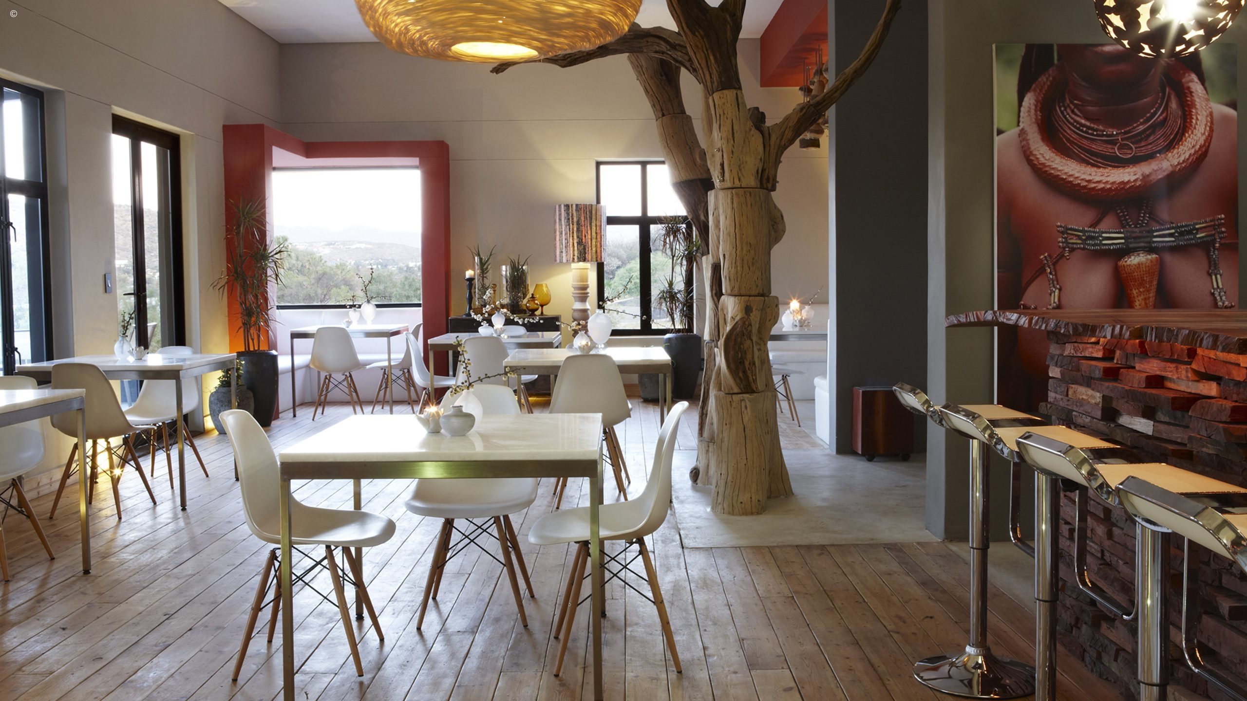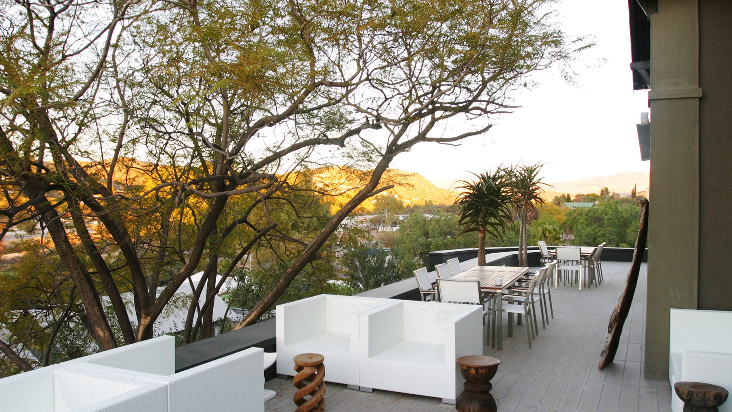 Reminders of the prevalent Namibian culture are spread throughout the hotel as the modern is combined with the traditional. Rough-hewn wooden benches sit on plush carpets around sculpted granite coffee tables, animal-skin rugs lay beneath large beds covered in crisp white cotton and wide glass doors lead out onto your personal terrace for a view across the small city.