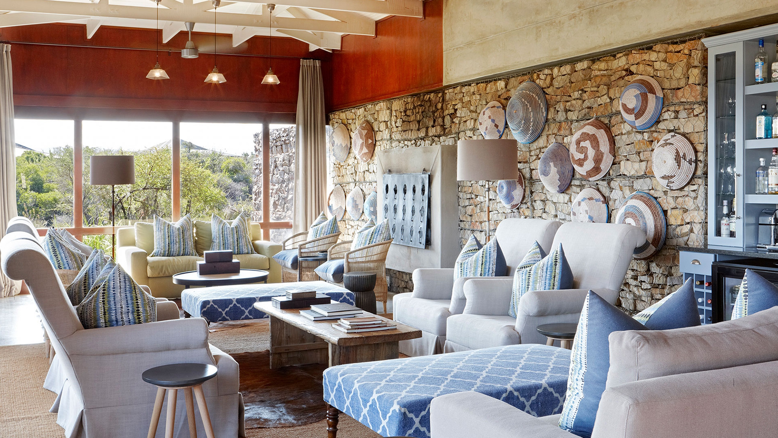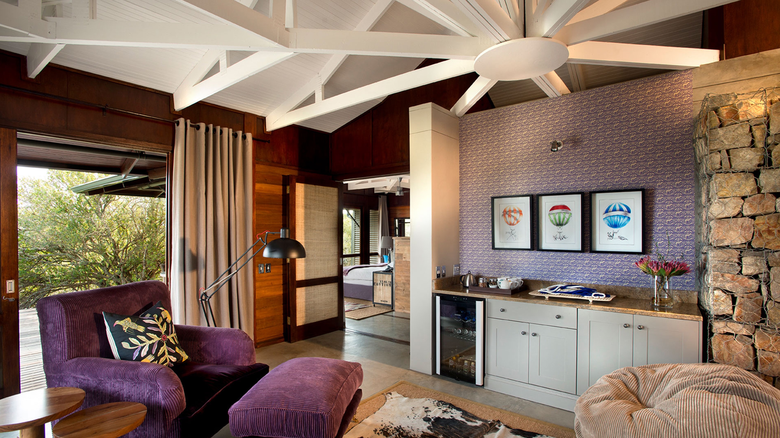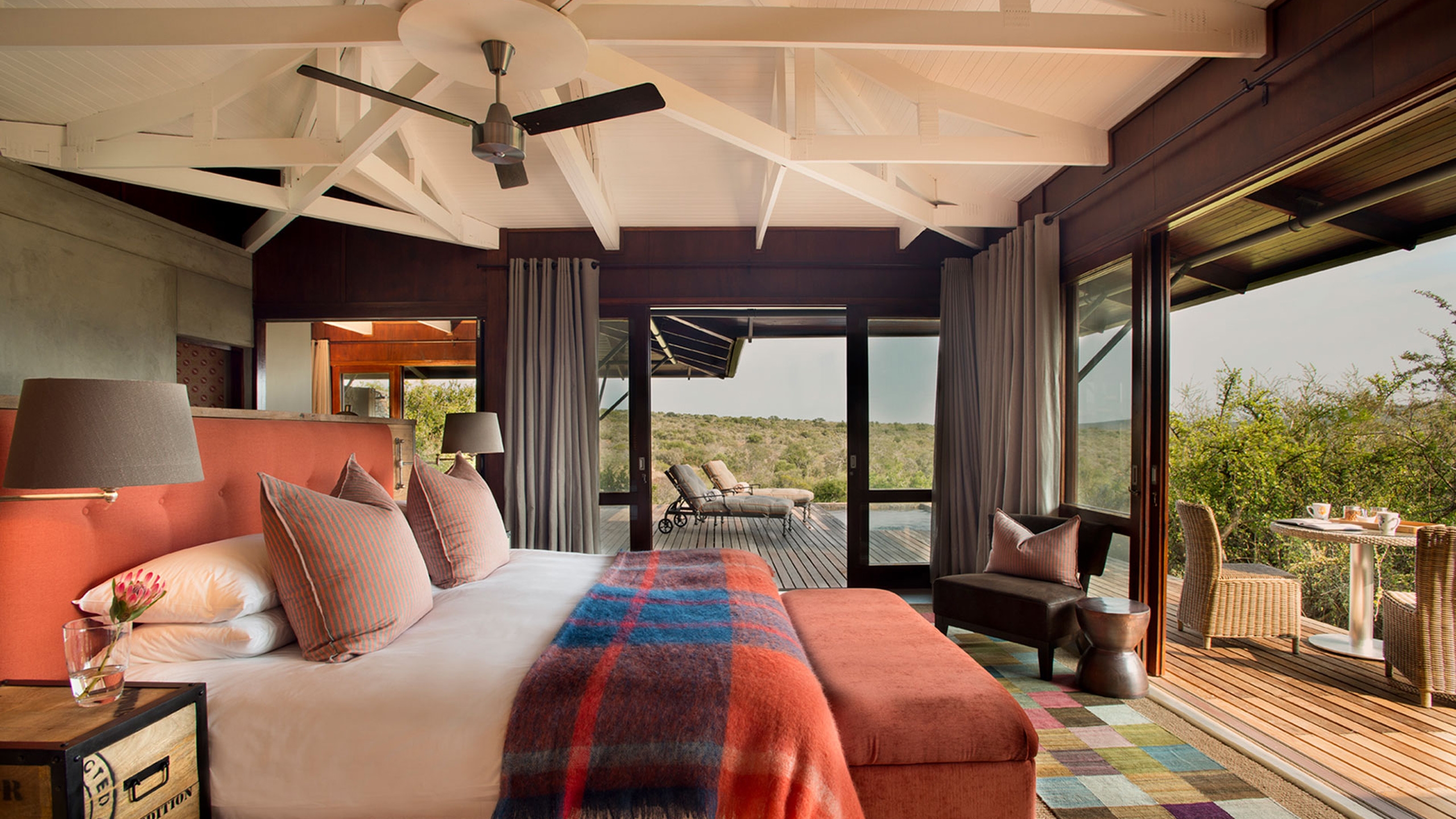 You don’t often use the word ‘trendy’ to describe a safari lodge but Ecca, with its funky 1950s-style suites, pop art, vibrant flashes of colour, seamless architectural lines and pagoda-style corrugated iron roof, really is.