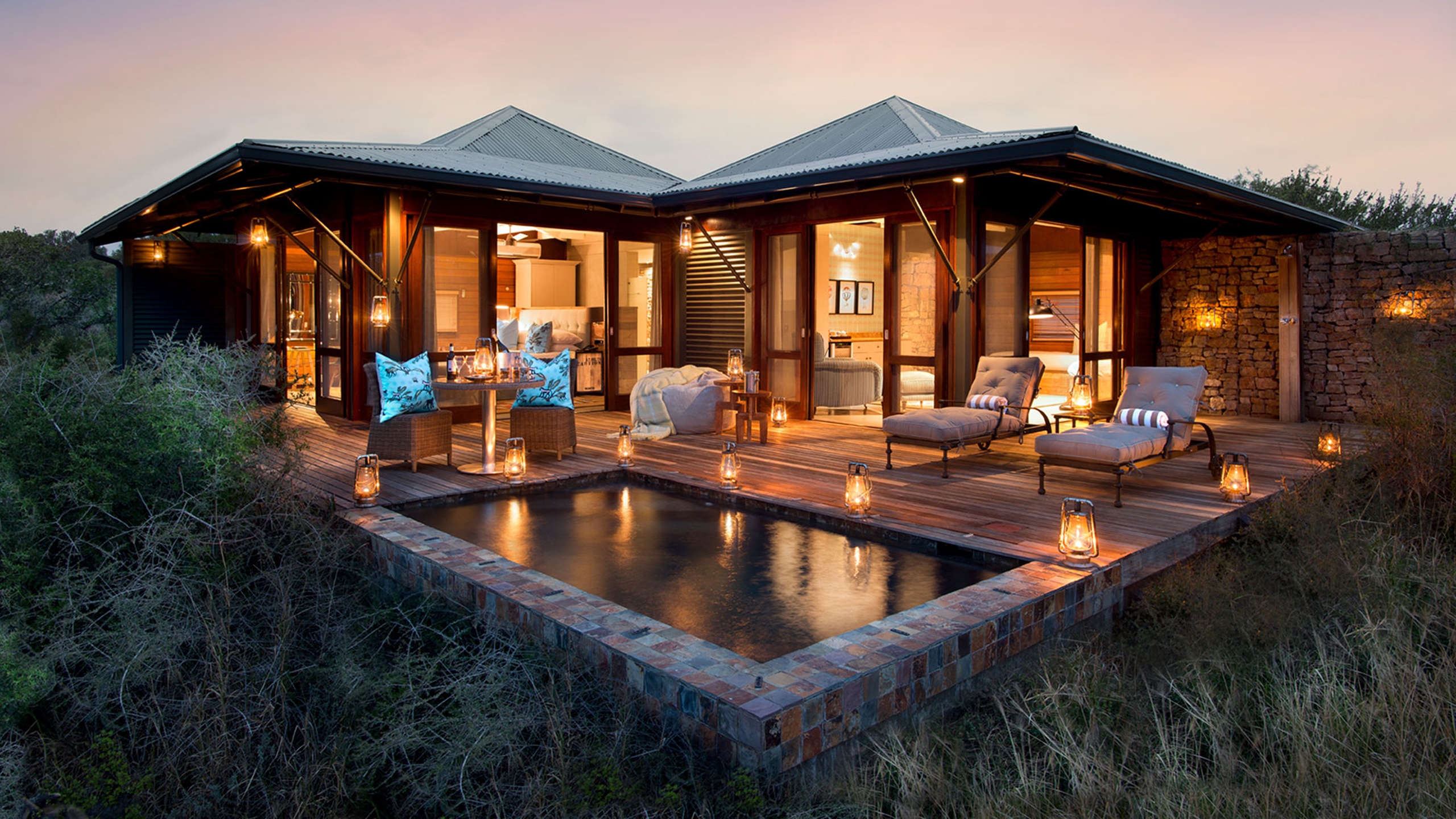 Six rooms are surrounded by wraparound timber decking, private plunge pools and a scenery of Kwandwe Private Game Reserve’s rolling hills thick with acacia and aloe trees.
