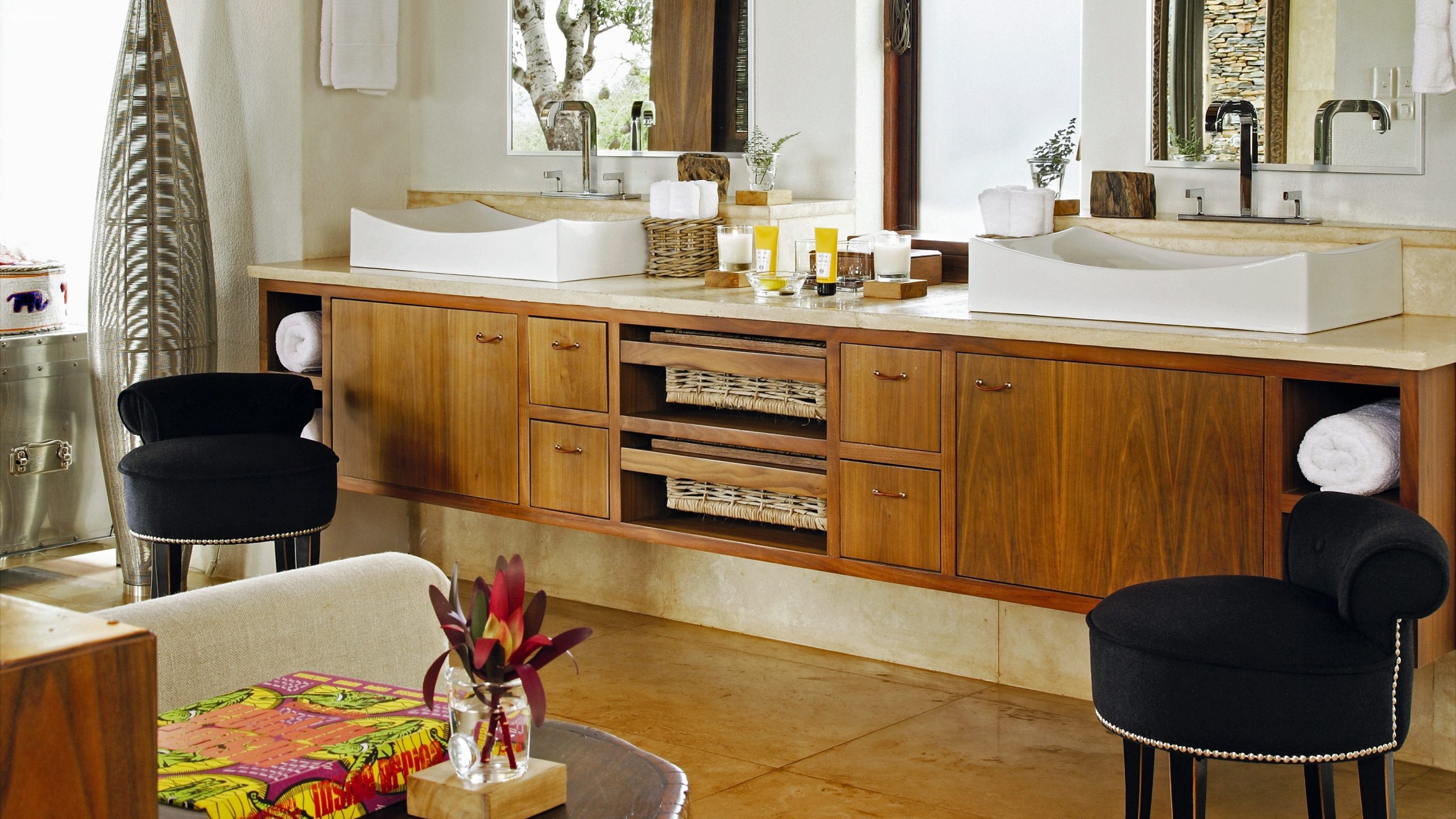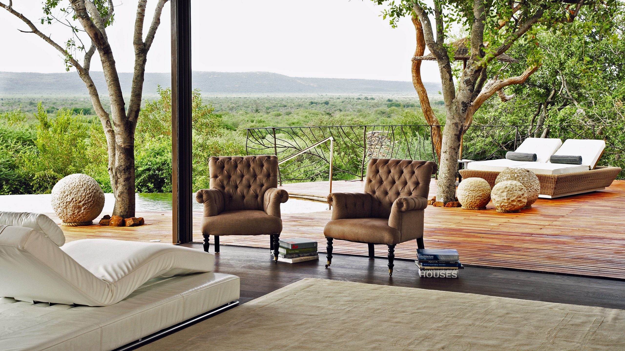 At the hand of celebrated South African interiors master Stephen Falcke, the lodge’s perfectly attuned style is not too overboard to disconnect you from the surroundings. A well-balanced blend of international fittings and furnishings sit well next to more regional equivalents and art, a good example being the glass chandeliers that dangle from the steep thatch-roof ceilings.