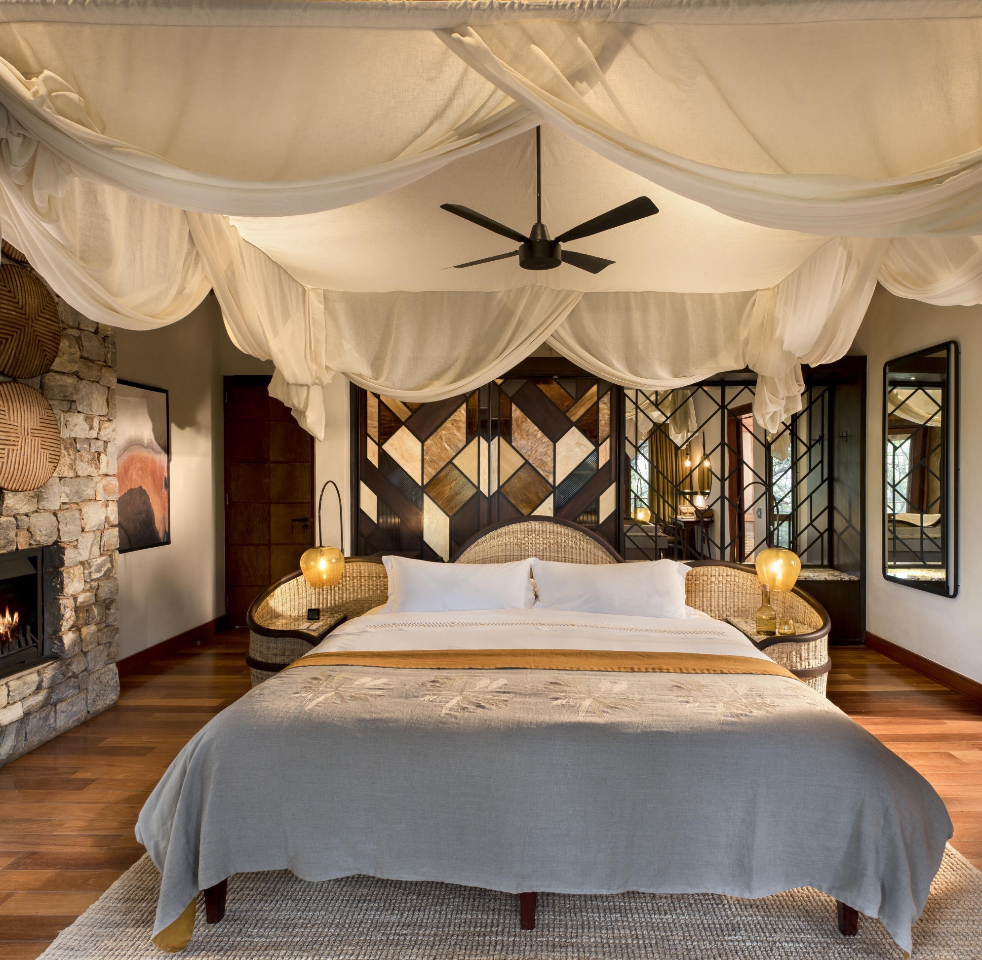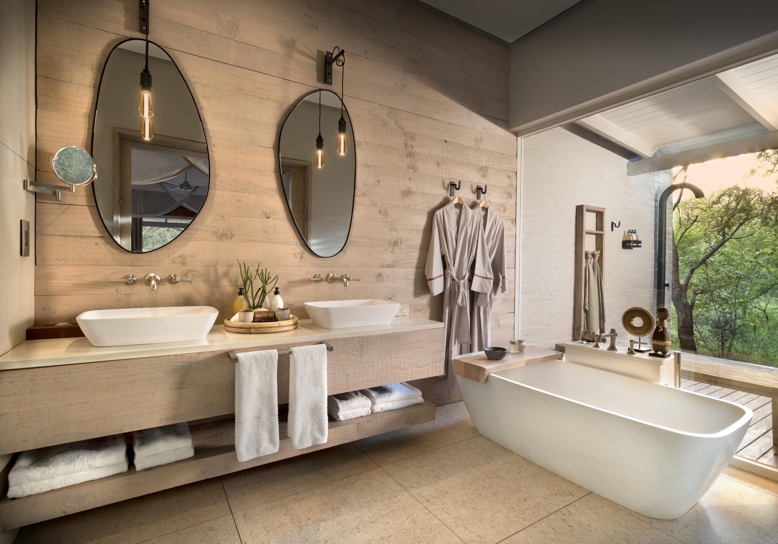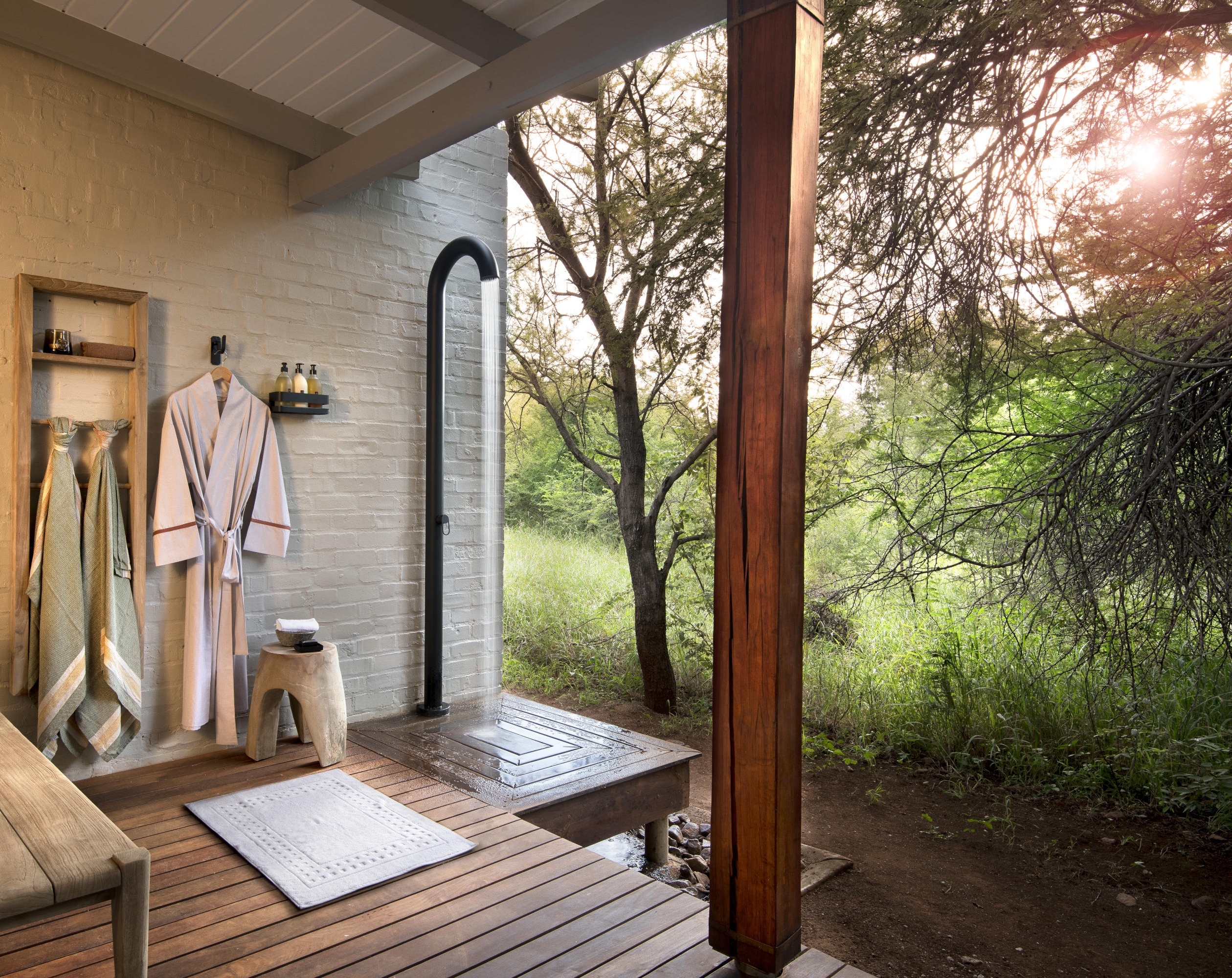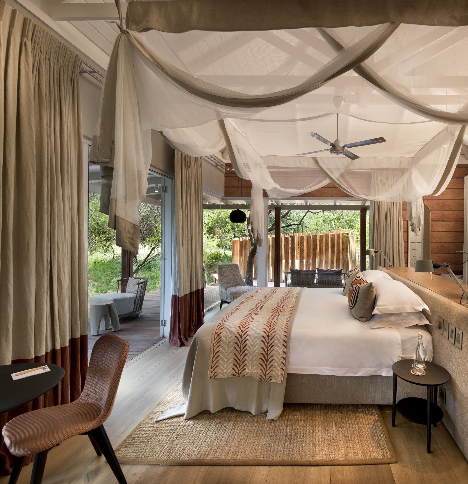 The Farmhouse, located a ten minute walk from the other two properties, accommodates groups of four to ten guests and is ideal for multi-generational travel or milestone celebrations. The Farmhouse features a warm, neutral palette and bespoke Afro-chic accents, making it a popular choice for a South African family safari. All five uniquely decorated bedrooms are connected to the main area by a covered walkway.