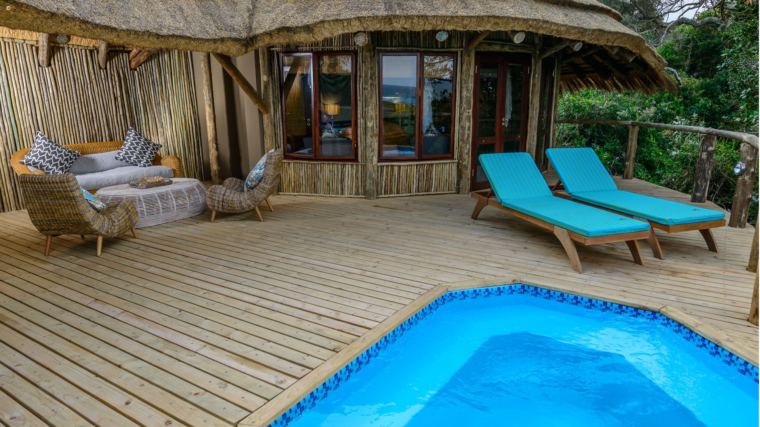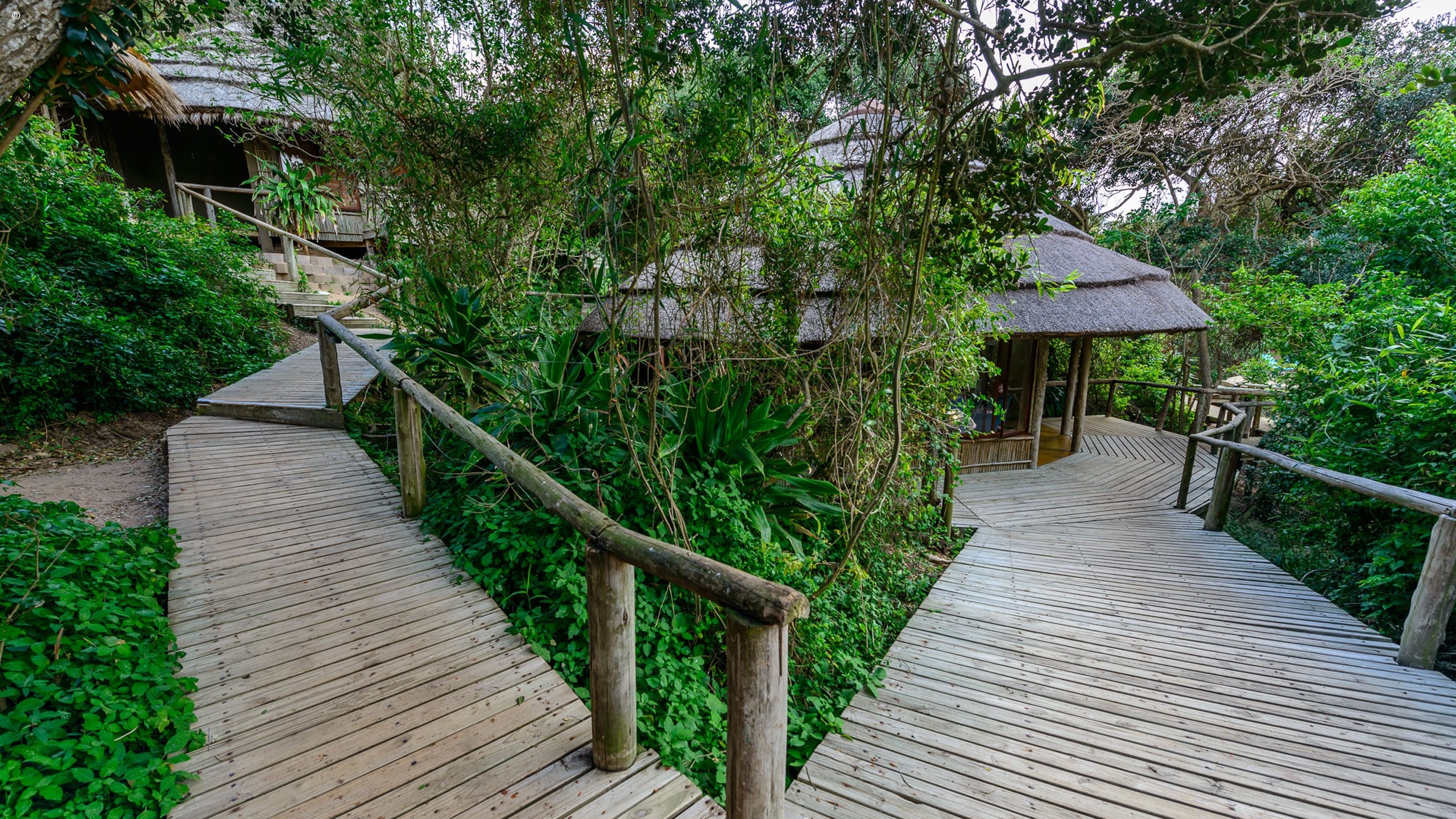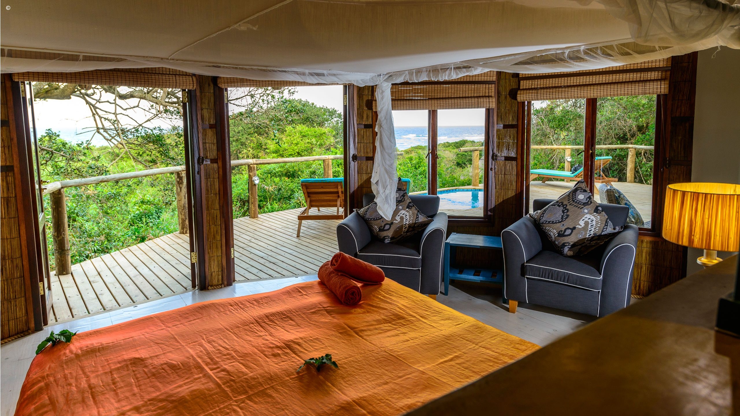 Accommodation is in 12 “Robinson Crusoe-chic” rooms. The thatched en-suite rooms have been carefully constructed in the coastal dune forest to ensure minimum impact on the environment whilst still ensuring maximum guest comfort. Each 50 m2 room has a double vanity, stone bath, indoor shower, separate toilet, bar fridge, ceiling fan, mosquito net, private balcony. All rooms are air-conditioned.