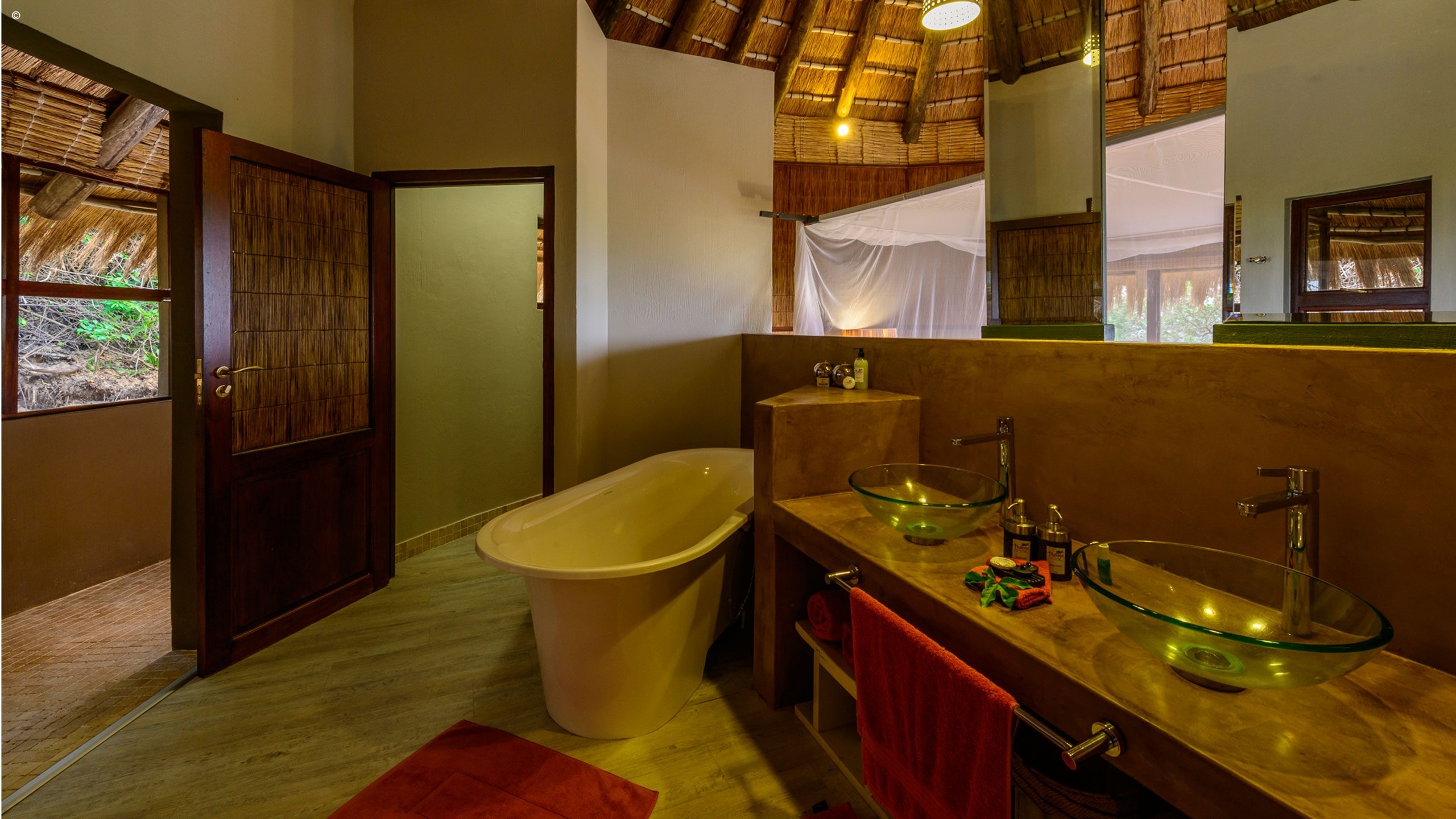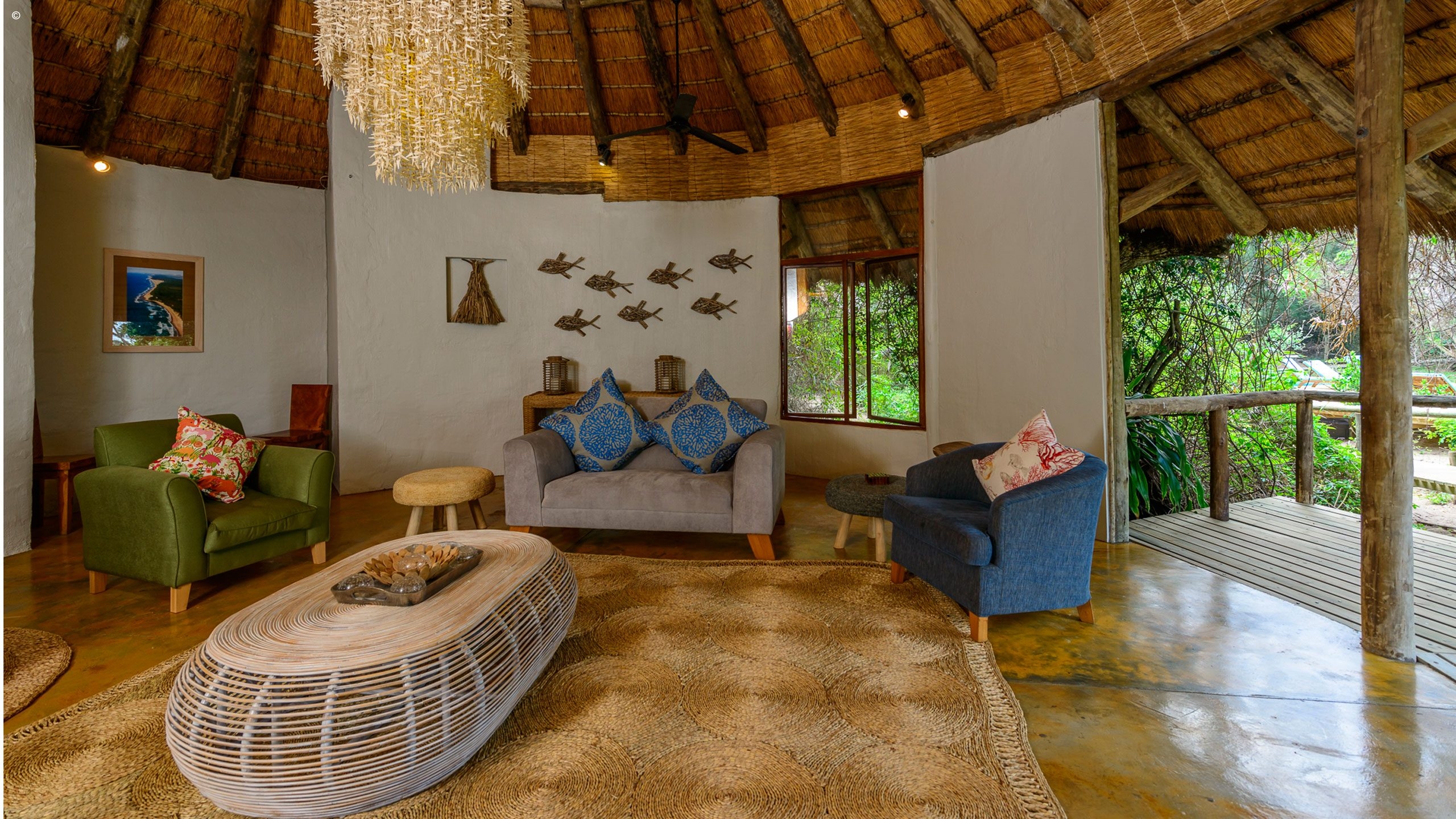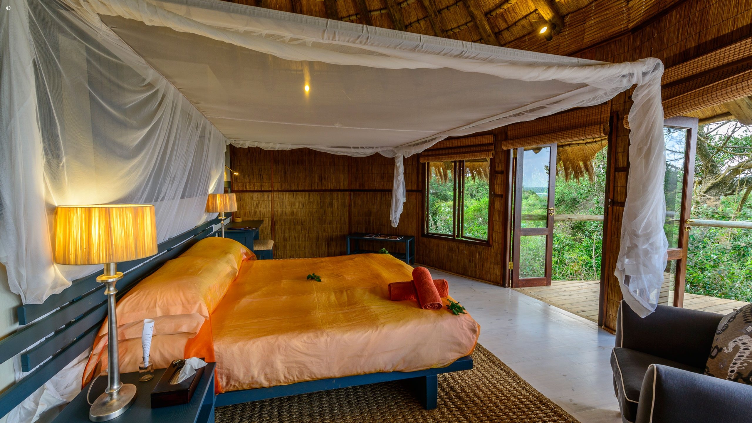 Accommodation is in 12 “Robinson Crusoe-chic” rooms. The thatched en-suite rooms have been carefully constructed in the coastal dune forest to ensure minimum impact on the environment whilst still ensuring maximum guest comfort. Each 50 m2 room has a double vanity, stone bath, indoor shower, separate toilet, bar fridge, ceiling fan, mosquito net, private balcony. All rooms are air-conditioned.