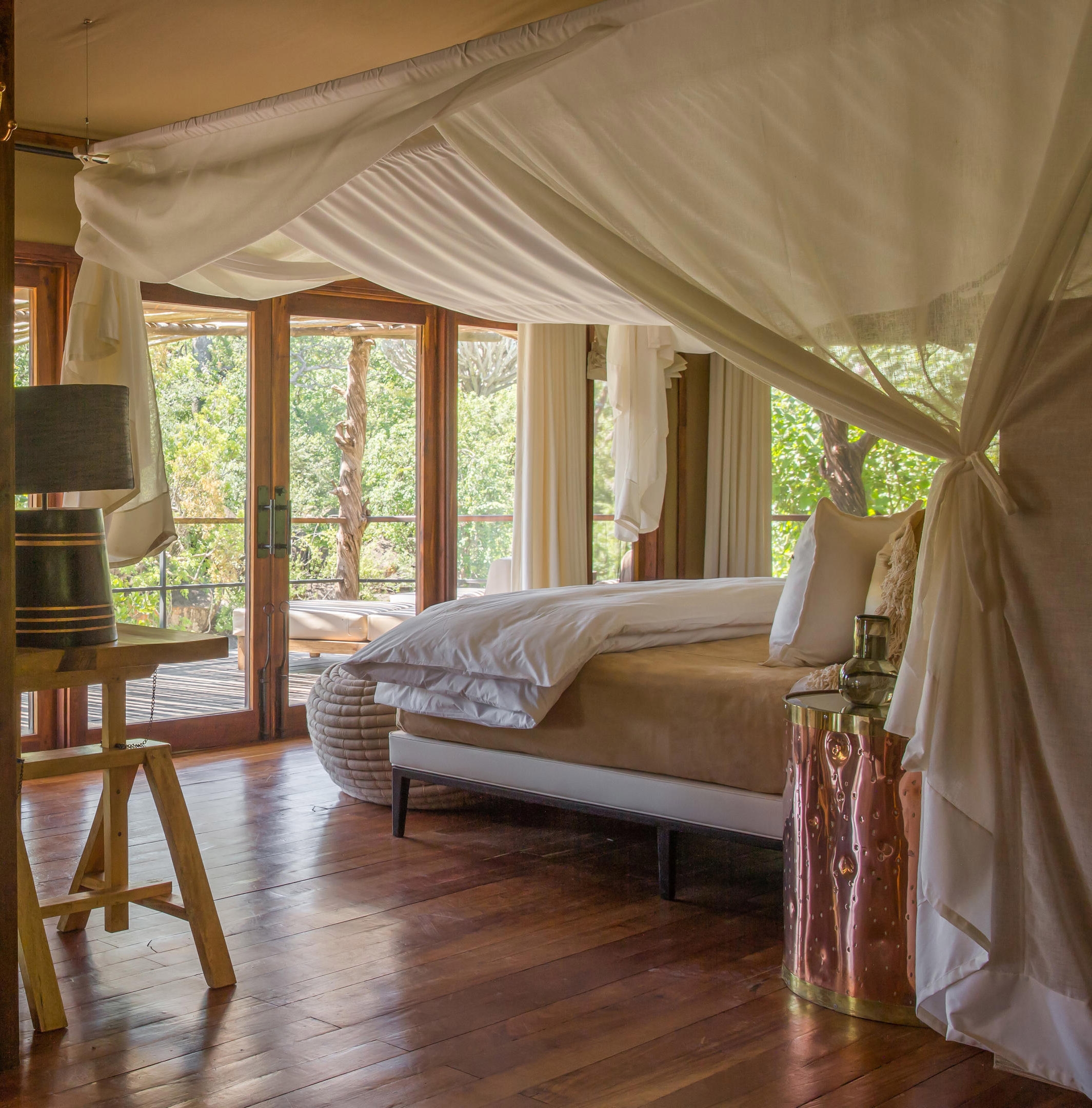 Eight luxury tented suites are widely spaced to ensure absolute privacy, sat on the edge of a palm island overlooking Lake Manyara waters. One is a family suite with two bedrooms.