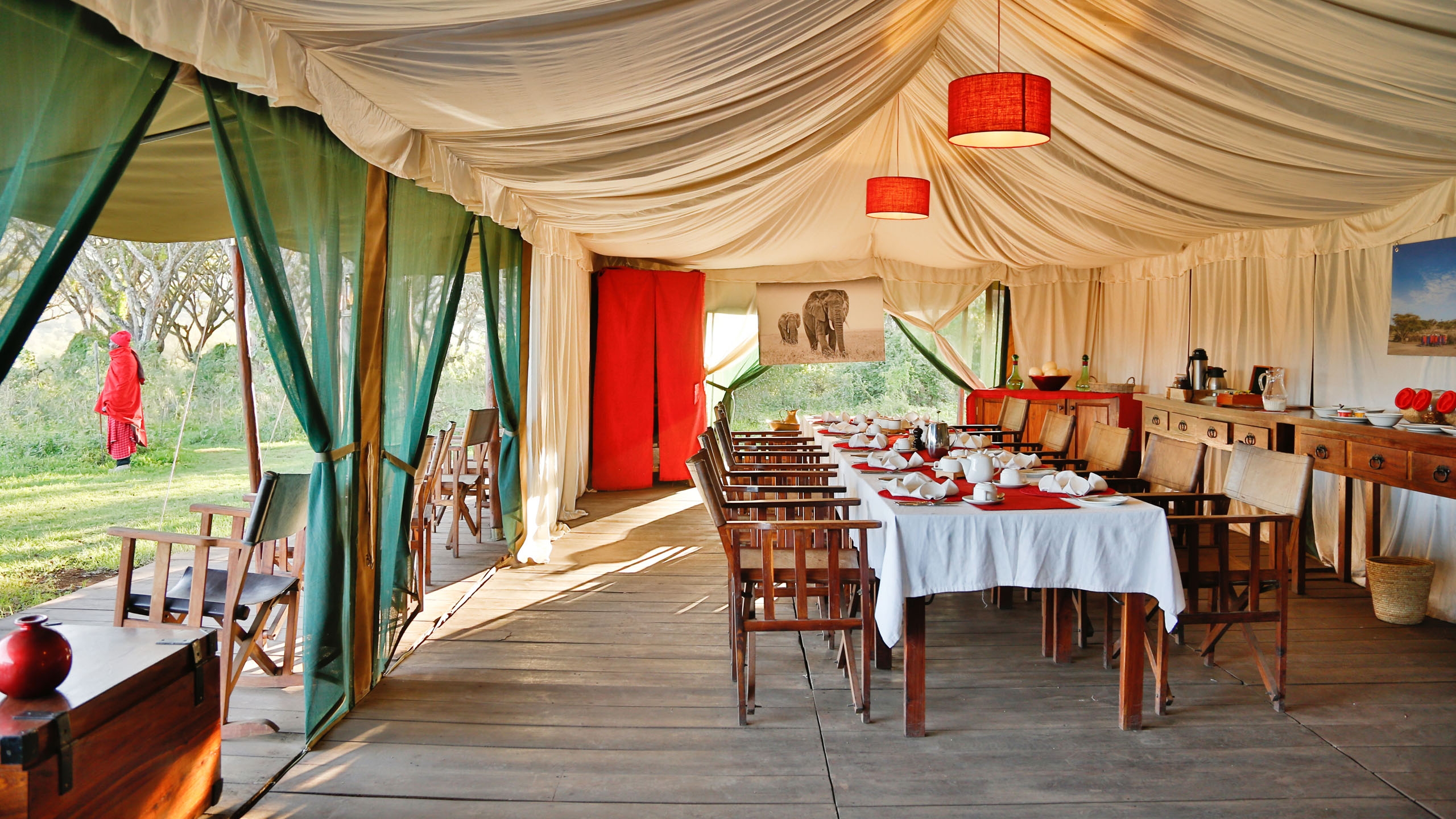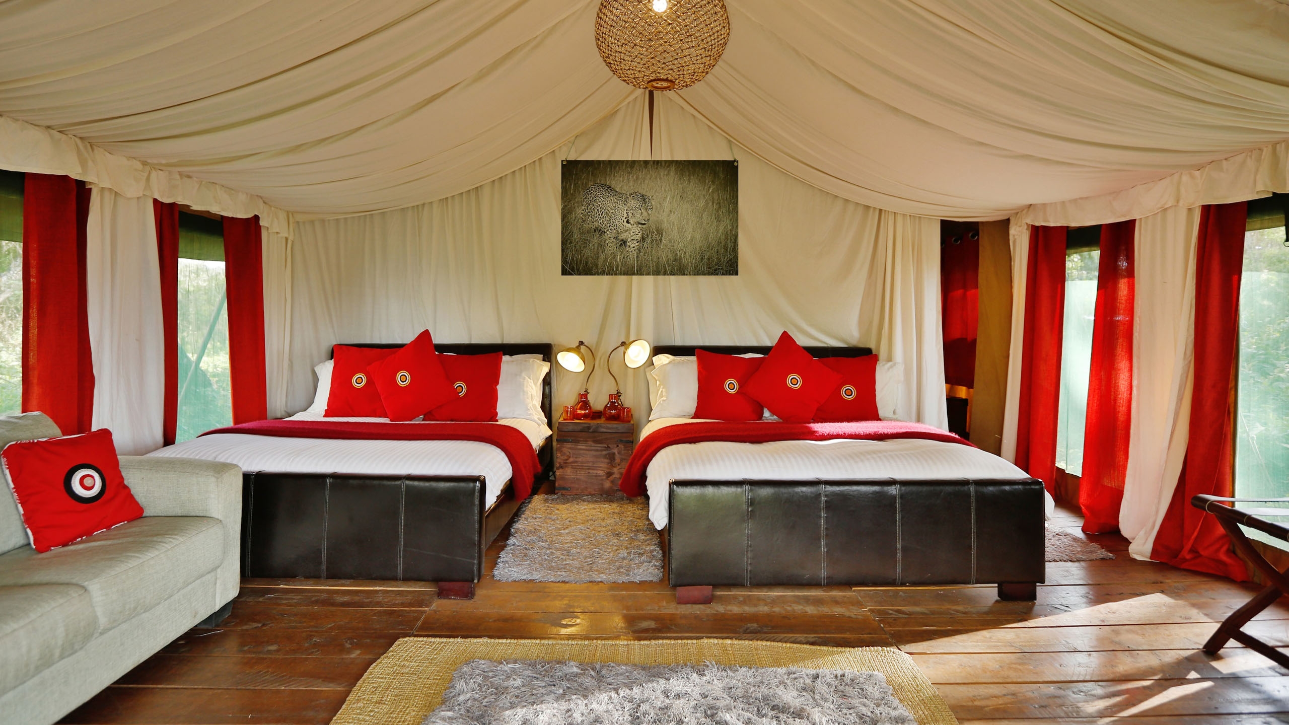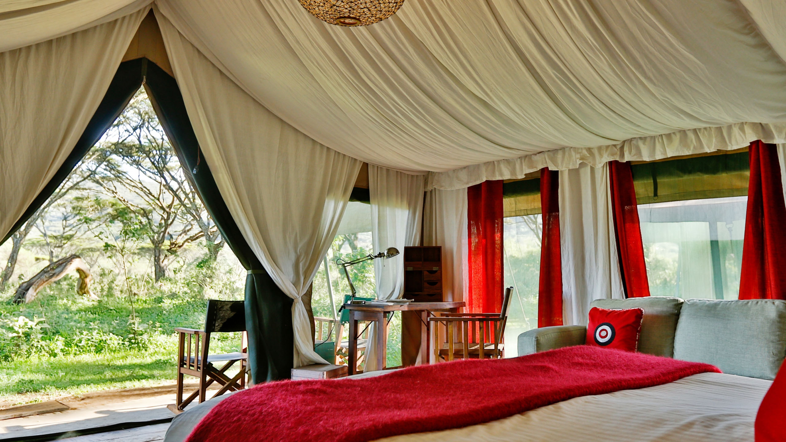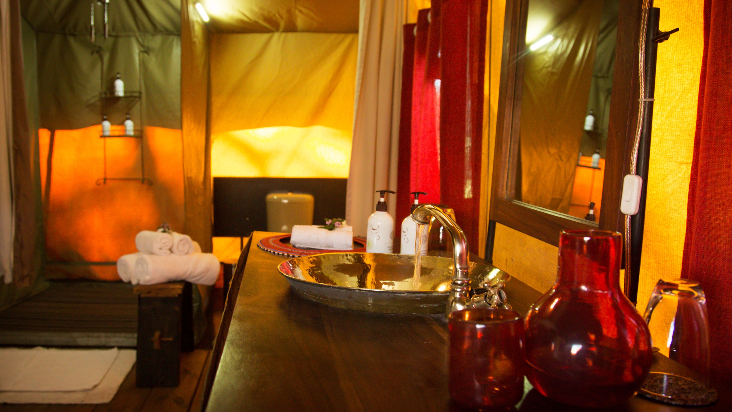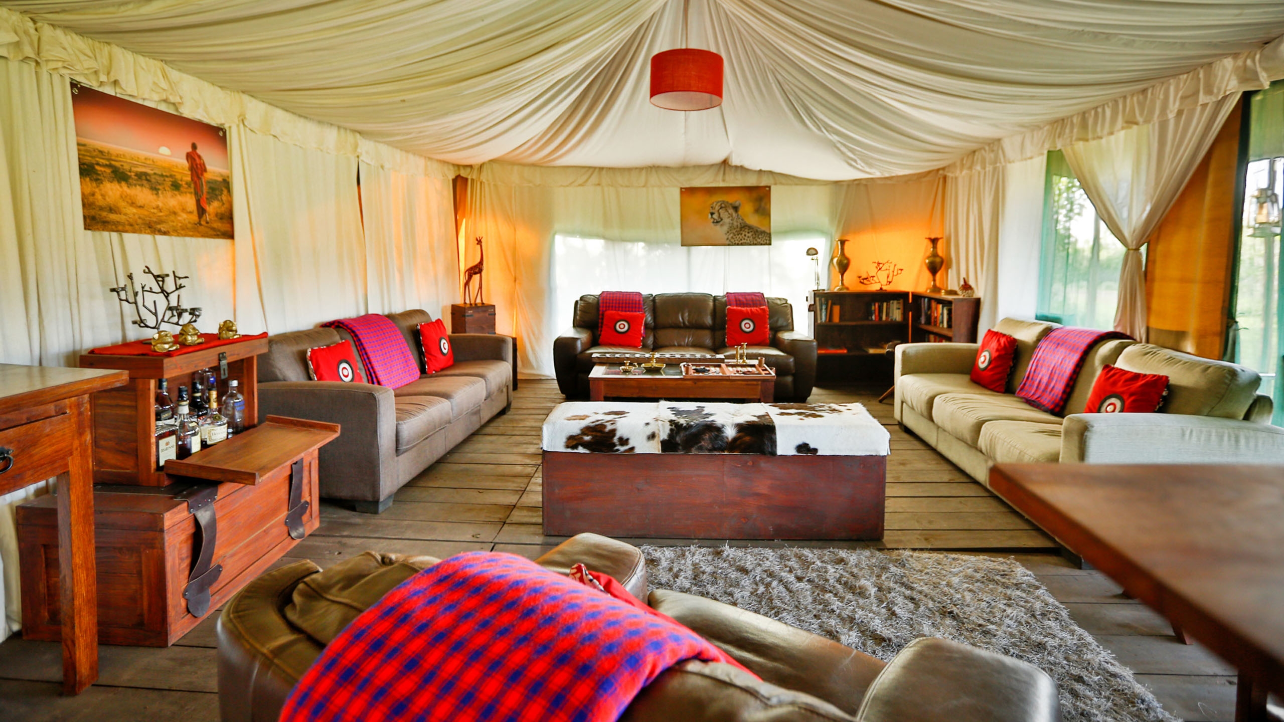 The mess tent is beautifully furnished with grand sofas, lamps, book shelves and corner cabinets in old wood, chests and rugs. In the evening, you all gather around the campfire for sundowners before dining under chandeliers,