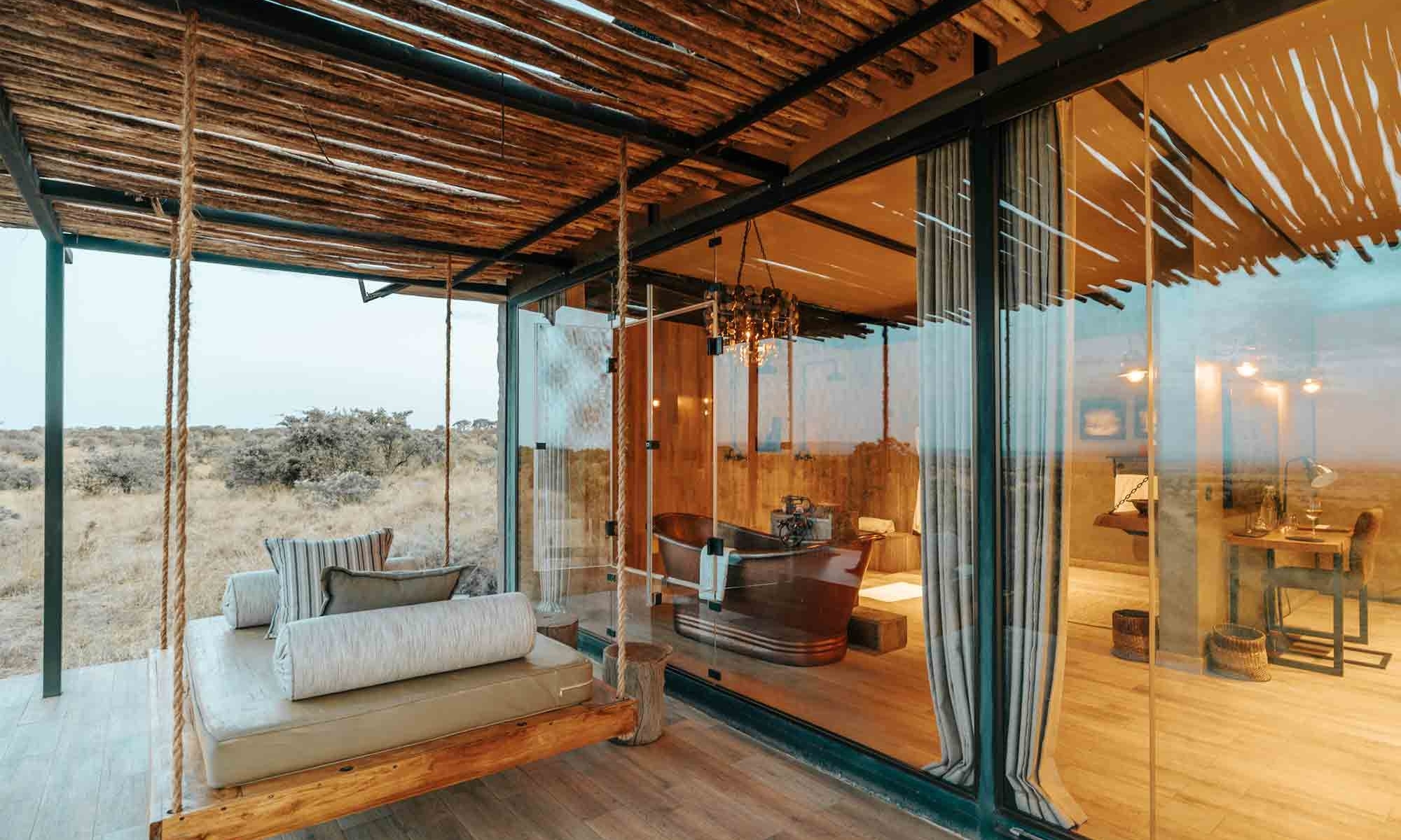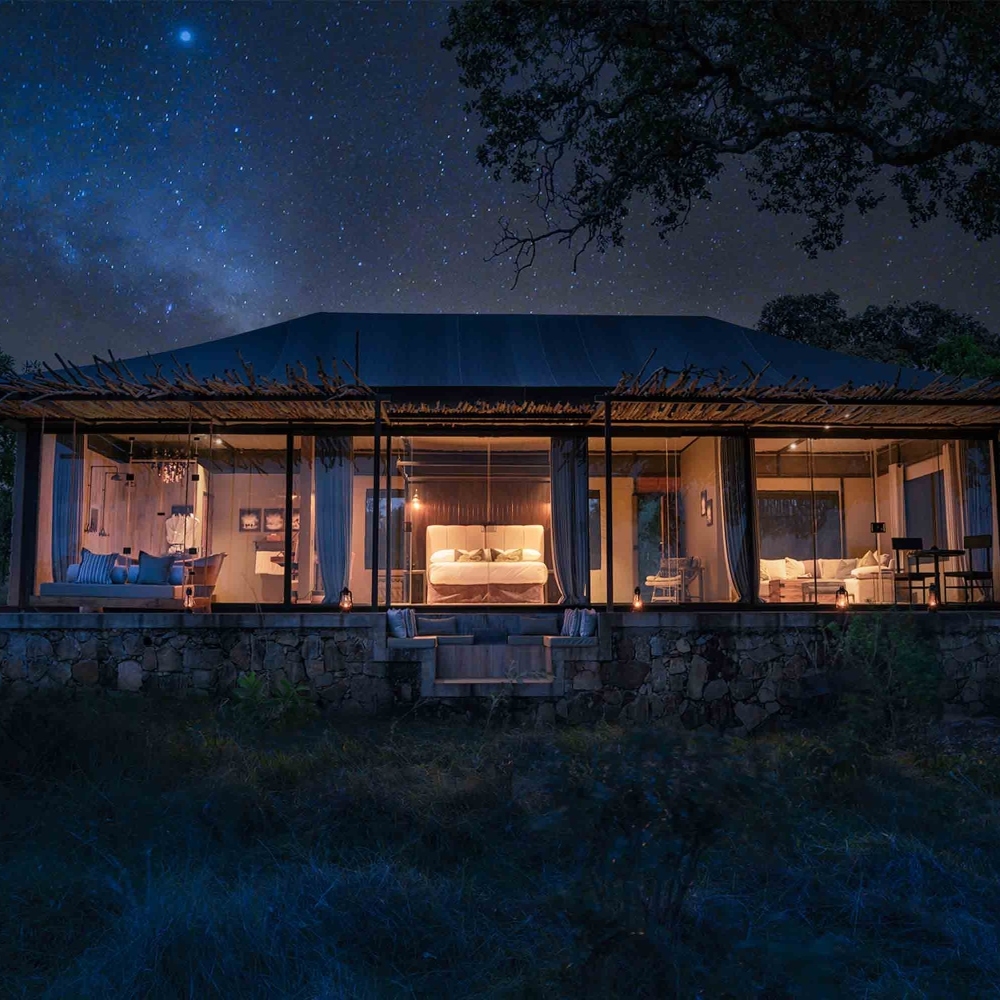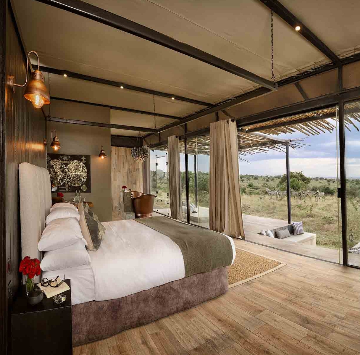 The camp is constructed with a mix of natural materials for a contemporary take on the traditional tented camp. Here, canvas roofed luxury suites combine with wooden floors, enormous glass windows and dry stone walls that echo the kopje rock formations all around. This boutique camp feels intimate with just 10 suites, positioned for privacy and exceptional views. From the uncluttered beauty of the interior spaces, to the glass wall overlooking the vivid landscape and captivating wildlife, this is a meticulously designed haven that encourages stillness and serenity.