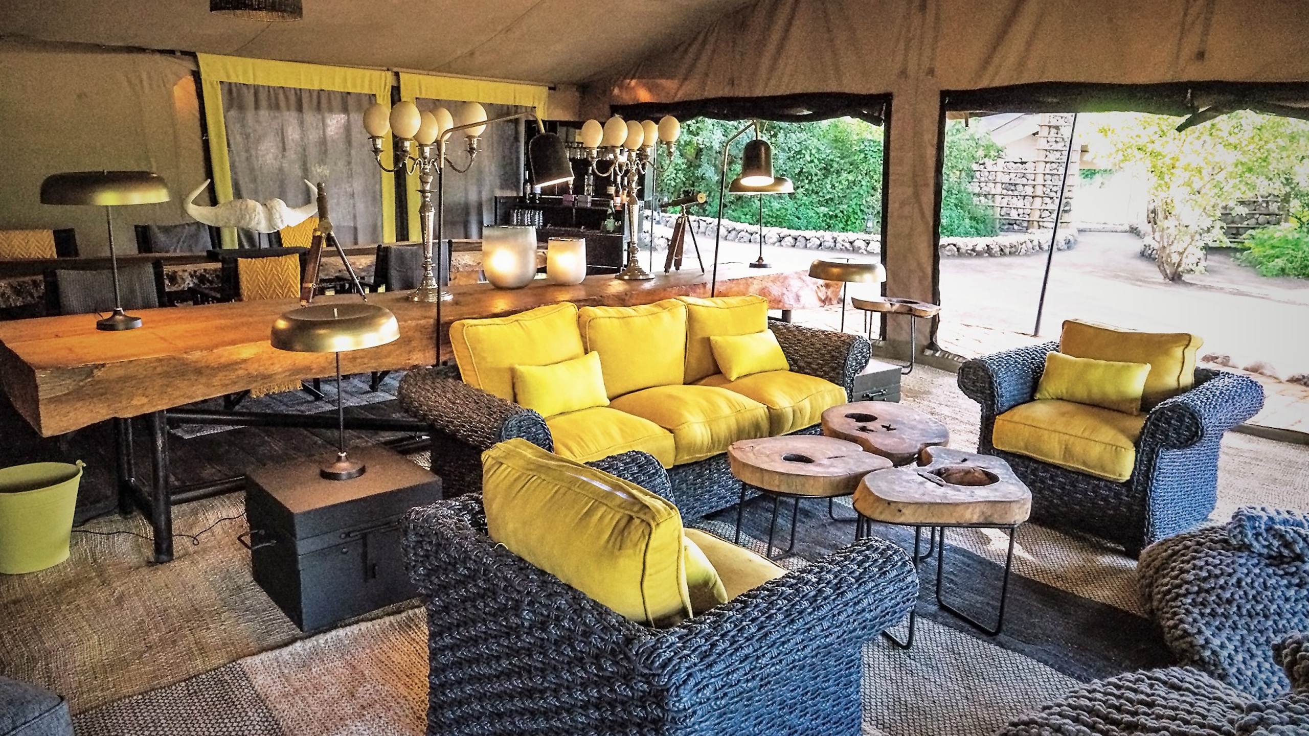 The camp consists of two vintage-style safari tents and one two-bedroom family tent, all with indoor and outdoor showers. Accommodating up to six adults and two children, it is perfect for families or small groups looking for an intimate safari experience. A soft yellow, grey and black colour scheme is carried throughout the camp, and there is an elegant lounge tent, a fire pit and outdoor swing bed.