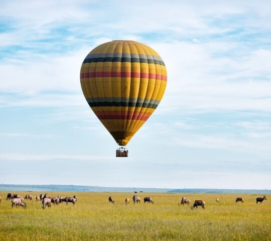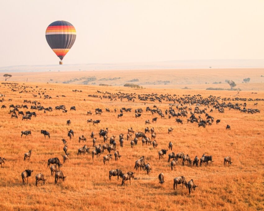 Drift above the golden terrain of the Maasai Mara in a hot air balloon. From this elevated viewing point, the vastness of the Mara reveals itself in breathtaking scale. Watch as herds of animals move in slow procession across the plains. If you’re travelling during the migration season, you may even witness the great wildebeest herds making their way across the landscape.