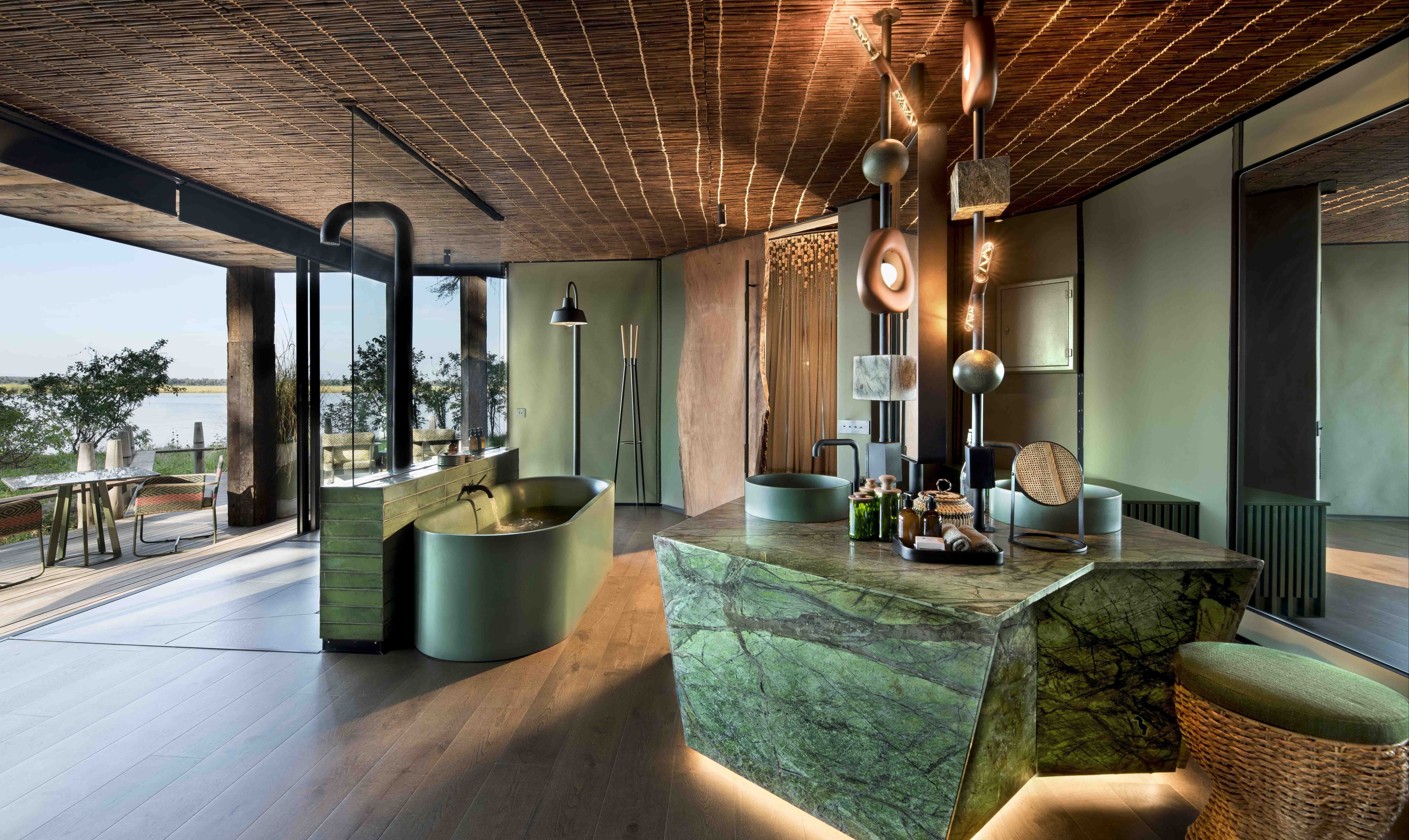 Lolebezi’s design embraces both contemporary elegance and African heritage, set amidst the majestic Acacia trees. Dotted throughout the lodge are artworks which honour the local culture and craftsmanship. Natural materials, like green rainforest marble, are skillfully incorporated throughout, enhancing the lodge’s integration with its surroundings. Each private suite here is a haven of luxury, with spacious bathtubs and serene plunge pools overlooking the Zambezi River. The suites boast marble vanities and both indoor and outdoor showers.