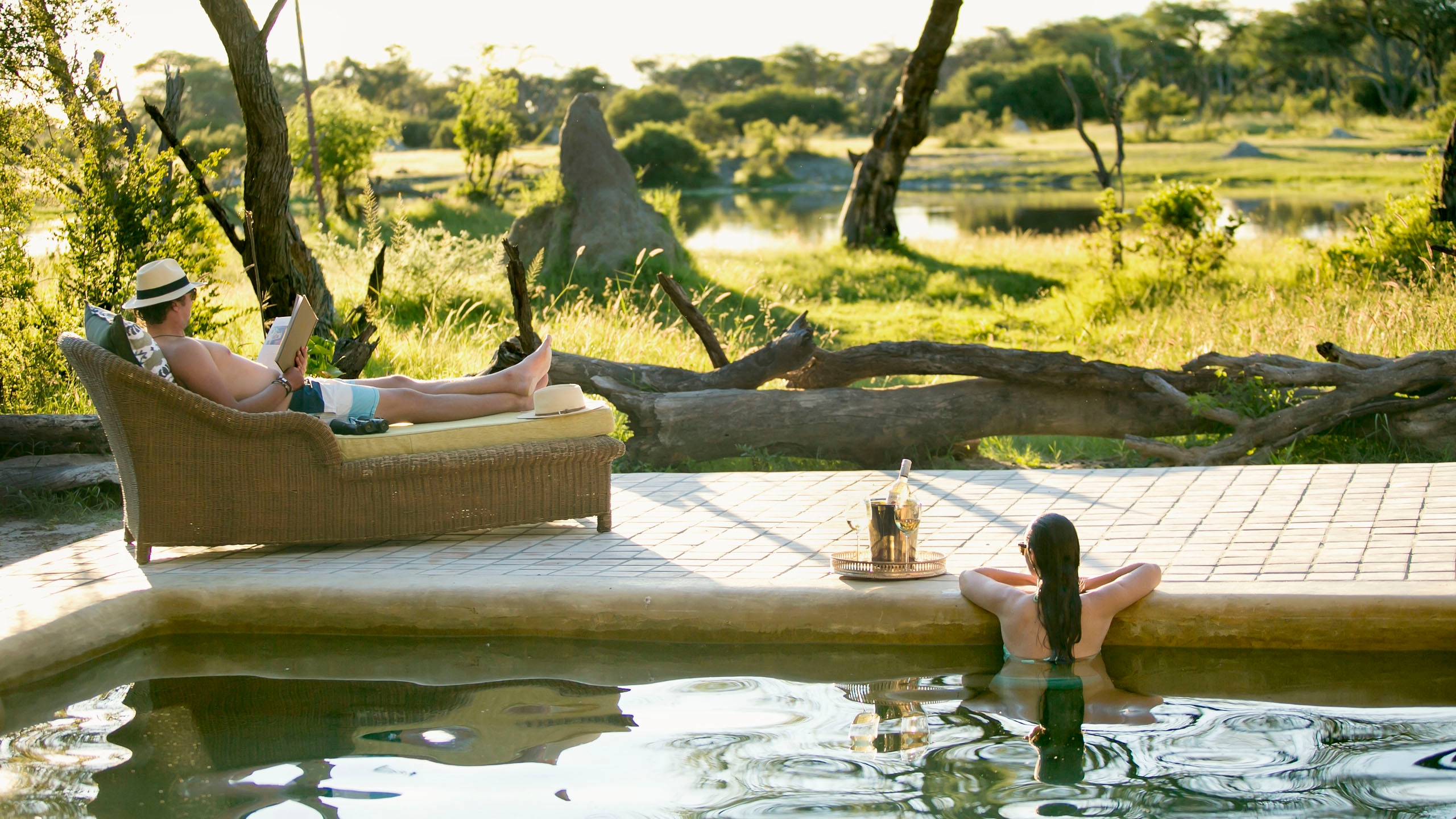 The hub of the camp is the ‘A-frame’ which houses the dining room, a downstairs sun lounge and a large comfortable lounge area upstairs. There’s also a plunge pool near the main lounge and dining room, and a tunnel leading to a wine cellar and hide.
