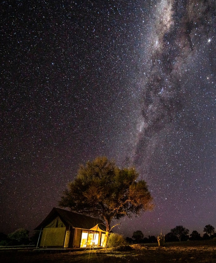 Nine en-suite luxury tents and one family tent overlook the waterhole, with the communal areas, including a pool area and a winter lounge complete with library, enjoying the same view.