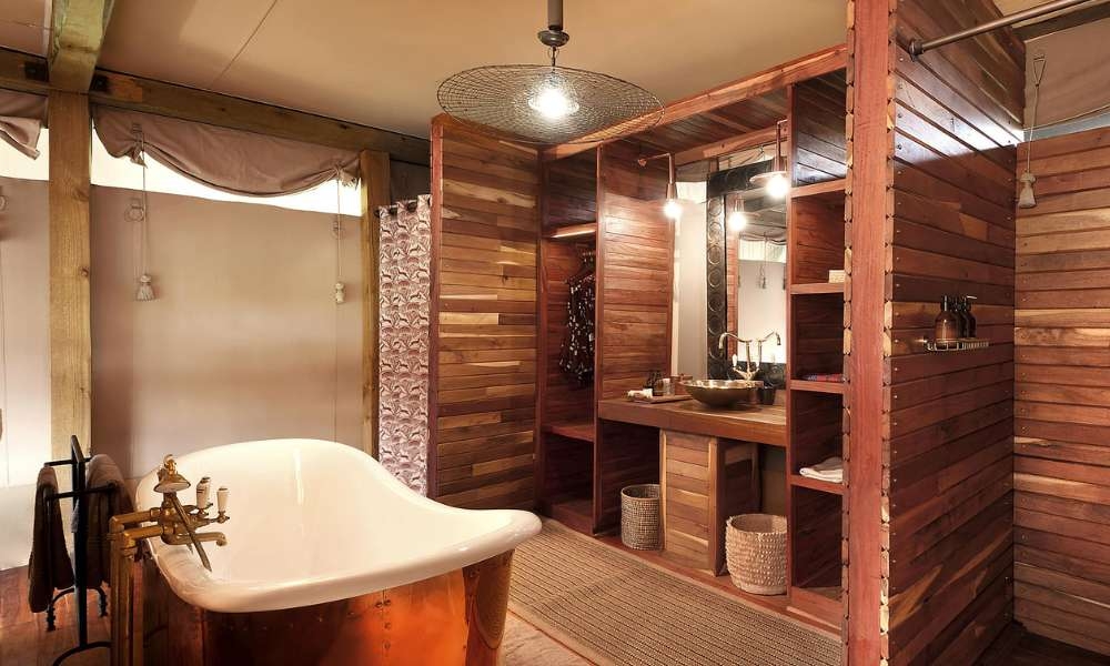 The camp consists of seven luxury tents with gauze sliding doors and plush furnishings. There is a glass wood burning stove for chilly evenings and floor fans for hot summer days. There is a freestanding copper bath tub in each tent, as well as indoor and outdoor showers and a flush toilet.