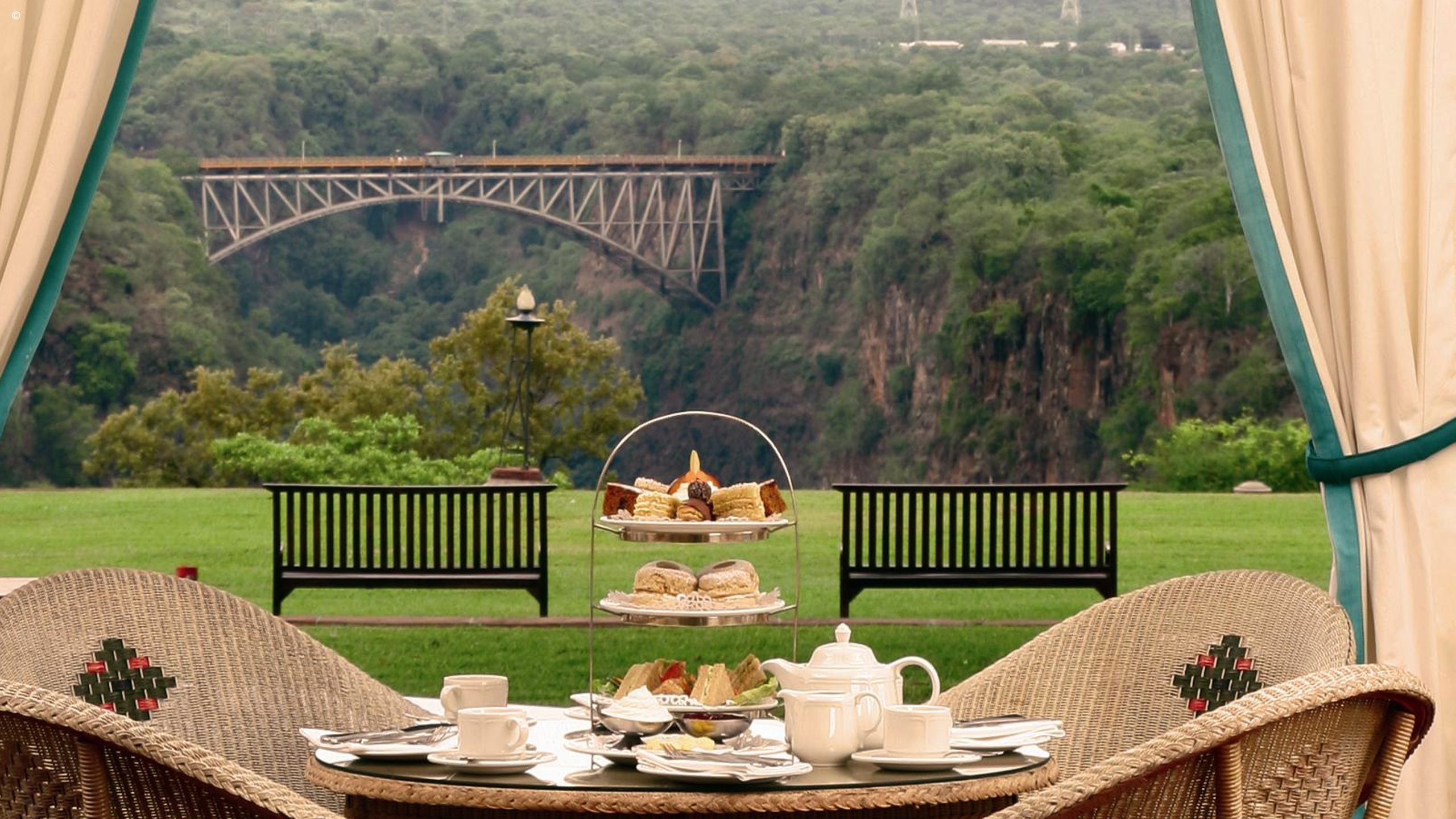 One of the best things about the Victoria Falls hotel is its position, being seated just ten minutes’ walk away from the cascades along one of the hotel’s private pathways. There is nothing quite like taking afternoon tea on the Stanley Terrace, listening to the muted roar of the falls, and a royal view of the rising mist from the ‘smoke that thunders’ and the silhouette of the Victoria Falls bridge that links Zimbabwe with Zambia.