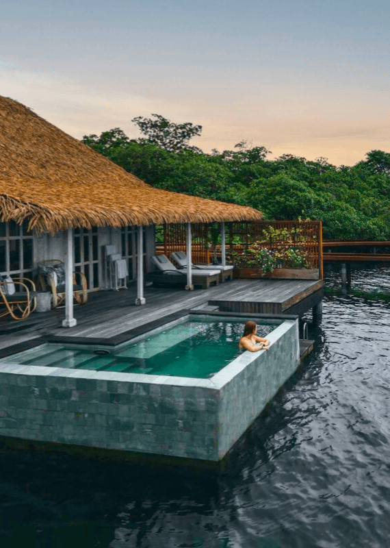 Although it’s located off the coast of Panama, this lovely resort reflects an unmistakably Balinese style. Nayara Bocas del Toro has 18 adults-only overwater villas with private plunge pools, swim-up staircases, canopy beds and glass floor panels that allow you to observe marine life from above.