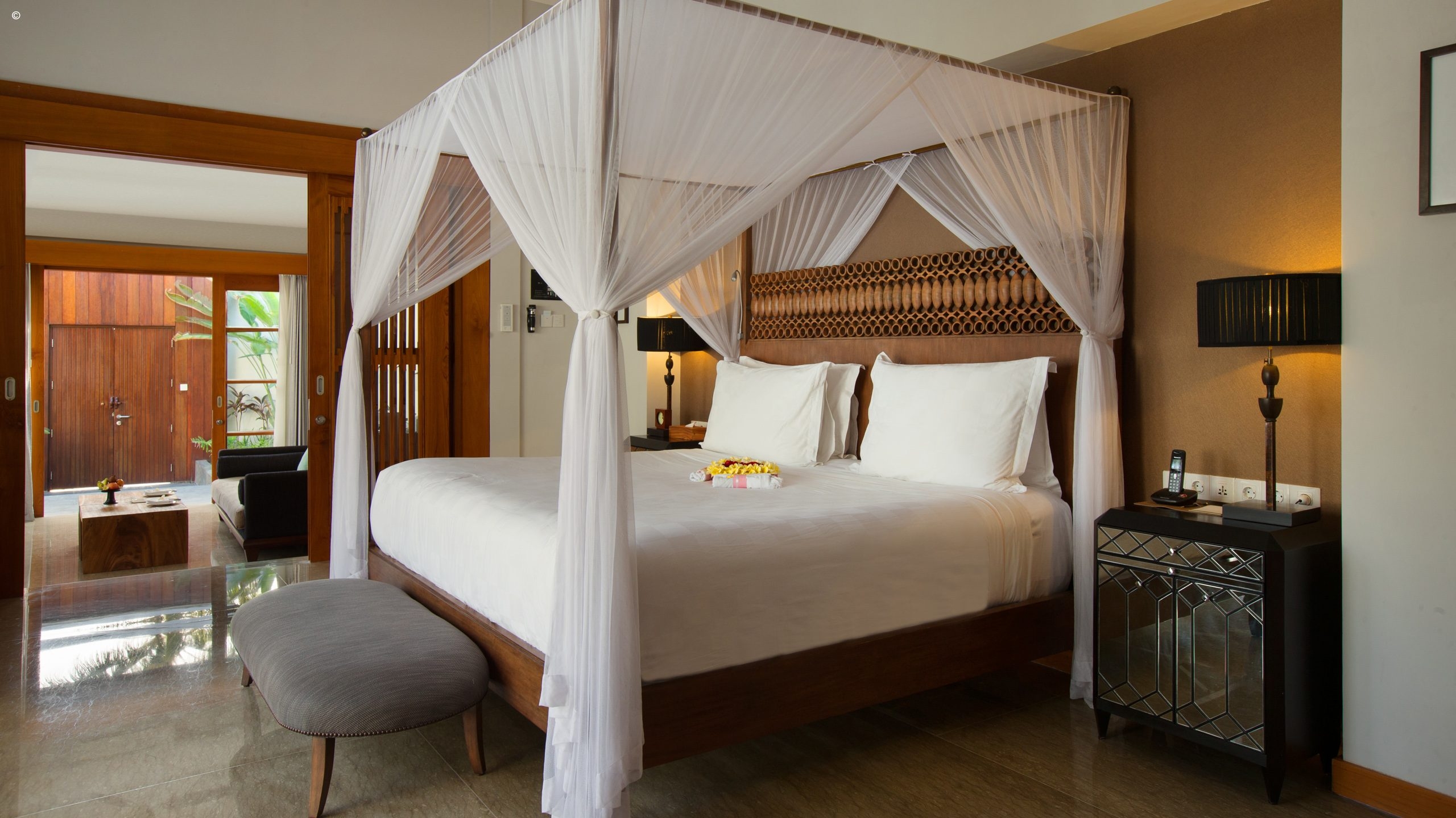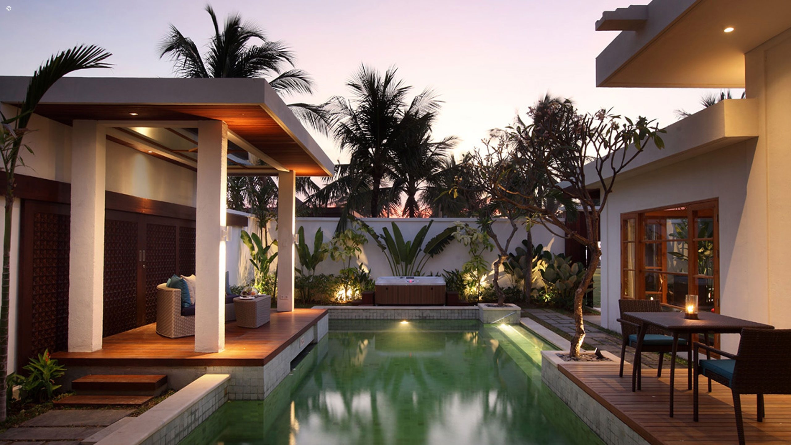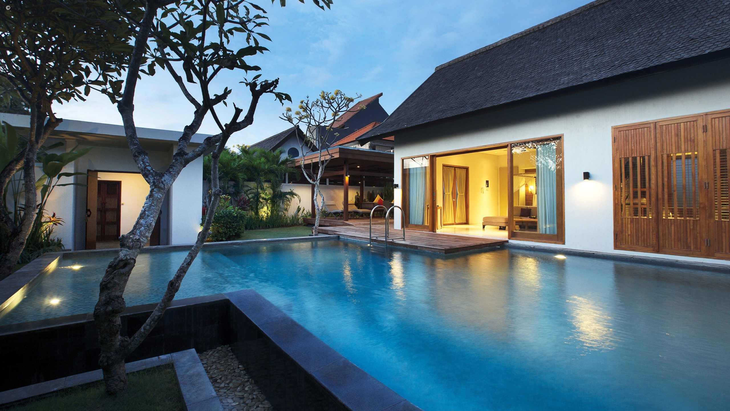 The rest of this intimate hotel is inspired by traditional Balinese architecture yet constructed in a modern design, based upon space and light. The hotel has an open-plan design that allows natural light to flood its communal spaces, plus a landscaped pool area leading to the beach in front. At night, carefully positioned lamps give the hotel a soft-lit ambiance.