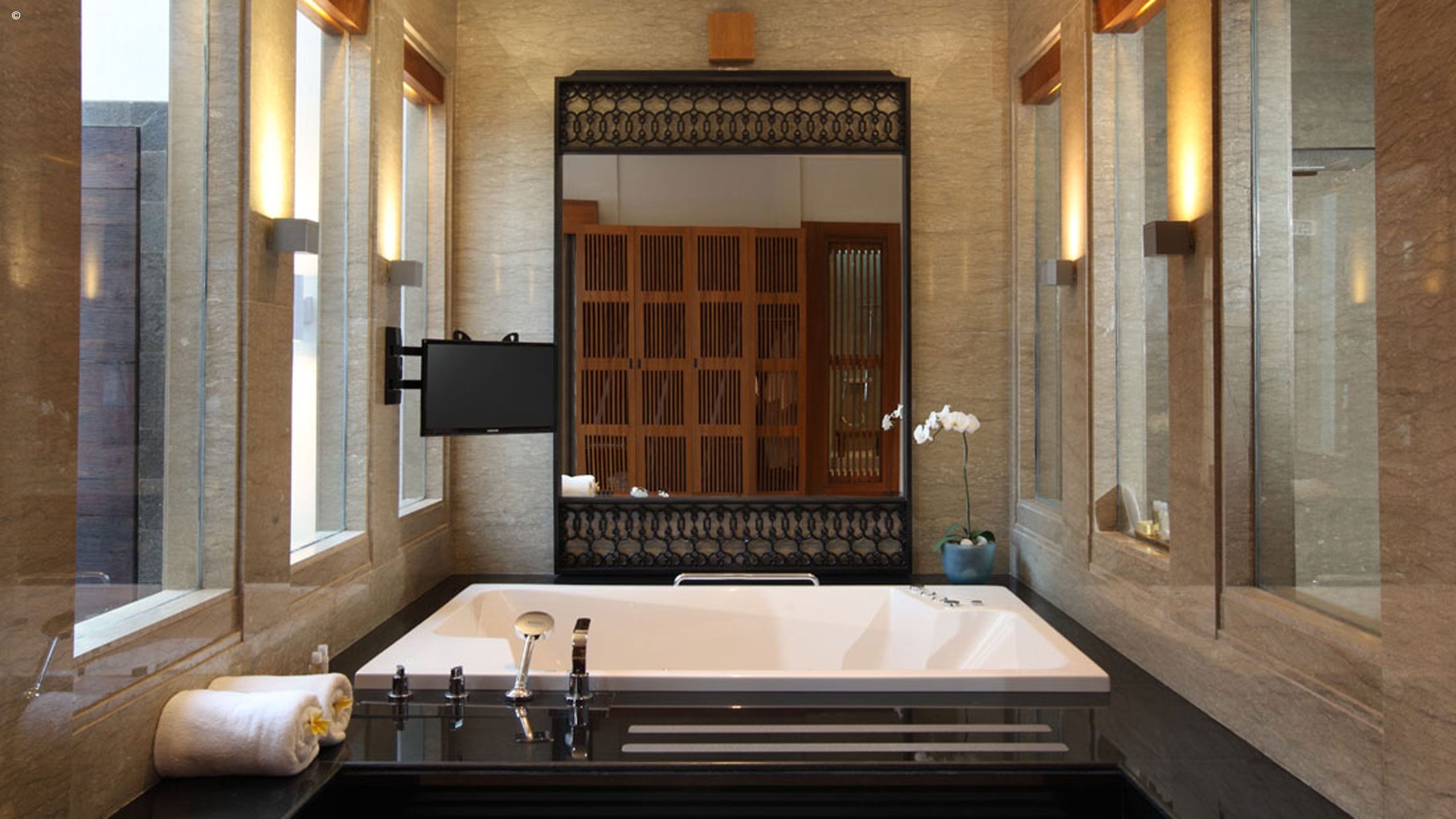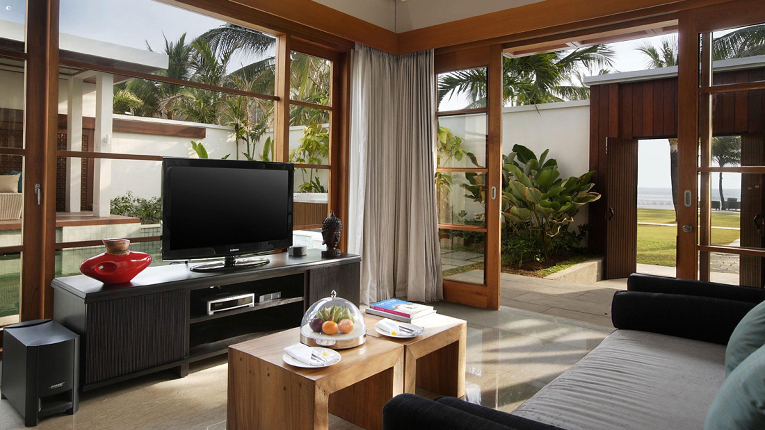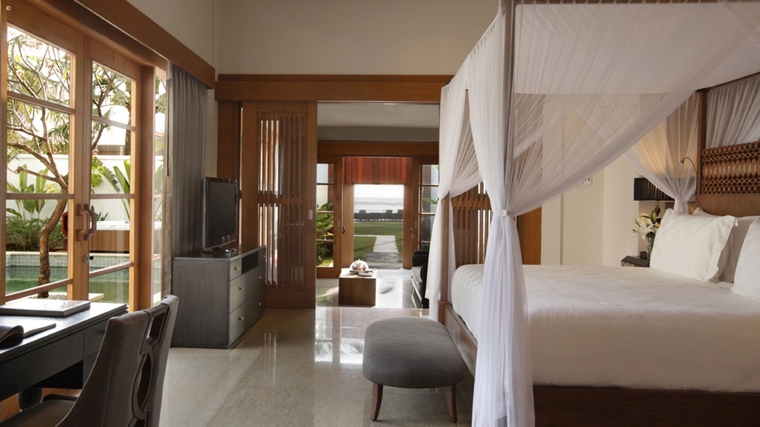 The rest of this intimate hotel is inspired by traditional Balinese architecture yet constructed in a modern design, based upon space and light. The hotel has an open-plan design that allows natural light to flood its communal spaces, plus a landscaped pool area leading to the beach in front. At night, carefully positioned lamps give the hotel a soft-lit ambiance.