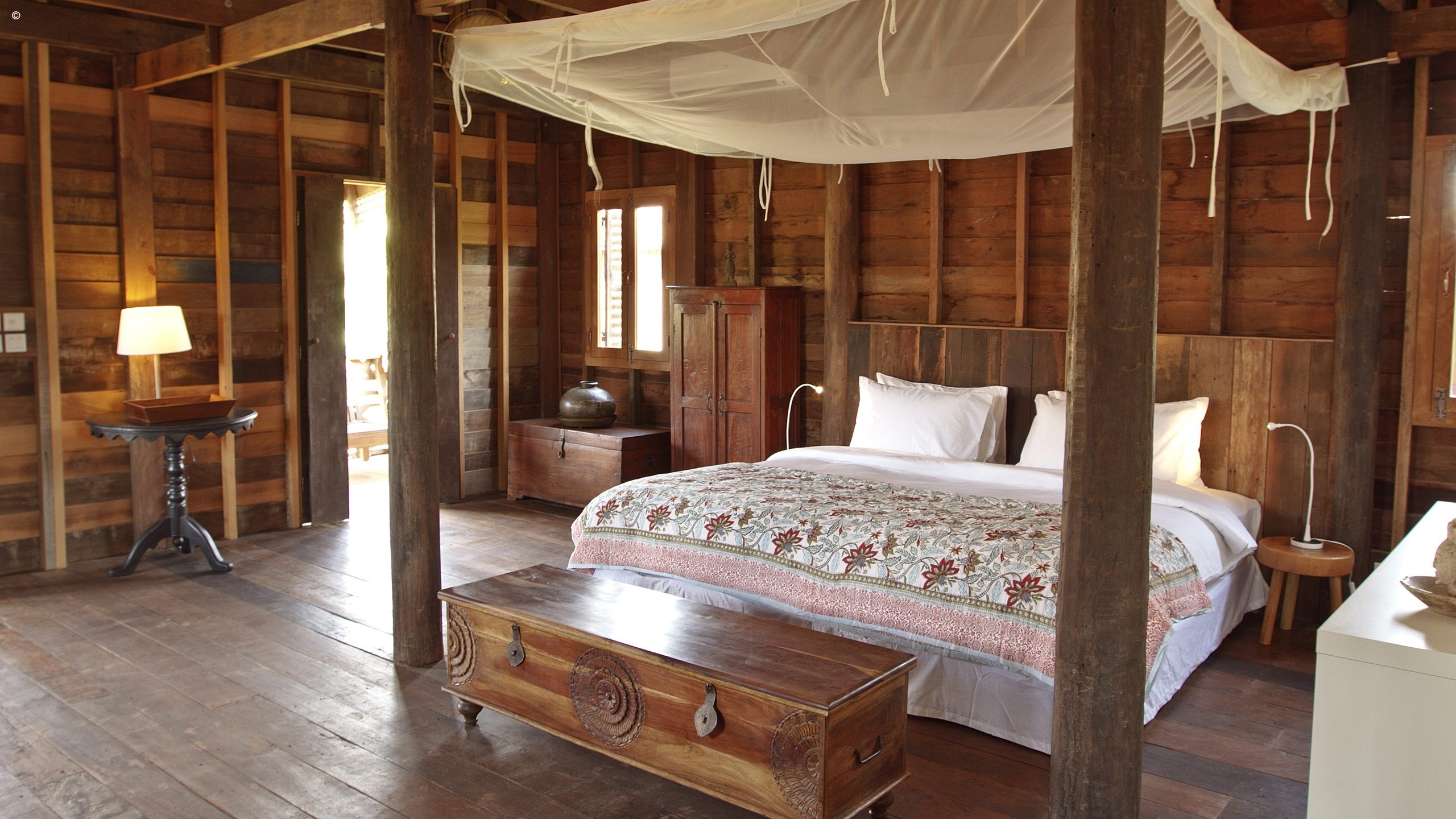 The eleven stilted wooden houses were purchased from nearby villages, dismantled, transported and beautifully restored, now providing tremendously comfortable lodgings with their individual character intact.