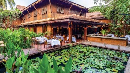 Verdant gardens, warm wood accents and traditional touches lend an enchanting essence to La Résidence d’Angkor: one of Siem Reap’s oldest and most renowned luxury hotels. Its courtyard boasts an abundance of lush vegetation and a serene saltwater pool, making it easy to forget that you’re in the city at all.