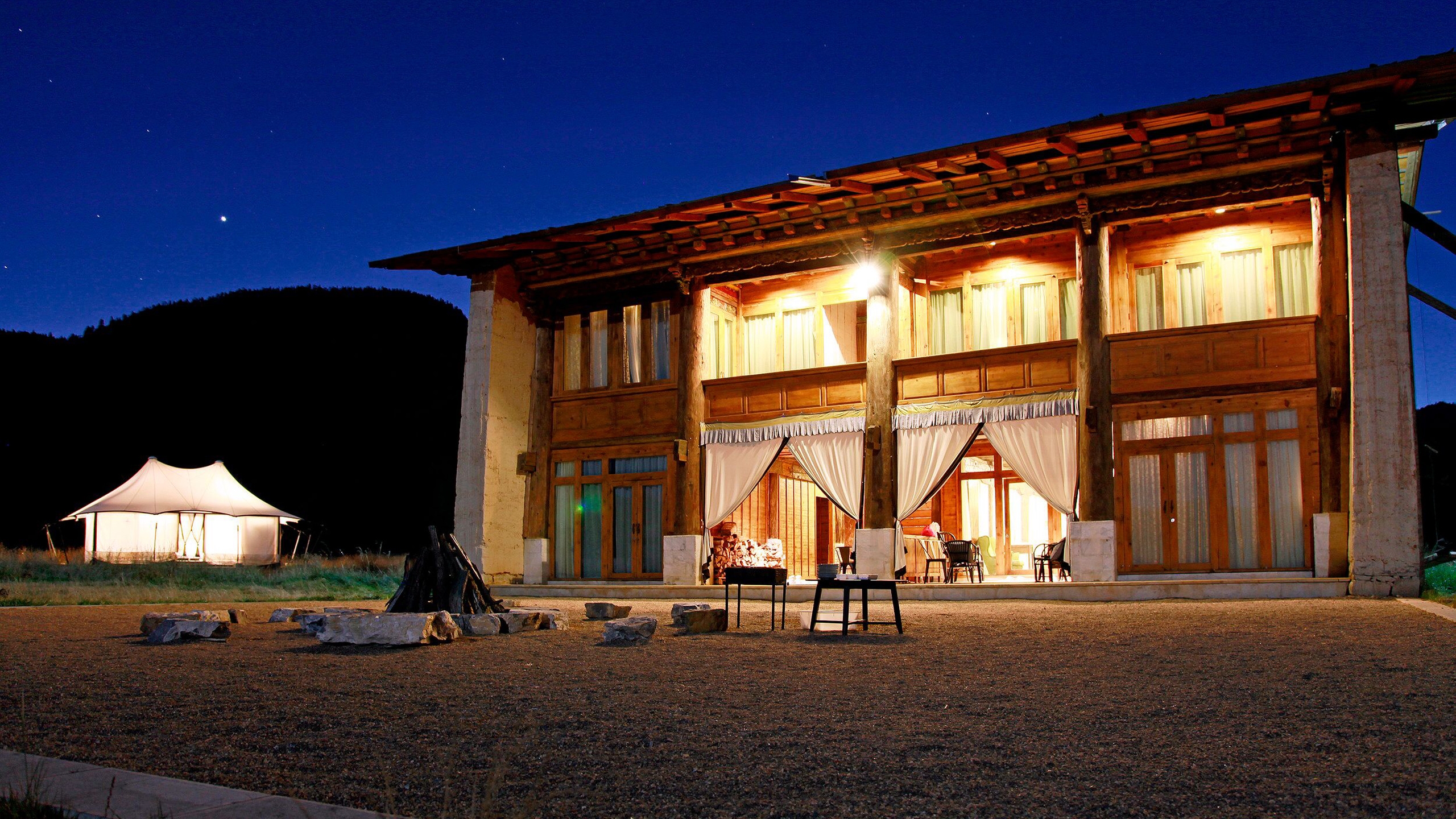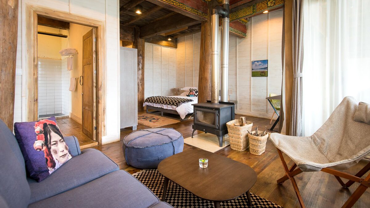 Consisting of four tented villas and nine rooms set within a 150-year-old refurbished Tibetan residence, the dominating theme throughout is that of old-world charm mixed with contemporary design. The tents allow guests to glamp under the stars, reflecting the livelihood of the Tibetan nomads, but enhanced by modern comforts which include heated mattresses, convenient furnishings and fireplaces. The rebuilt Tibetan residence was transported log by log from its original location and today houses nine unique guest rooms and many charming and cosy communal areas.