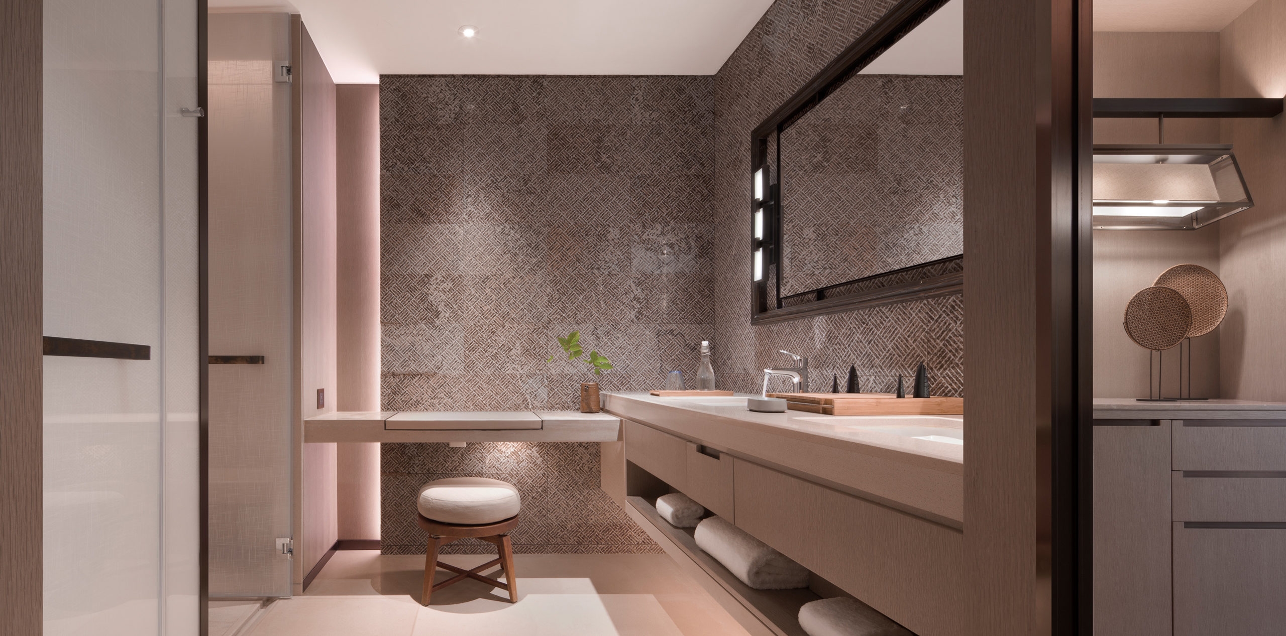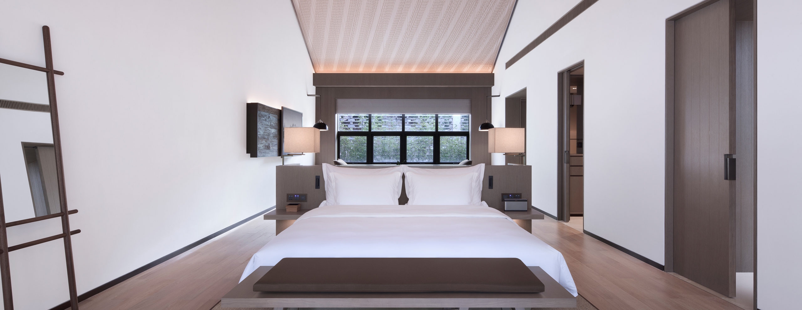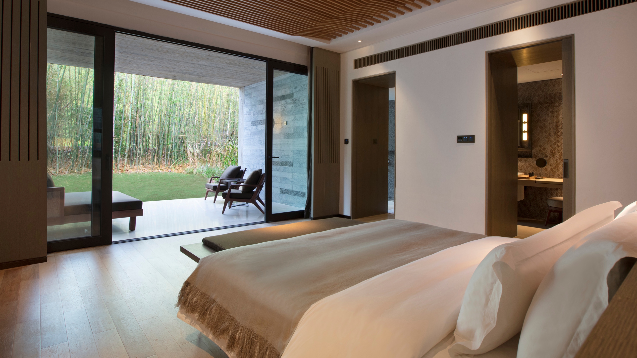 In keeping with the natural world around it, the main guestroom building uses a combination of local stone and bamboo. Meanwhile the 117 rooms and suites feature large open spaces with simple colour palettes and bathrooms boasting rain showers and twin bathtubs, perfect for achieving true relaxation.