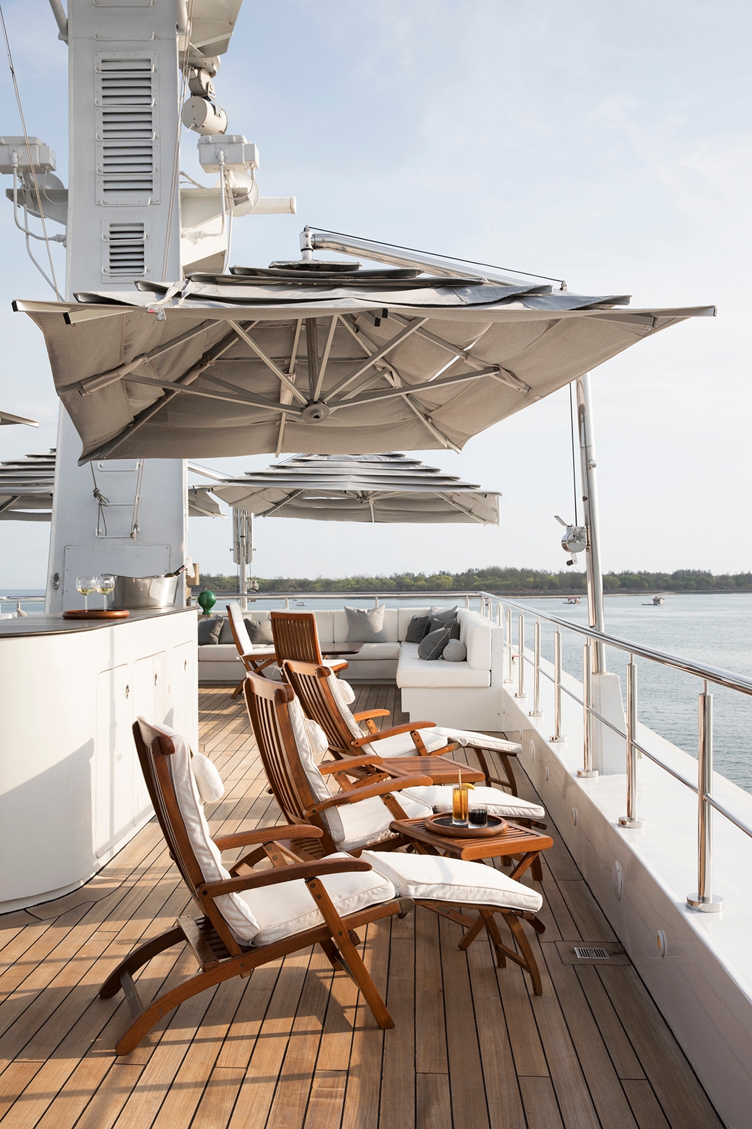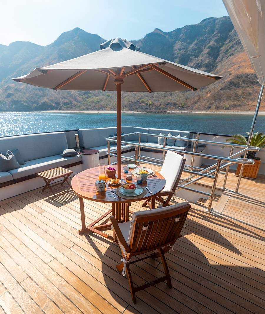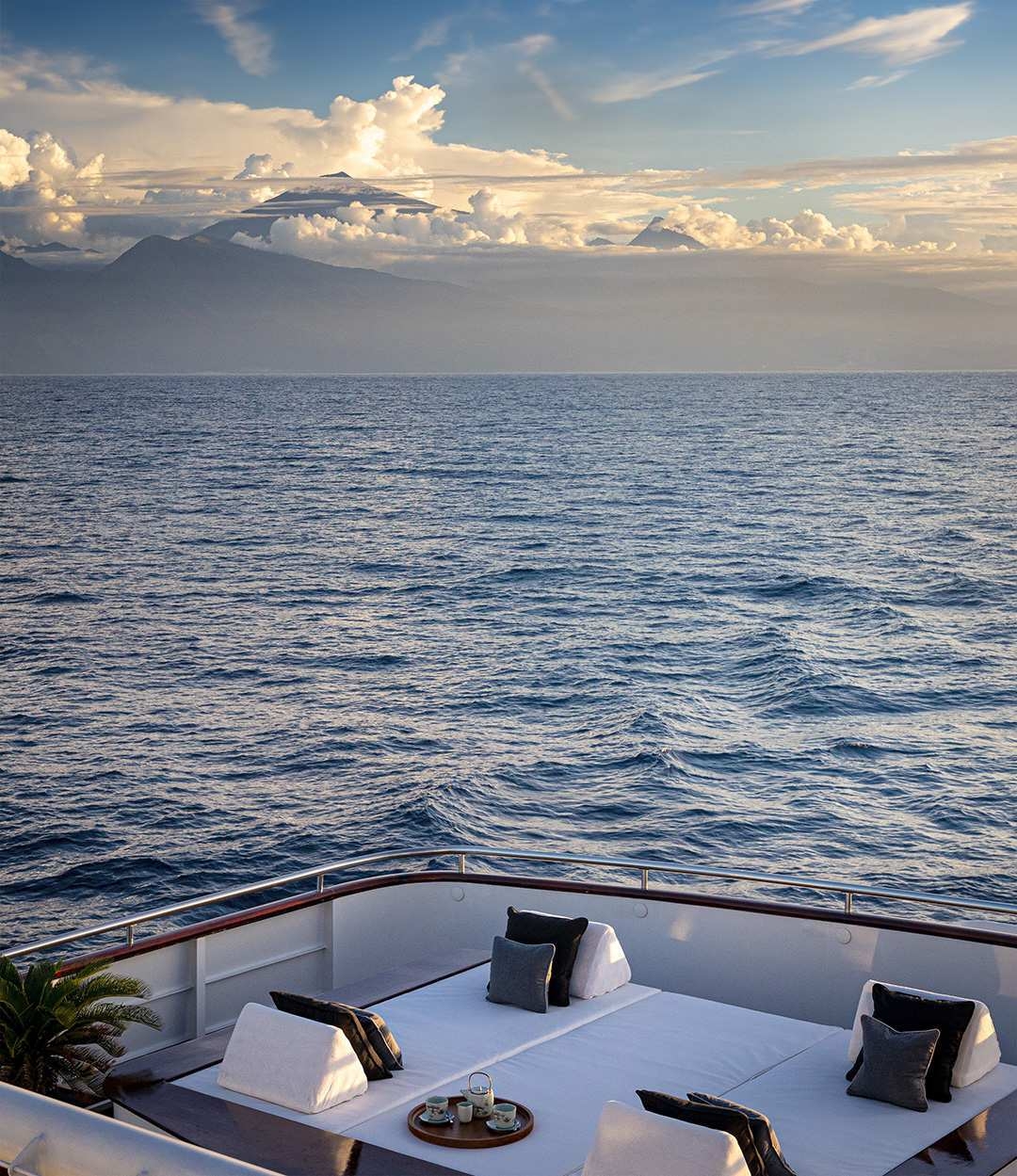 When the sun sinks behind the sea, retreat to the sundeck’s al fresco lounge to enjoy starlit gatherings. Or slip into one of the outdoor Jacuzzis to watch wild shorelines and clear blue waters slowly unfold around you against a pastel-coloured sky. Dinnertime follows cocktails and canapés as stars emerge overhead. You’ll taste flavours that celebrate the region’s rich history as the epicentre of East Indonesia’s spice trade.