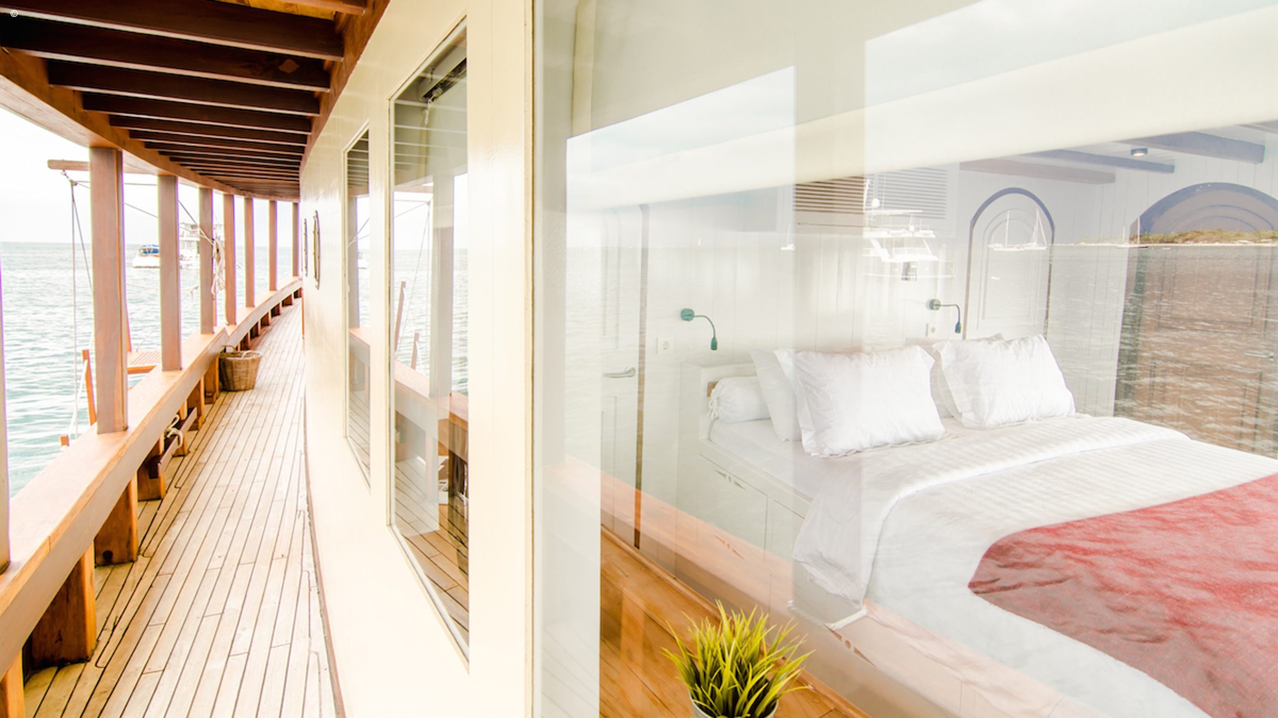 The wraparound deck offers 360 degree views of the water and the islands, and the large, airy lounge and bar area is perfect for congregating in the evenings with a drink. A combination of Indonesian and Western dishes are served on board.