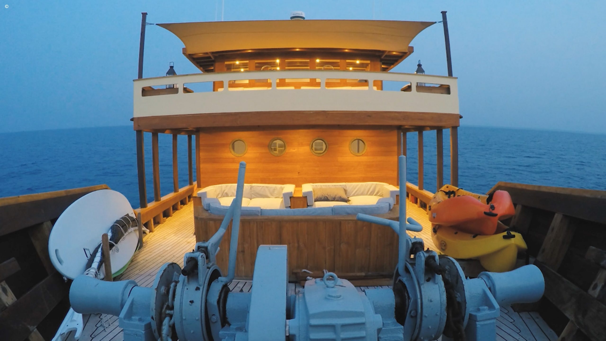 Spacious and elegant, the vessel features three en-suite cabins positioned above the deck. Large windows allow plenty of natural light and means guests can enjoy the wonderful views while cruising through the emerald waters. Cabins feature natural teak floors and a sophisticated colour scheme of cream with flashes of red.