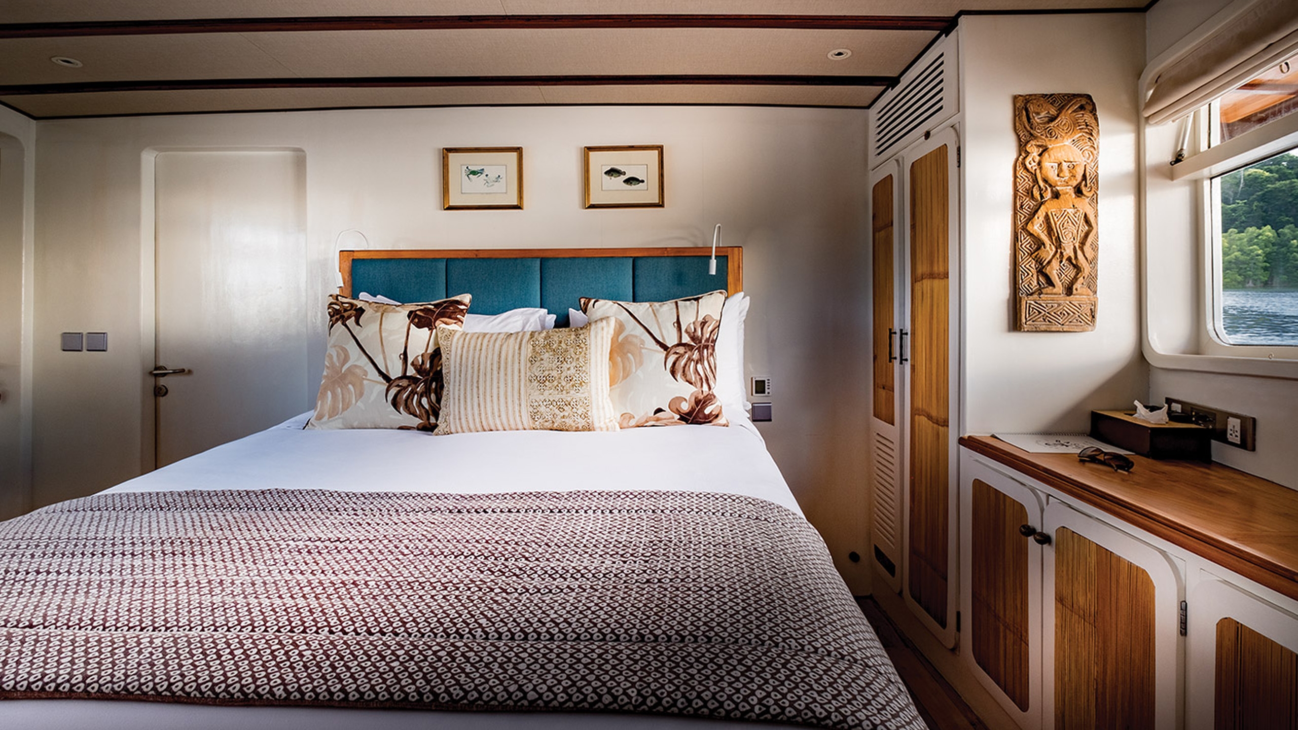 Each positioned above deck, with wooden furnishings, local artwork, and tropical patterns, the cabins are individually decorated. Spacious and airy, every cabin has air-conditioning, music systems and flat-screen TVs. Bathrooms are sizeable, with tailor-made fittings and hot water showers.