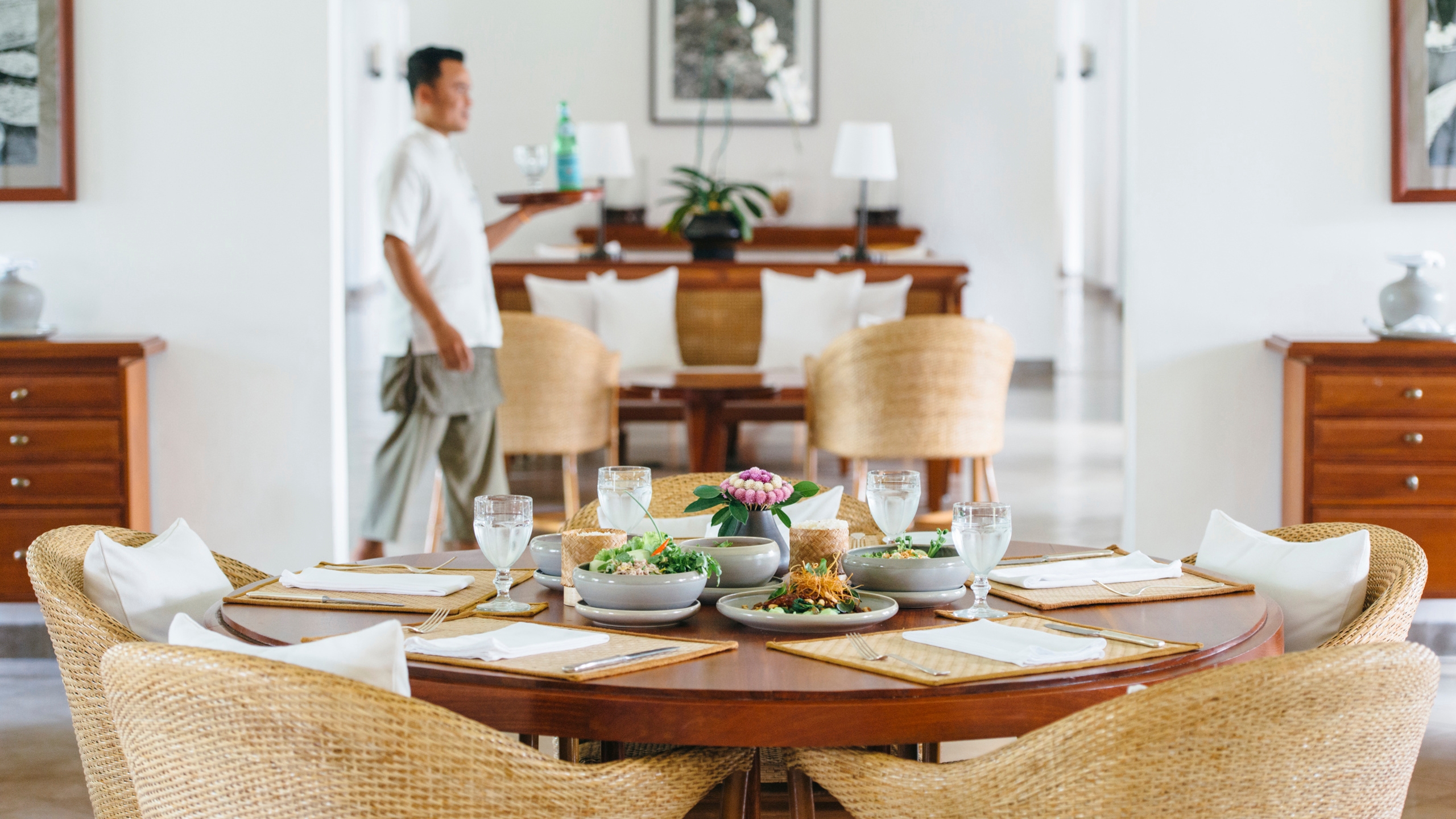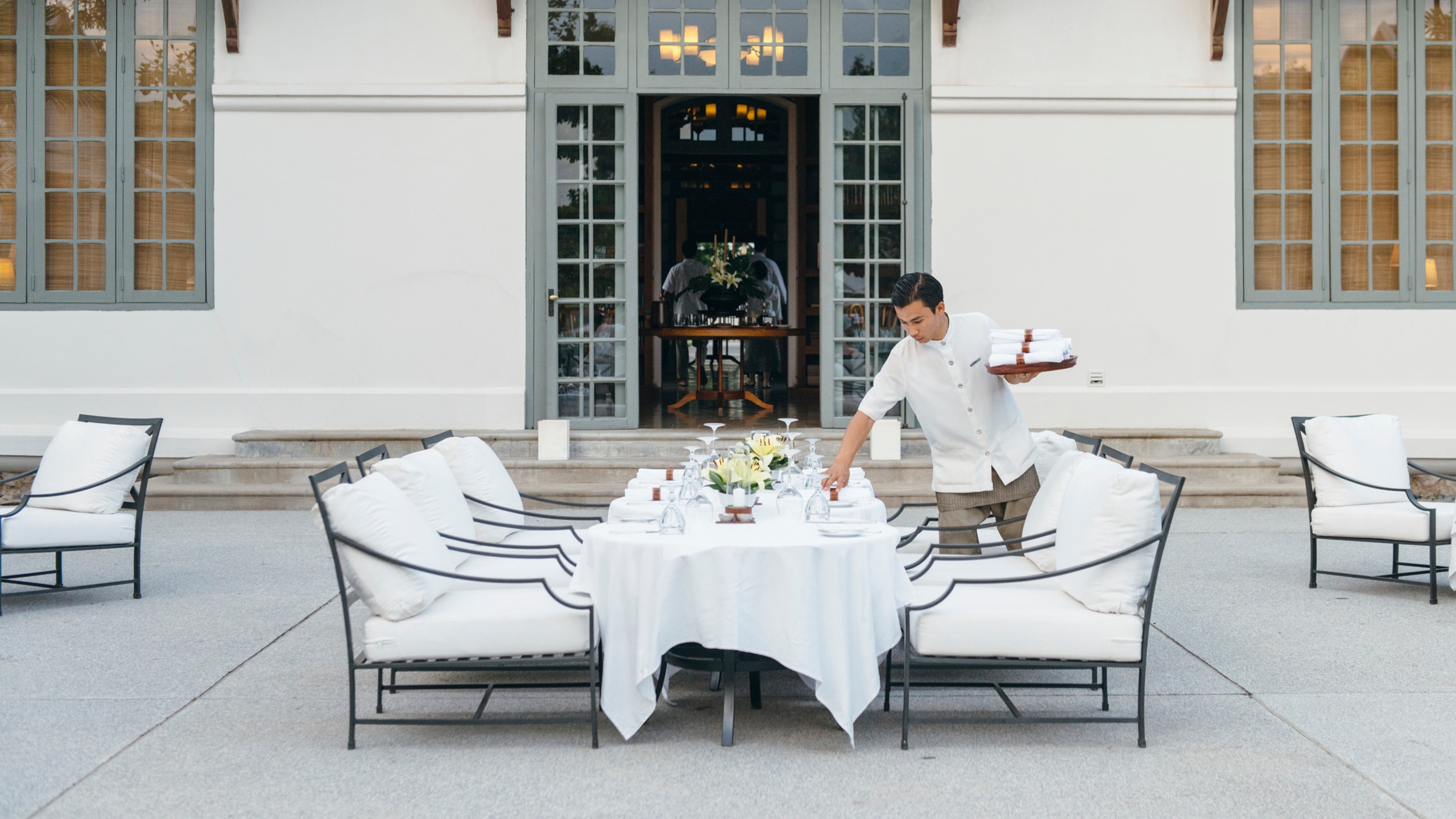 The atmosphere is one of understated elegance and grace, never better demonstrated by its peaceful gardens, tranquil pool area in a spacious courtyard, and a fragrant frangipani grove. The Dining Room offers French and Laos influence cuisine and offers a fine dining and a relaxed ambience.