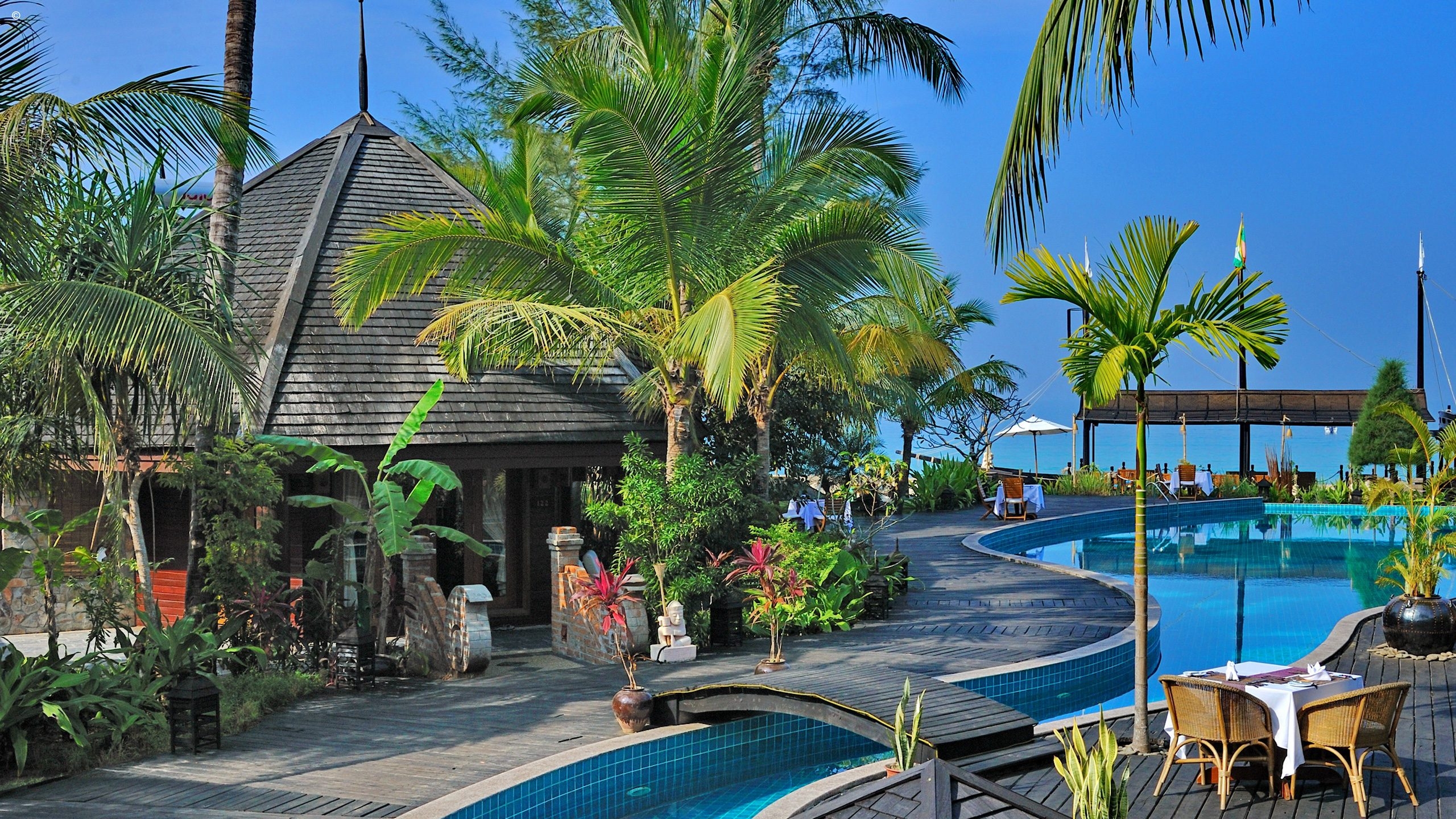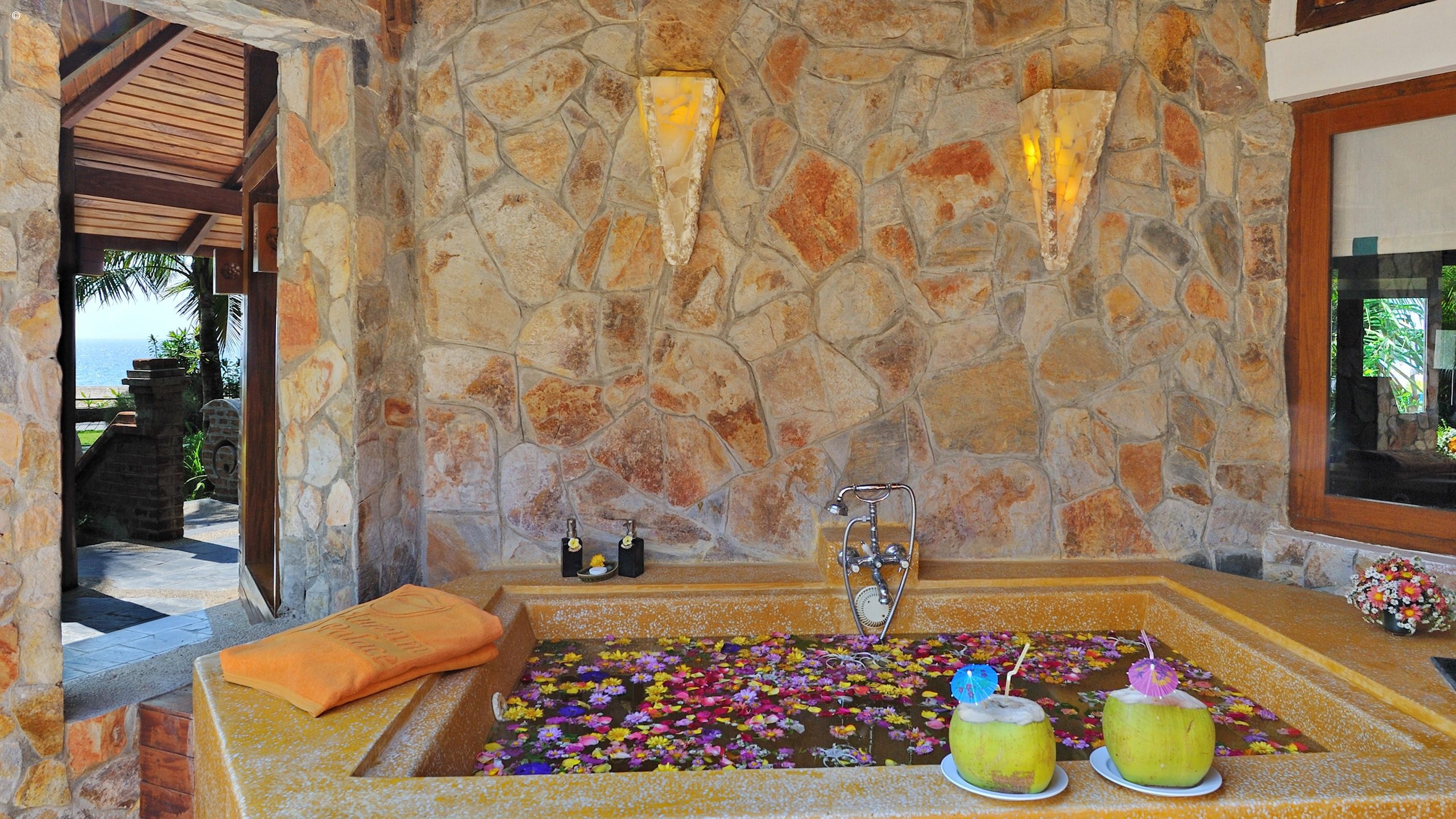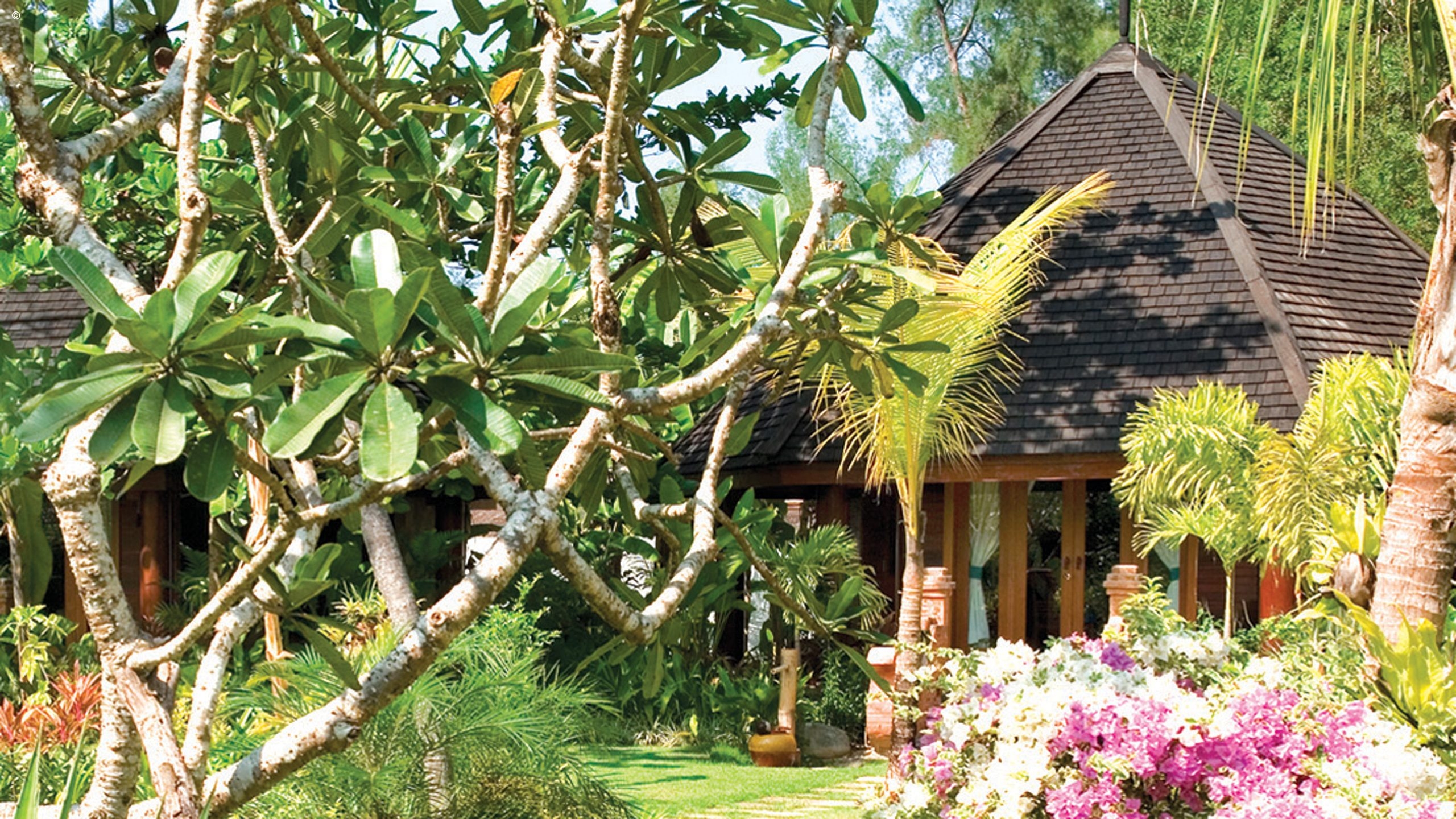 The 42 teak cottages each have private balconies that face either the lush gardens or the glittering sea. There are three categories: Executive, Ocean View and Garden View. All have outdoor jacuzzis, but the Executive cottages go one better with their private pools.