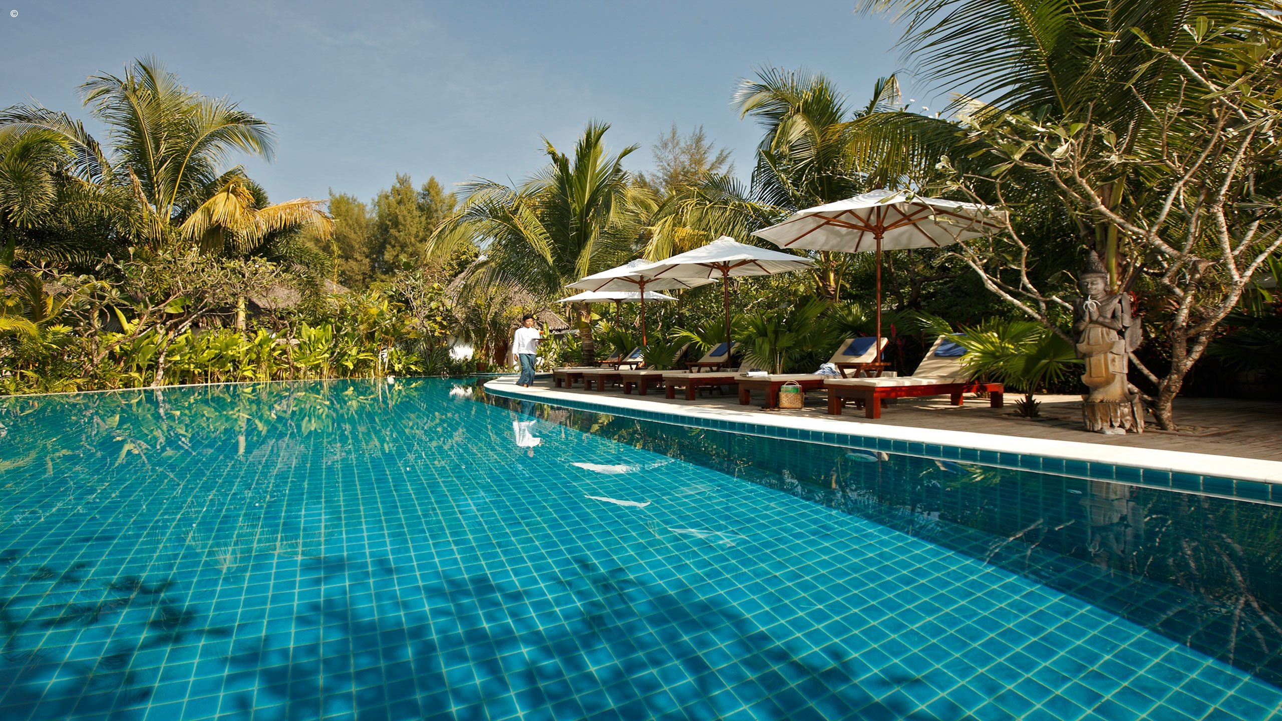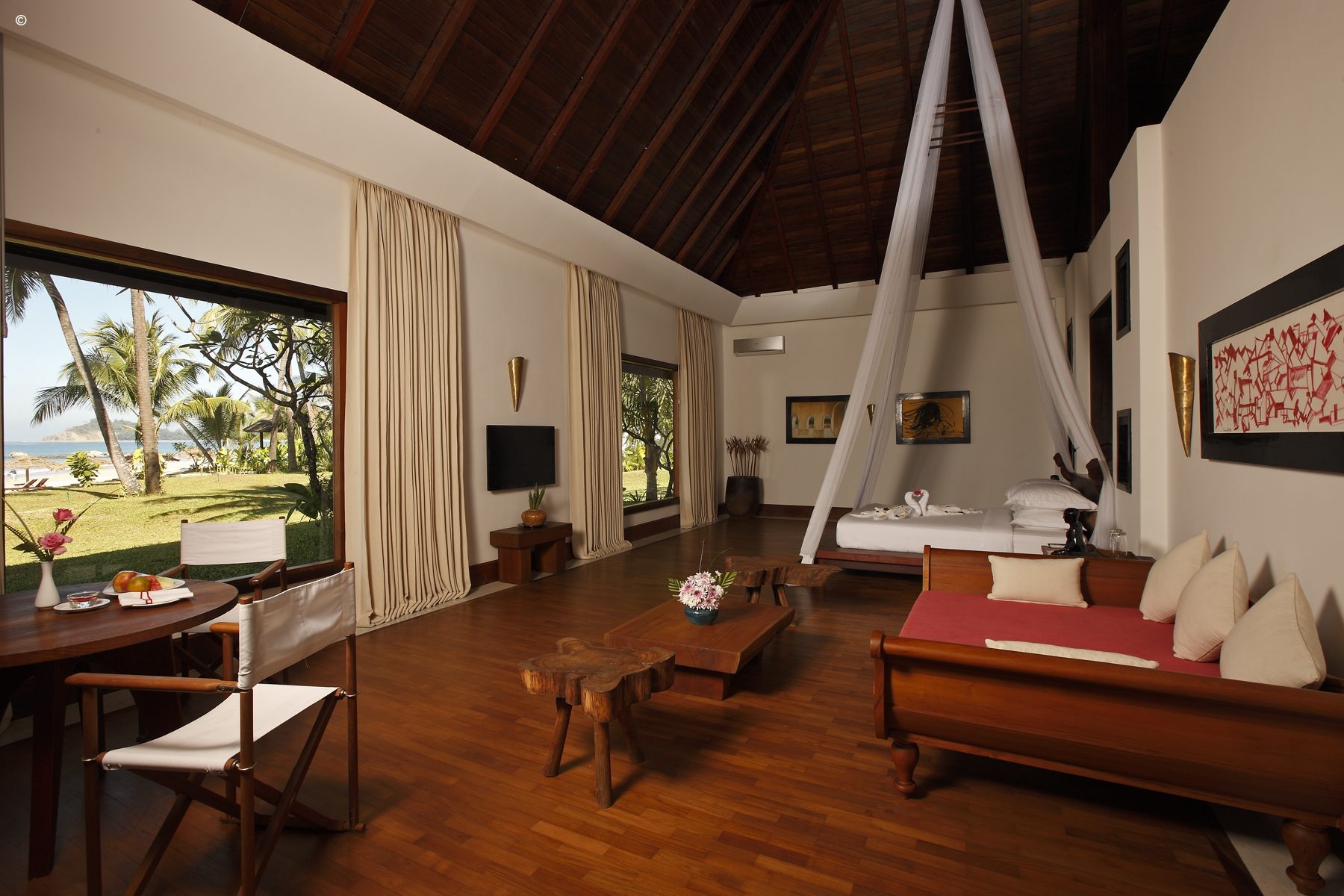 There are 32 air-conditioned villas that make up the accommodation, all with views of the water, and created with teak wood and marble. Each villa is full of unique antiques and artworks, with four varieties available: some have private plunge pools, whereas others are sat right on the beach.