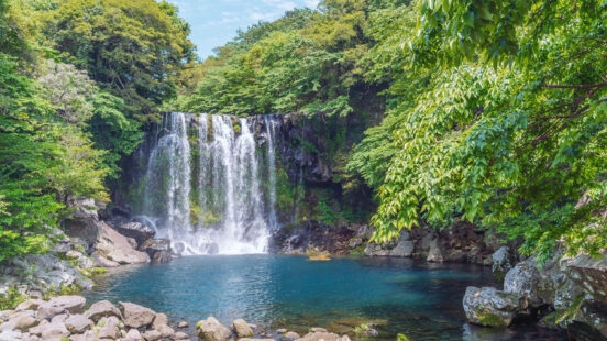 Once you’re back on high ground, the Cheonjiyeon waterfall is a great spot for families. Meaning ‘sky connected with land,’ Cheonjiyeon’s blue falls blend seamlessly into the expansive sky. Families can cool off after a day exploring the underground cave system by walking along a path through subtropical forest before witnessing the impressive falls flow over a 22 metre (7 foot) drop. No matter where you go on Jeju, the whole island is a natural playground that is perfect for little adventurers.