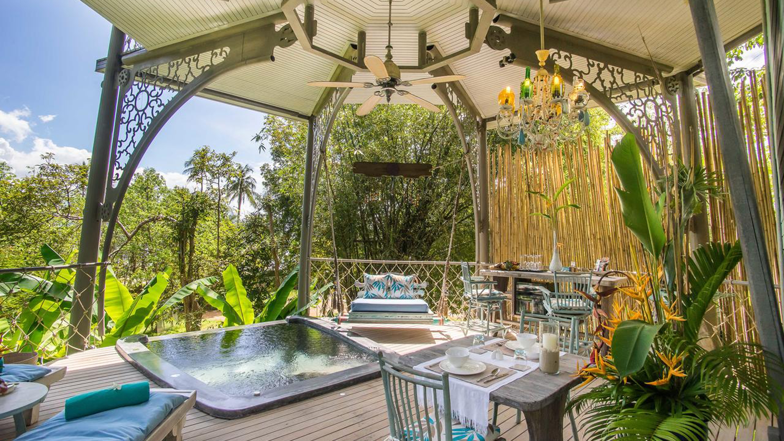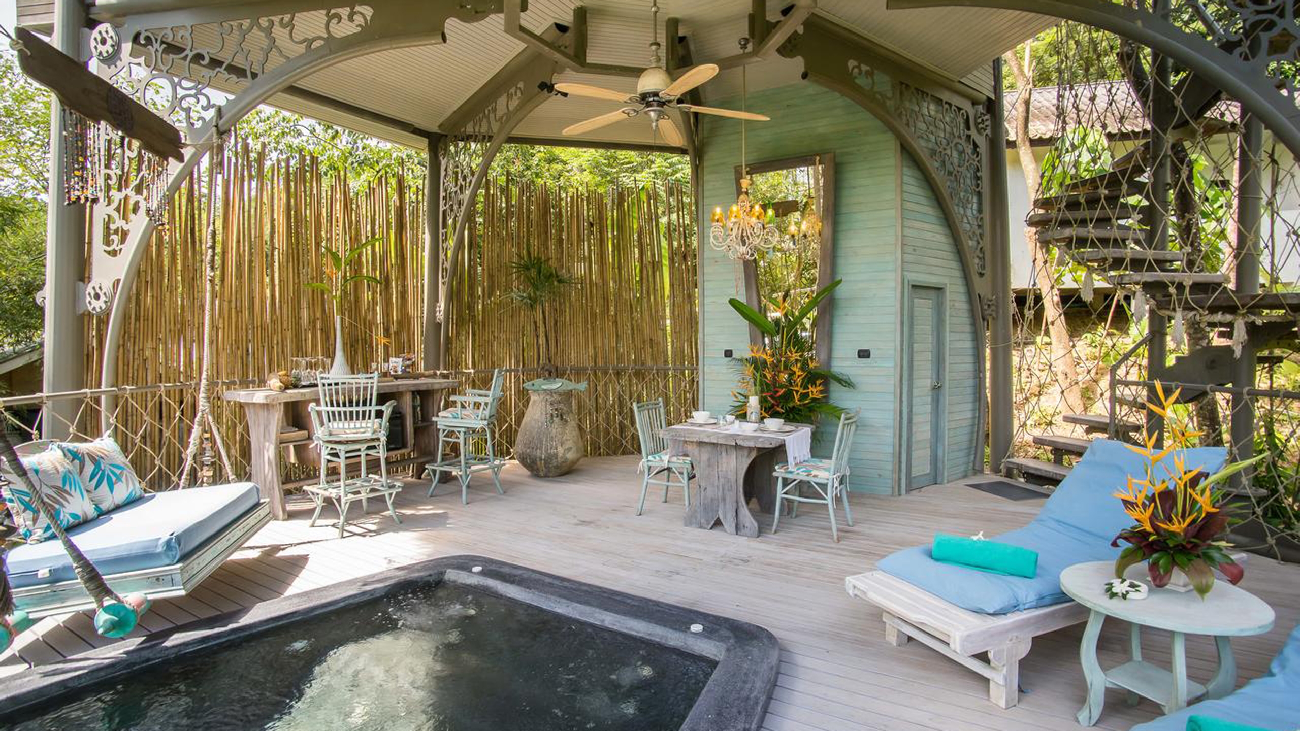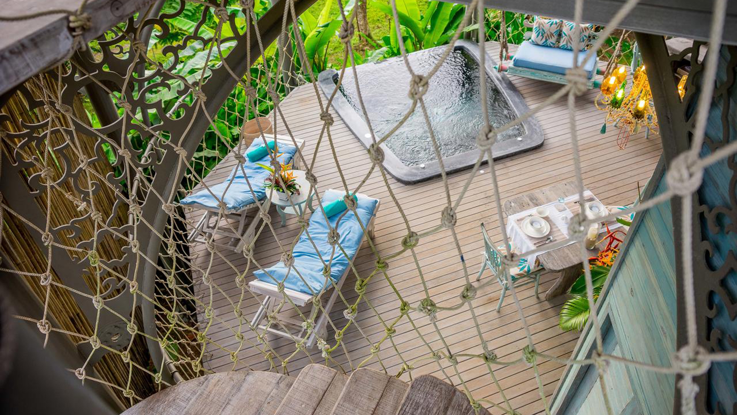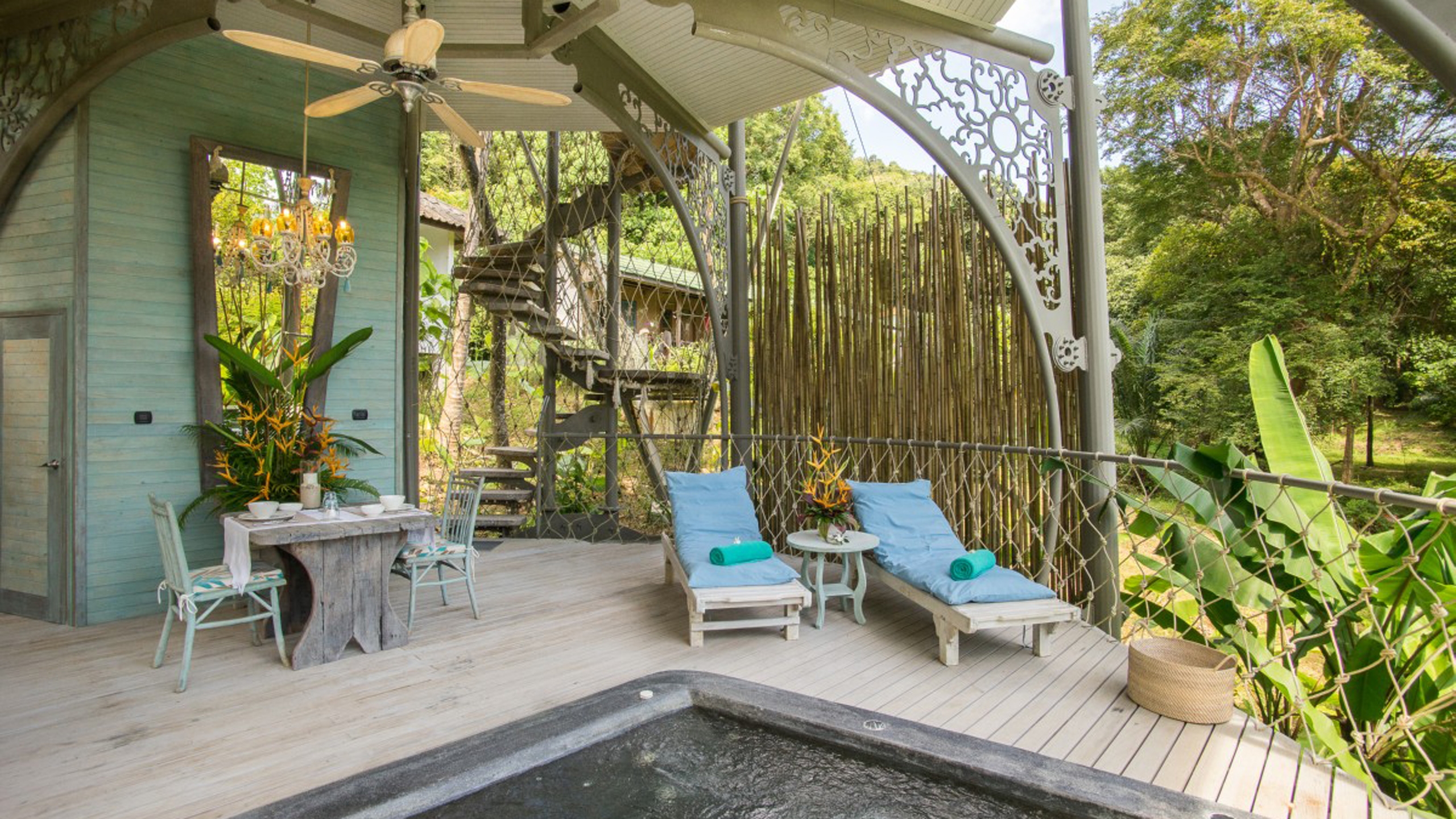 Cross a suspended bridge to reach your duplex treehouse which boasts an open-plan lower floor with a private plunge pool, dining area, personal bar, double swing and day beds. The villas are decorated in a shabby-chic style, incorporating colours and textures from the jungle and the sea. Upstairs, in the bedroom, a balcony looks out over the treetops. Soak in a hammock bath or refresh yourself in a jungle shower.